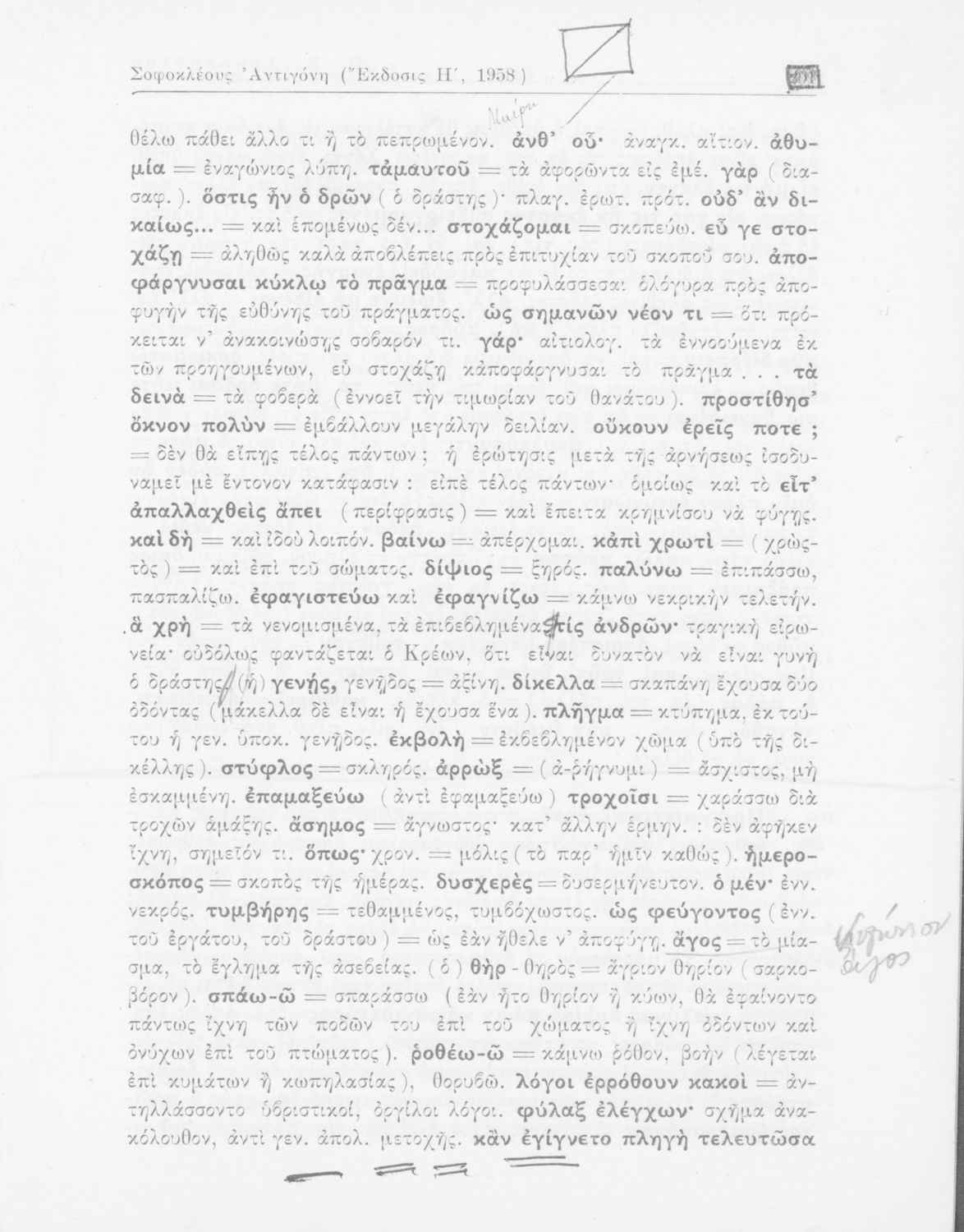 Σχολικό εγχειρίδιο Αρχαίων Ελληνικών της ΣΤ΄ Γυμνασίου. Το βιβλίο περιέχει δύο τραγωδίες του Σοφοκλή, τον Οιδίπους Τύραννο και την Αντιγόνη. Τα έργα αυτά συνοδεύονται από αναλύσεις λεξιλογικές και αναφορικά με
