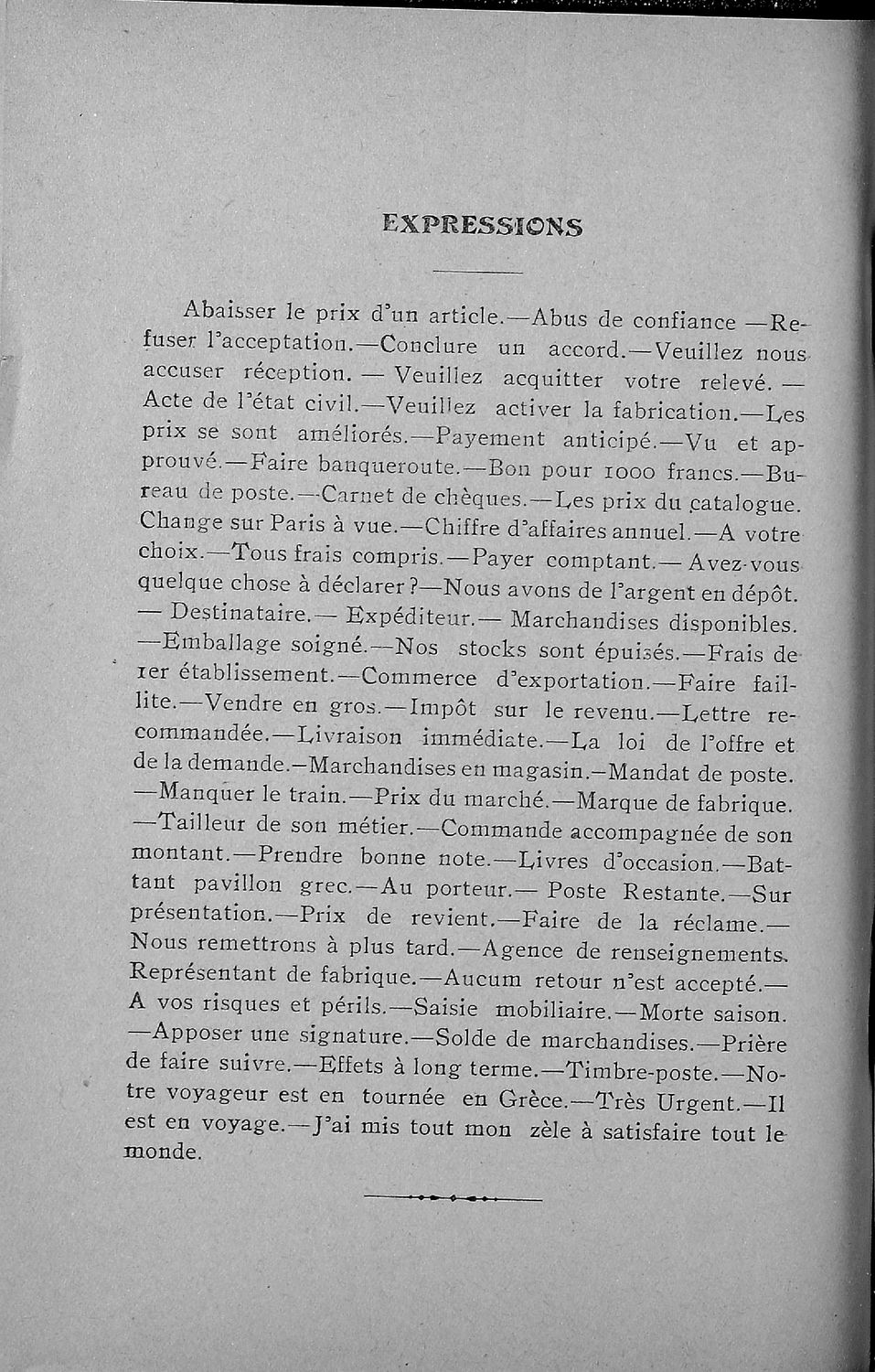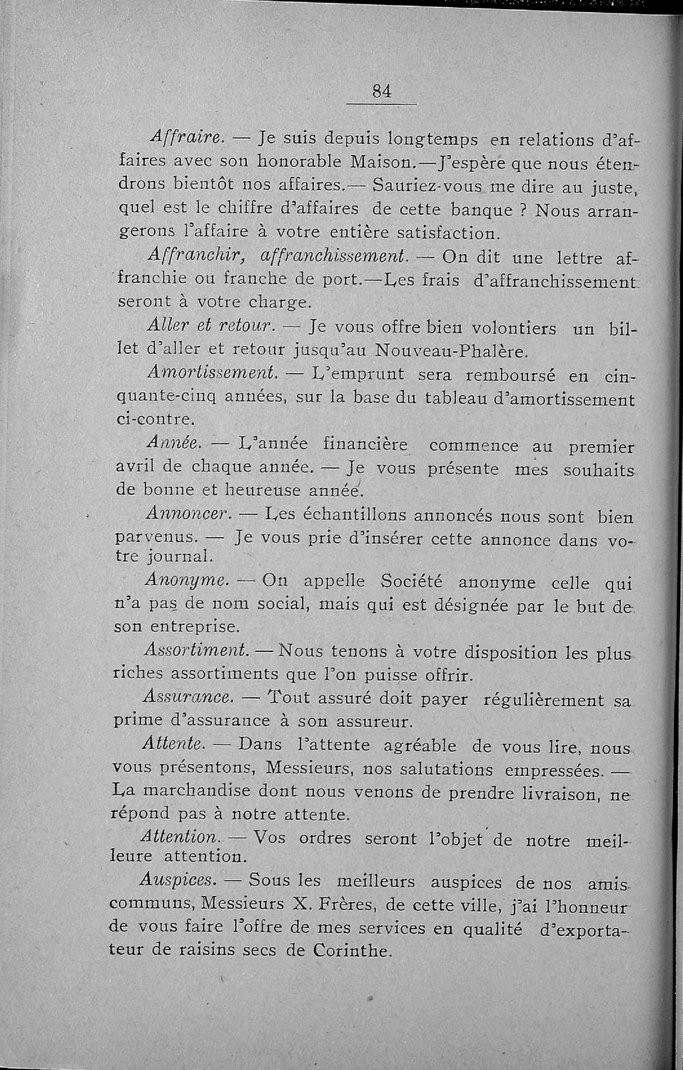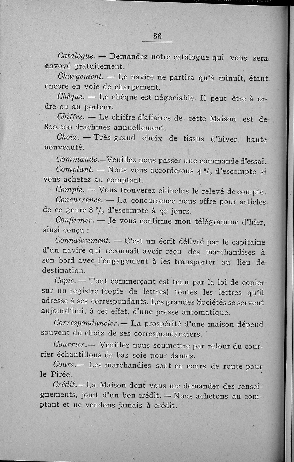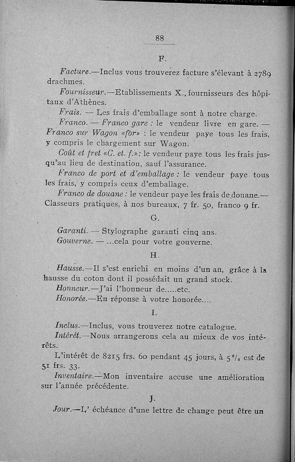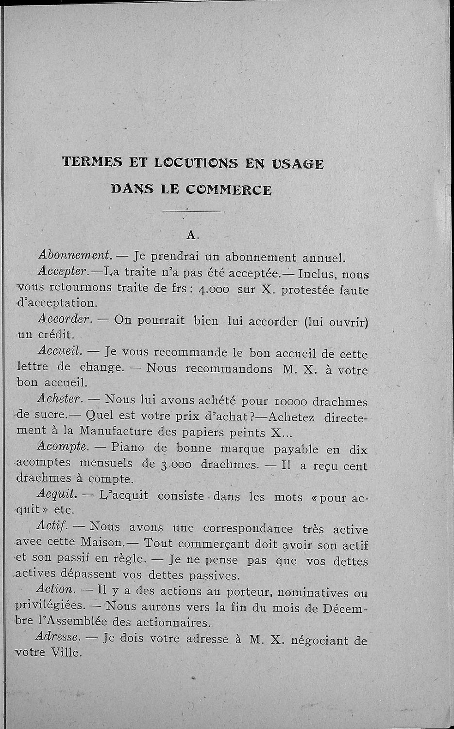 Σχολικό εγχειρίδιο Γαλλικών για τις εμπορικές και πρακτικές σχολές που περιλαμβάνει γραμματική, ασκήσεις και υποδείγματα εμπορικών επιστολών. Ο συγγραφέας ήταν καθηγητής στην Γ’ Δημόσια Εμπορική Σχολή Αθηνών.