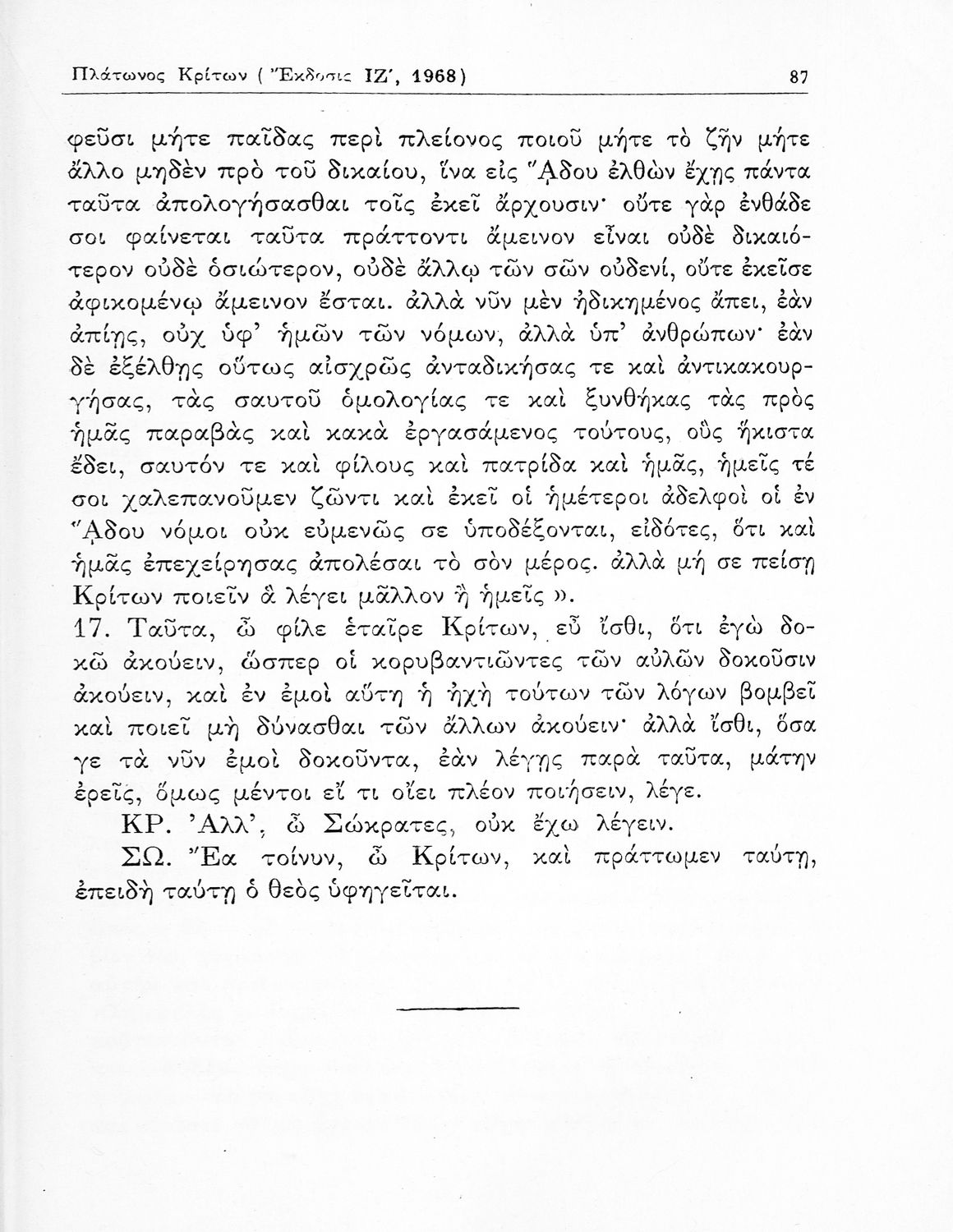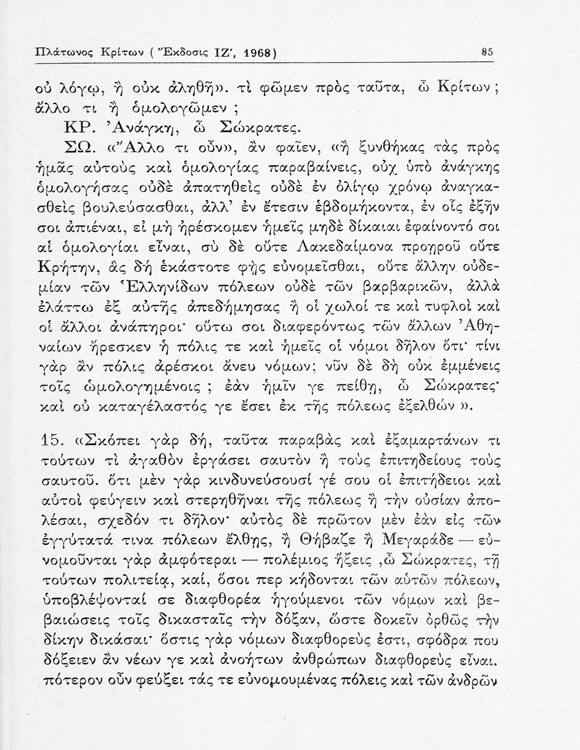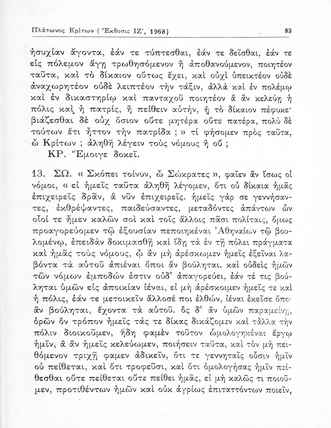 Σχολικό εγχειρίδιο Αρχαίων Ελληνικών Γ΄ Γυμνασίου που περιλαμβάνει το έργο του Πλάτωνα Κρίτων, εισαγωγή, μετάφραση και ερμηνευτικές παρατηρήσεις.