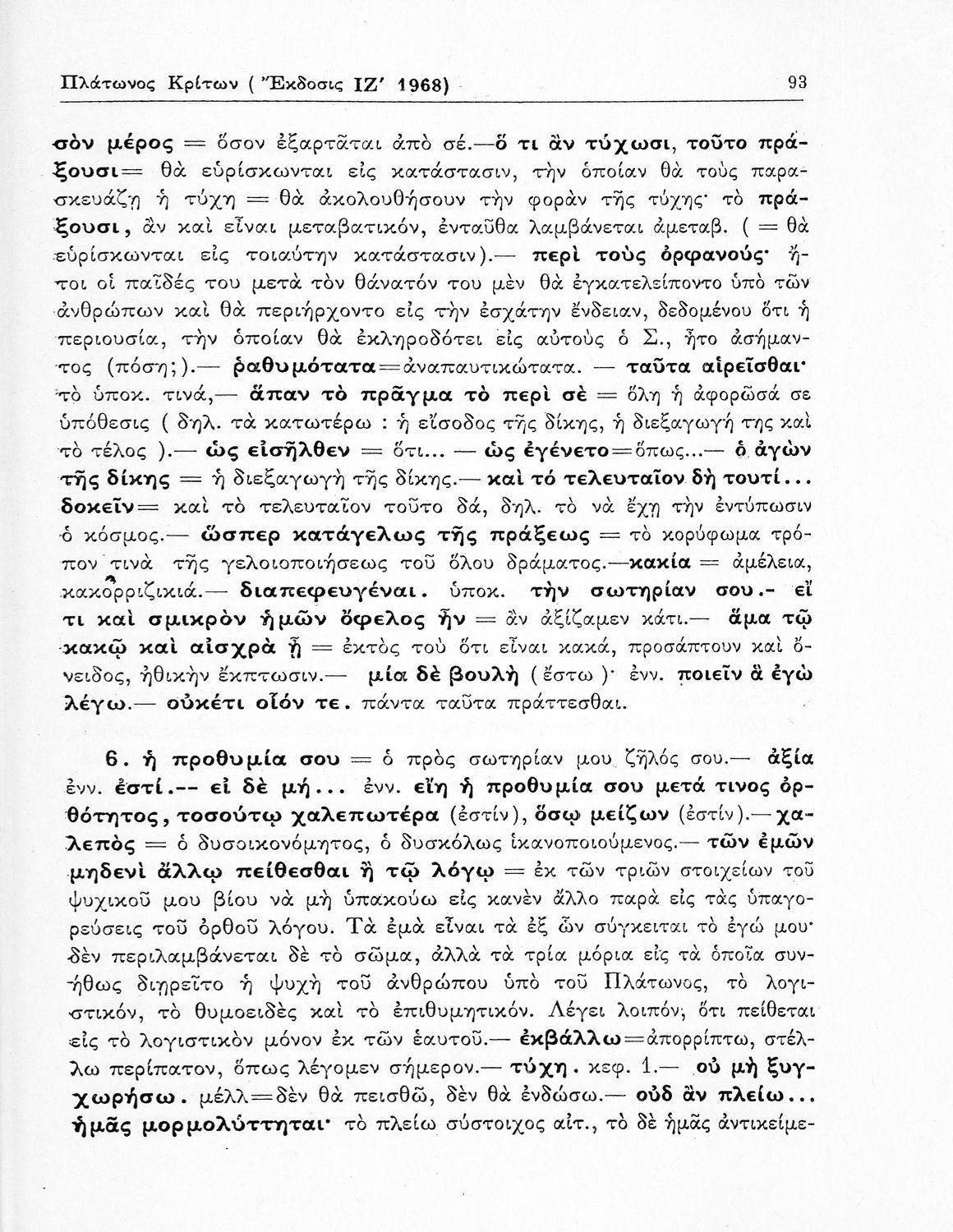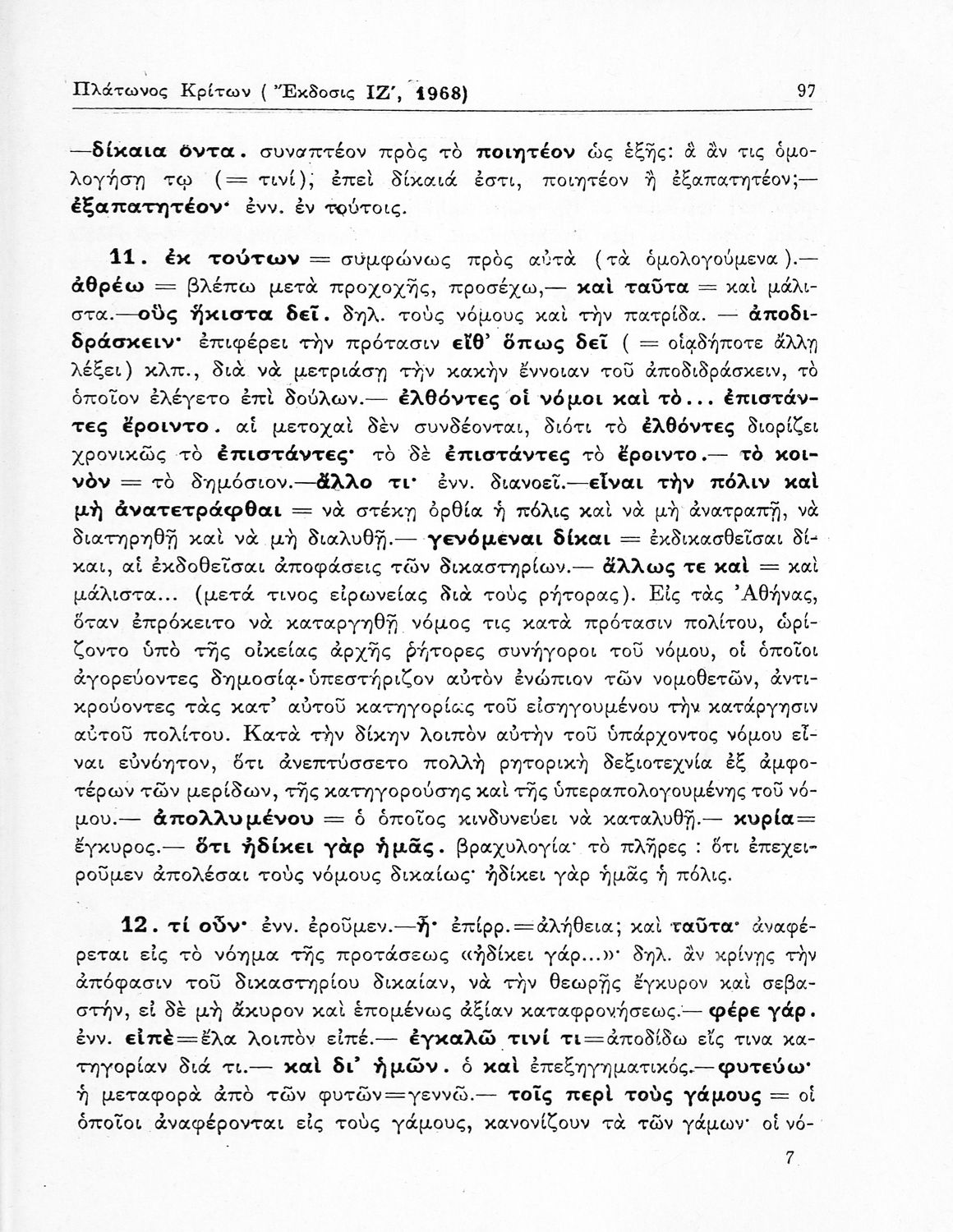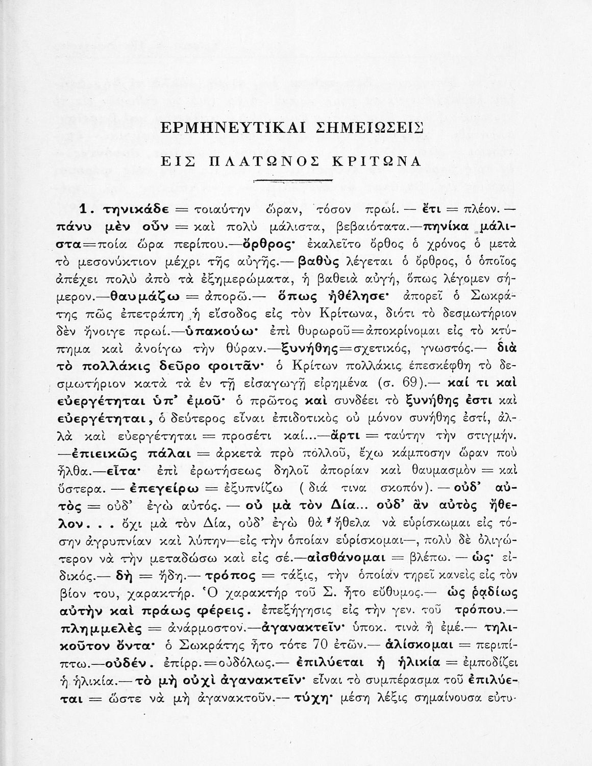 Σχολικό εγχειρίδιο Αρχαίων Ελληνικών από το κείμενο του Πλάτωνα. Περιέχονται ερμηνευτικά σχόλια του συγγραφέα στη καθαρεύουσα. Απεικονίζεται το σύμβολο της Επταετίας.