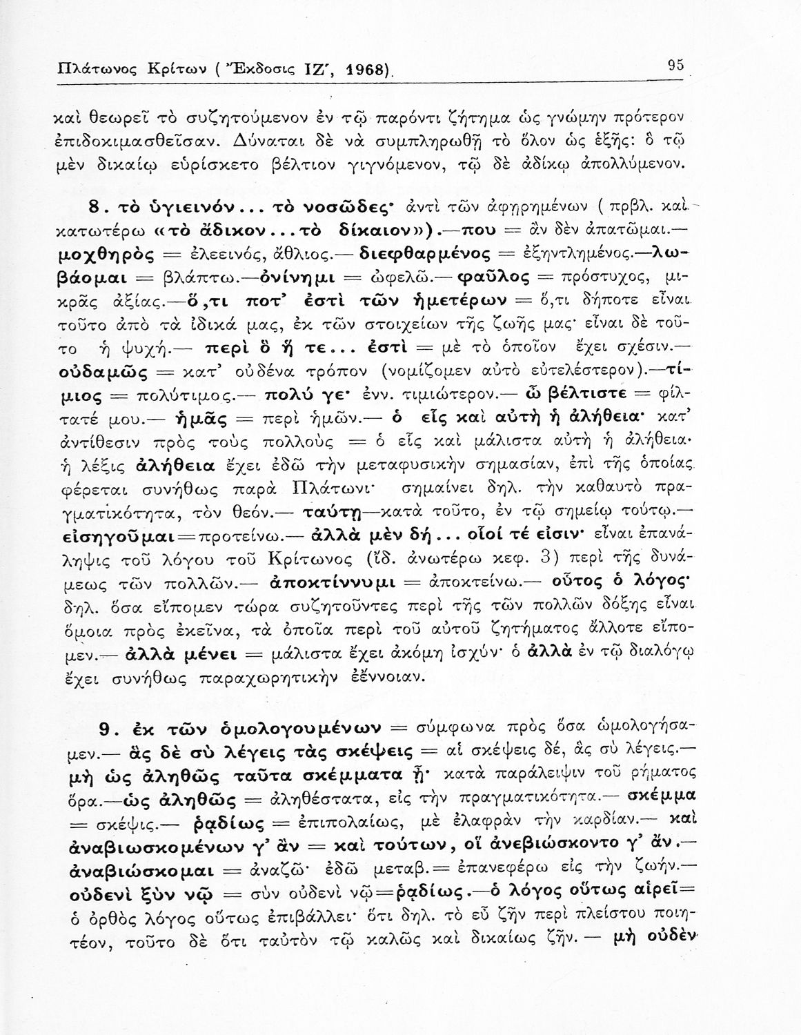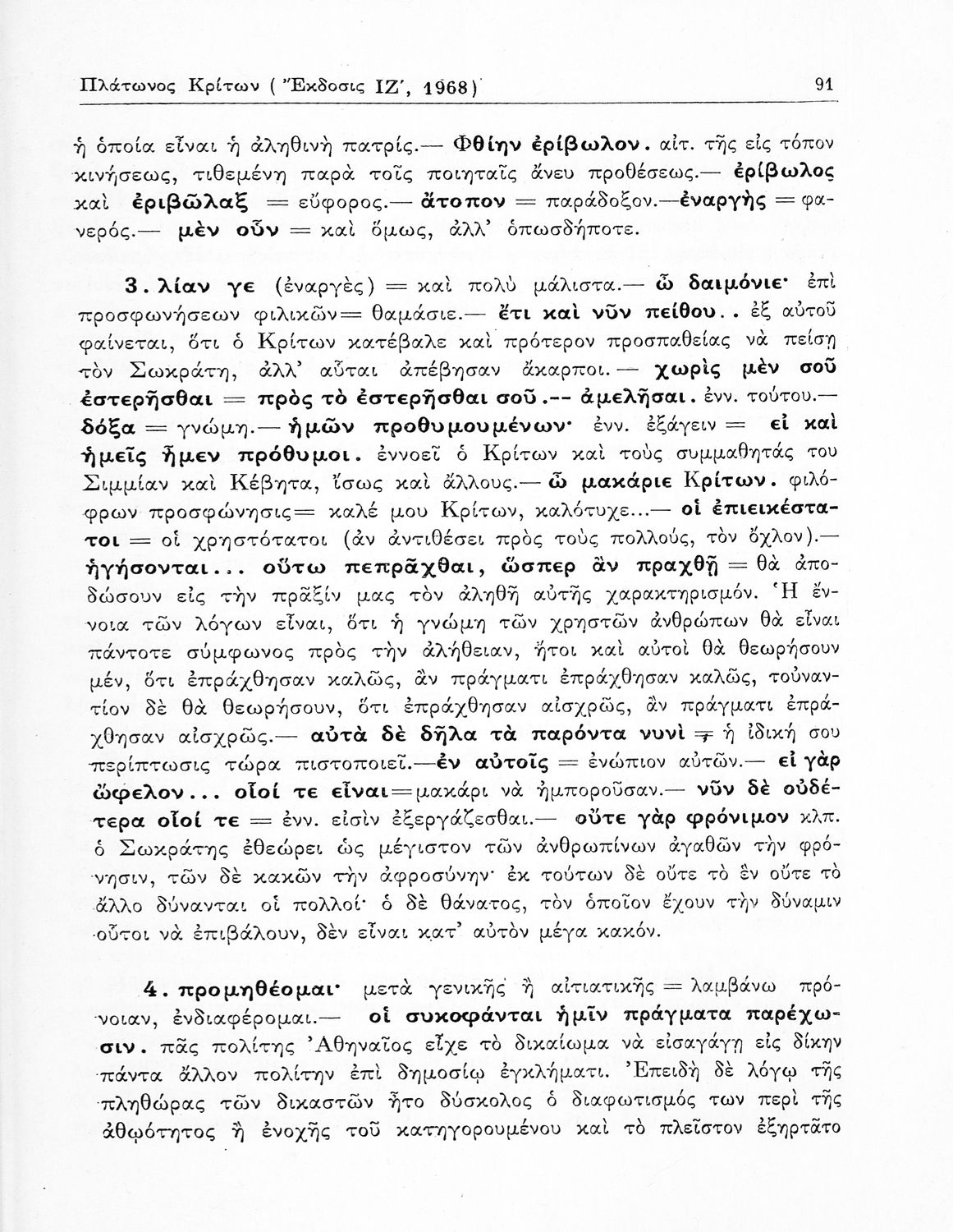 Σχολικό εγχειρίδιο Αρχαίων Ελληνικών που περιλαμβάνει έργο του Πλάτωνα και σημειώσεις του συγγραφέα. Τα κείμενα είναι μετάφραση από το πρωτότυπο. Στο βιβλίο υπάρχει το σύμβολο της επταετίας.