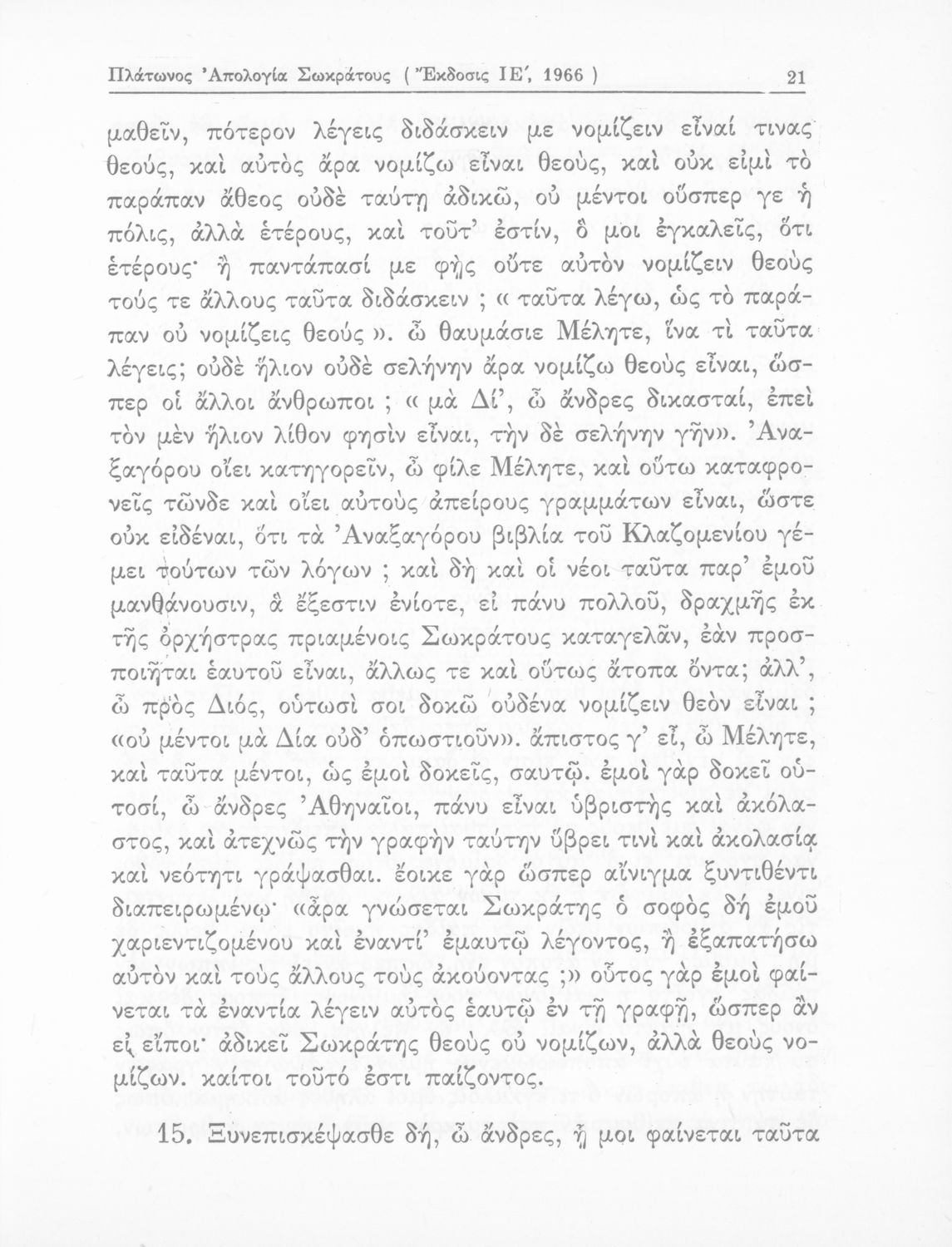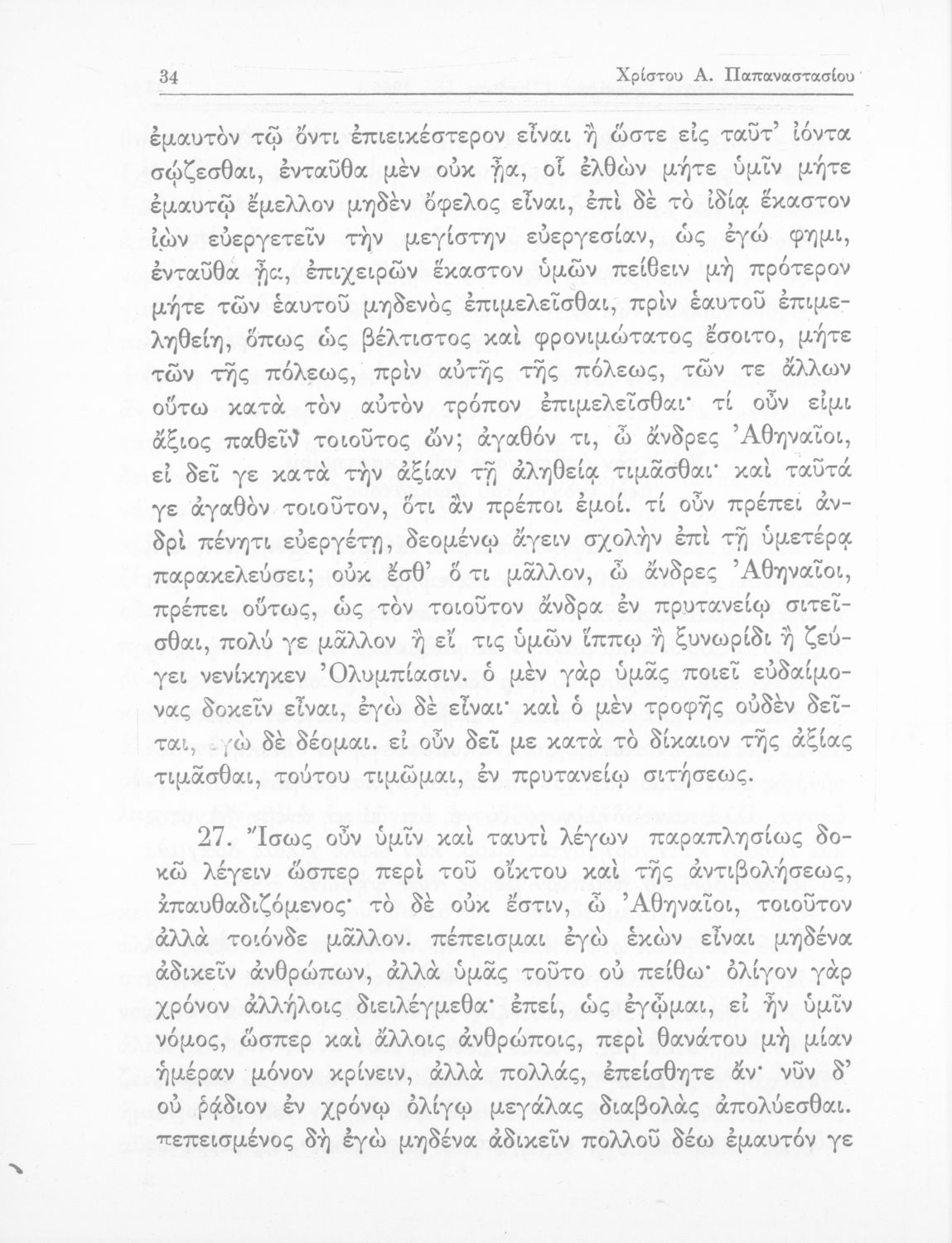 Σχολικό εγχειρίδιο της Β΄ Λυκείου για το μάθημα των Αρχαίων Ελληνικών. Πρόκειται για τα έργα του Πλάτωνα, Απολογία του Σωκράτη και Κρίτων. Περιλαμβάνει ερμηνευτικά σχόλια και λεξιλογικές παρατηρήσεις του συγγραφέα.