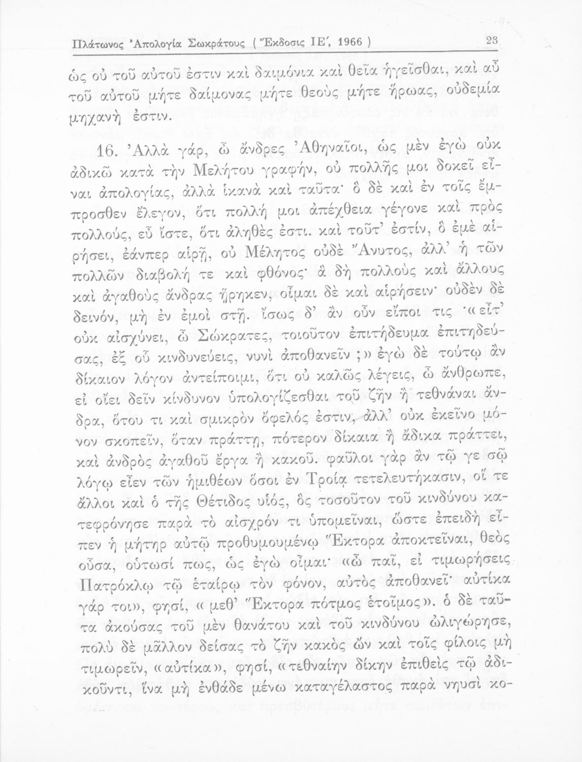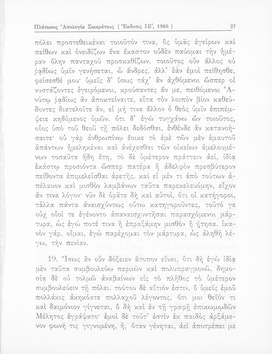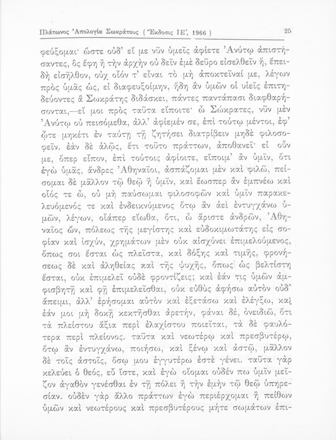 Σχολικό εγχειρίδιο Αρχαίων Ελληνικών από το κείμενο του Πλάτωνα. Περιέχονται ερμηνευτικά σχόλια του συγγραφέα στη καθαρεύουσα. Απεικονίζεται το σύμβολο της Επταετίας.
