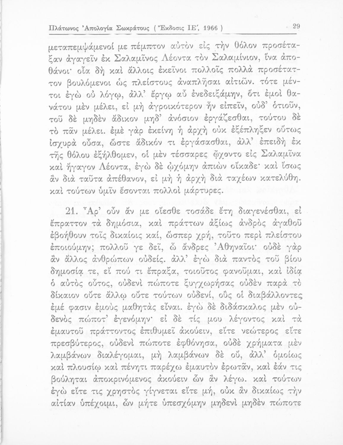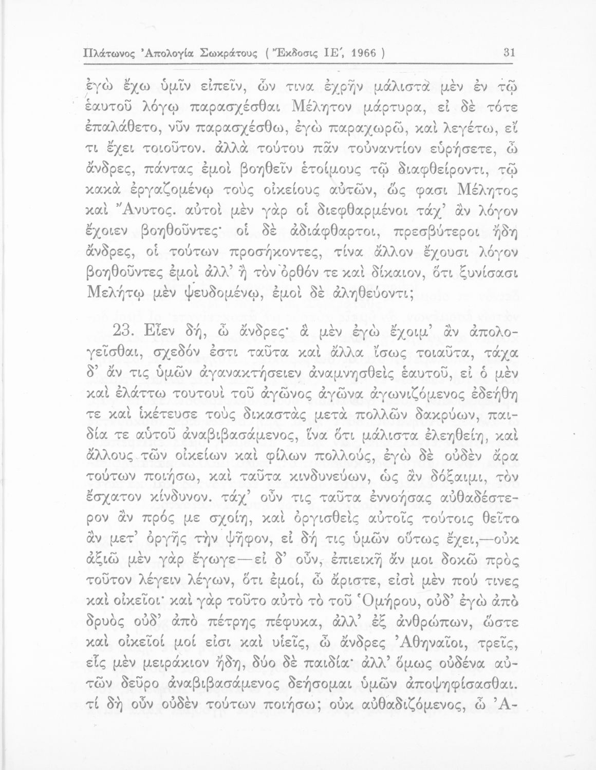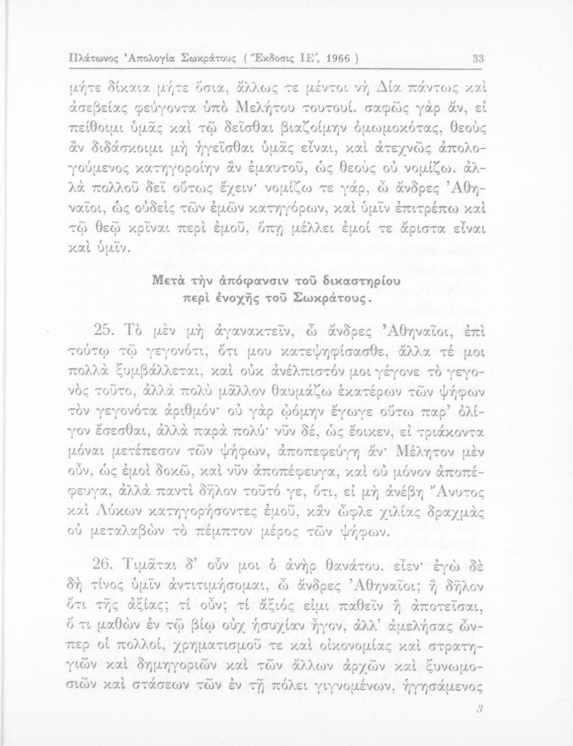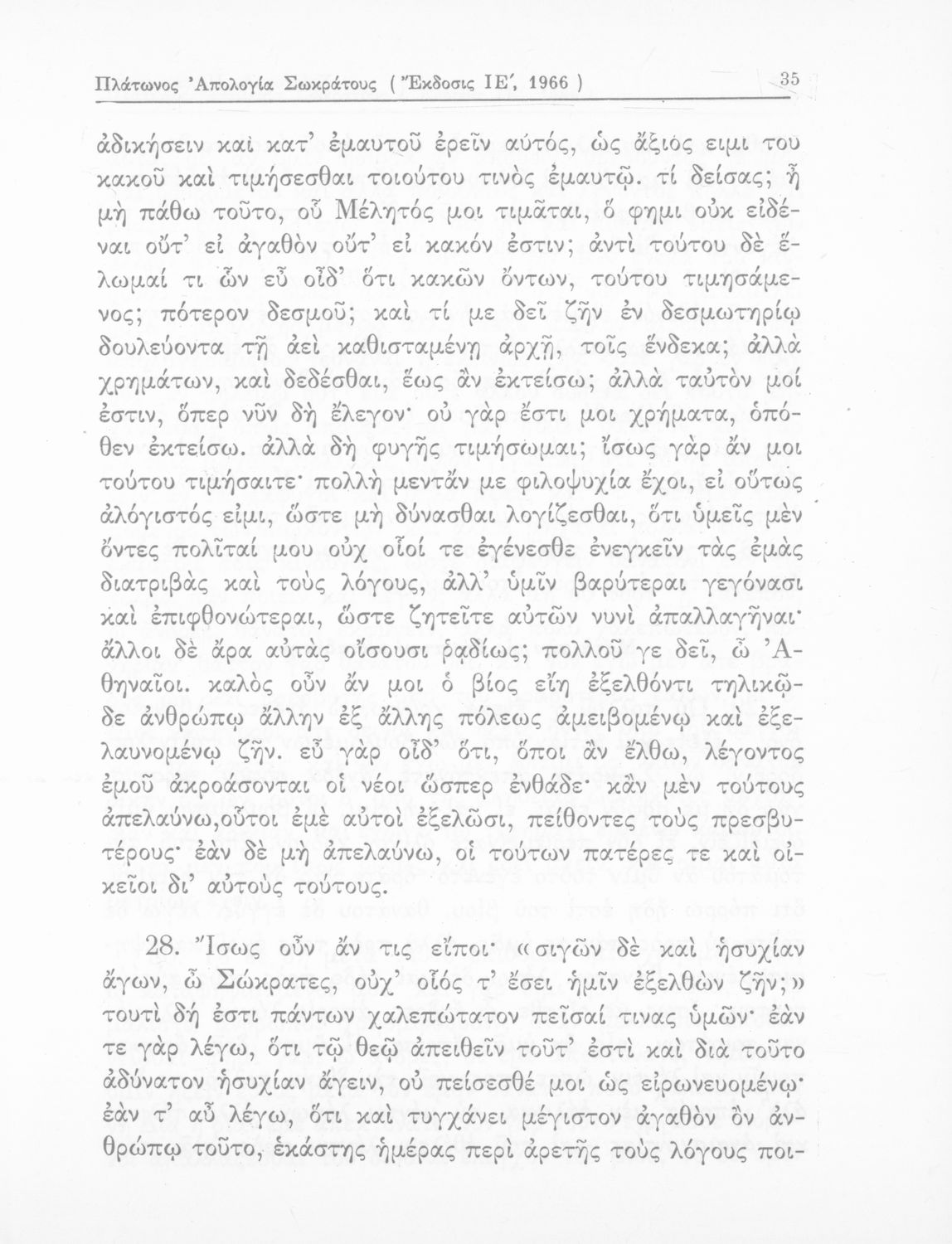Σχολικό εγχειρίδιο Αρχαίων Ελληνικών Γυμνασίου που περιέχει τα έργα του Πλάτωνα Απολογία Σωκράτους και Κρίτων, ερμηνευτικά και πραγματολογικά σχόλια και λεξιλογικές παρατηρήσεις.