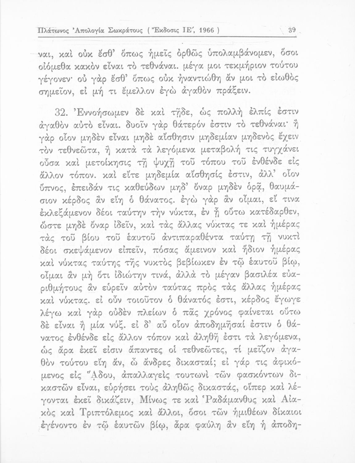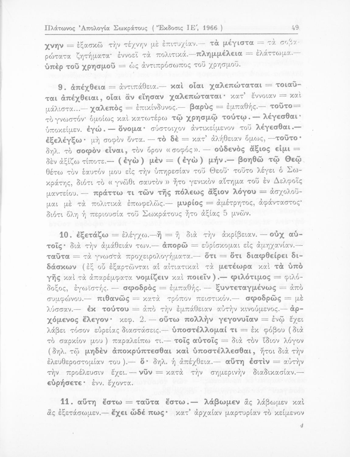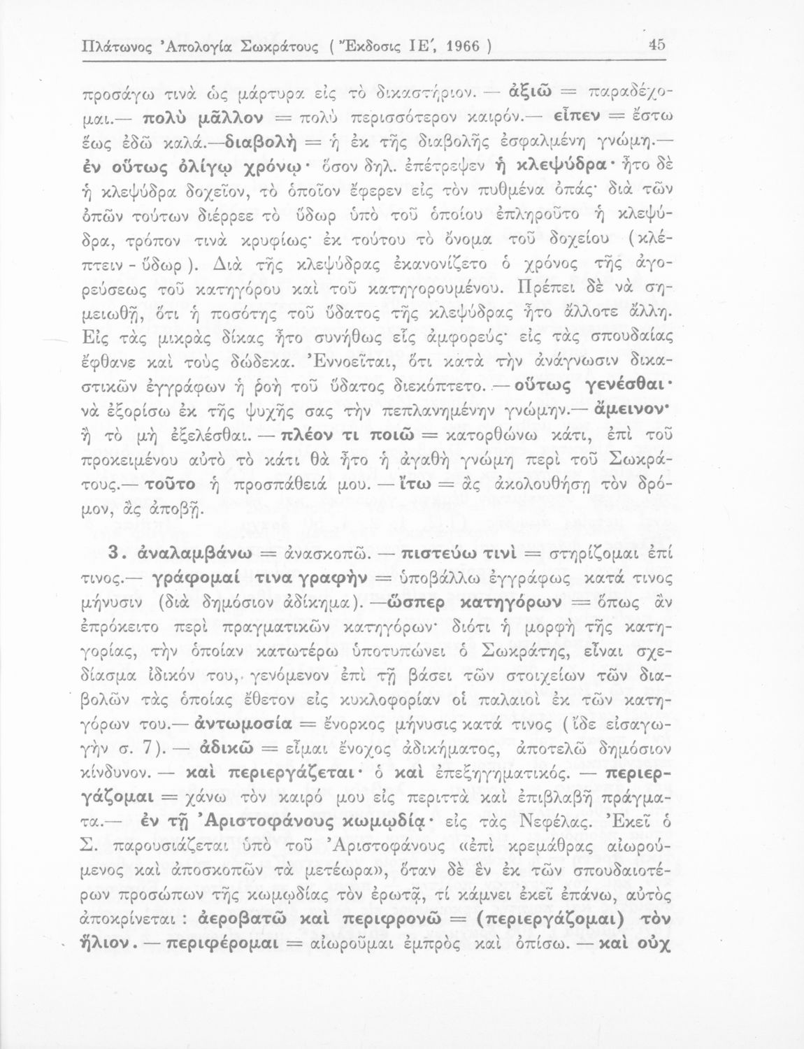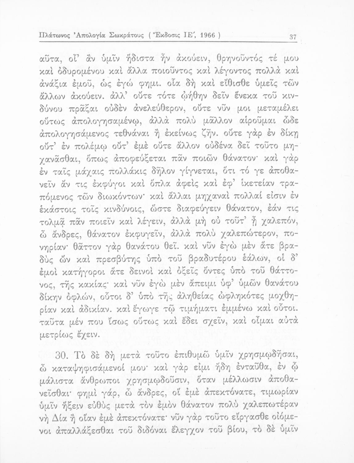 Σχολικό εγχειρίδιο Αρχαίων Ελληνικών Γυμνασίου που περιέχει τα έργα του Πλάτωνα Απολογία Σωκράτους και Κρίτων, ερμηνευτικά και πραγματολογικά σχόλια και λεξιλογικές παρατηρήσεις.
