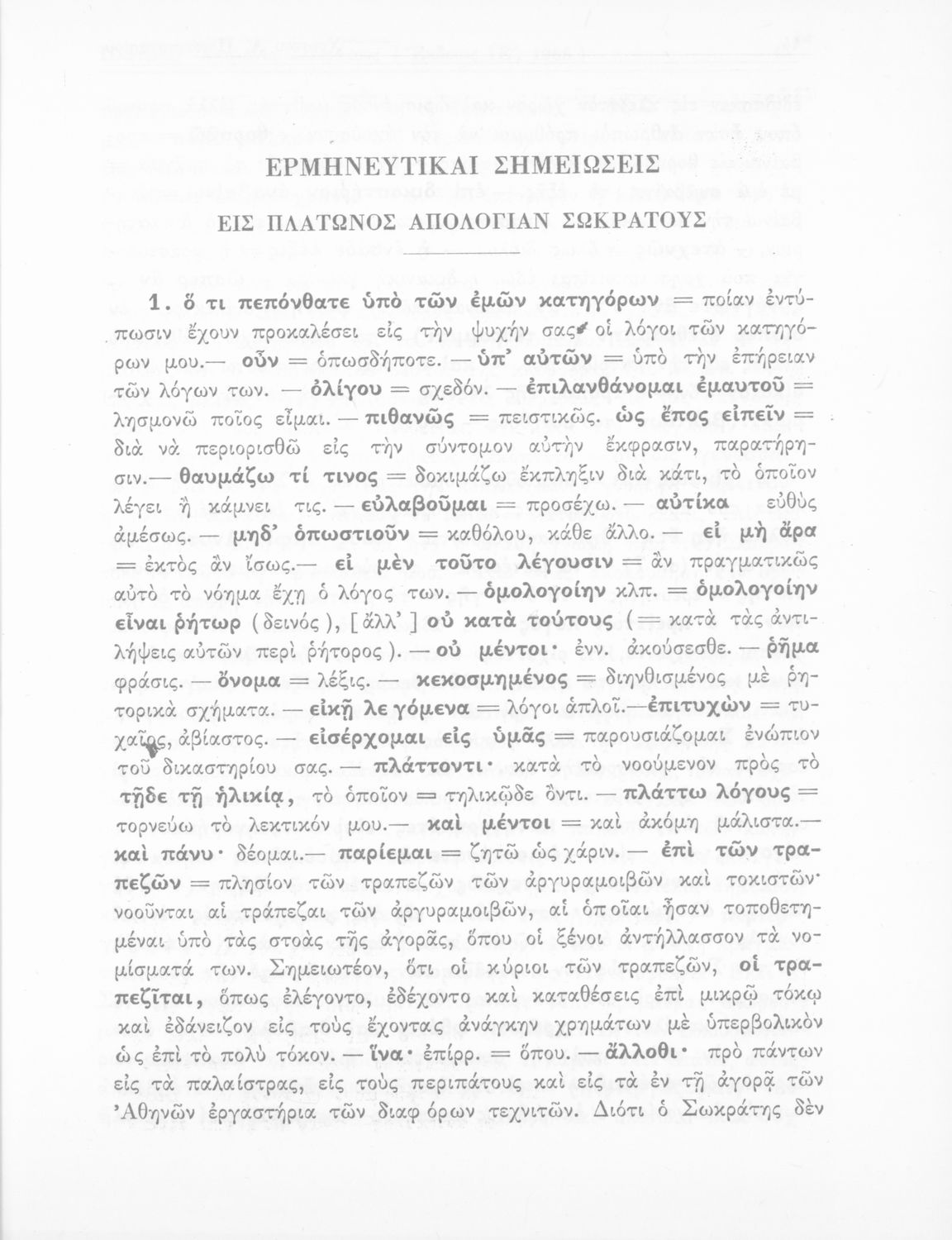 Σχολικό εγχειρίδιο Αρχαίων Ελληνικών από το κείμενο του Πλάτωνα. Περιέχονται ερμηνευτικά σχόλια του συγγραφέα στη καθαρεύουσα. Απεικονίζεται το σύμβολο της Επταετίας.