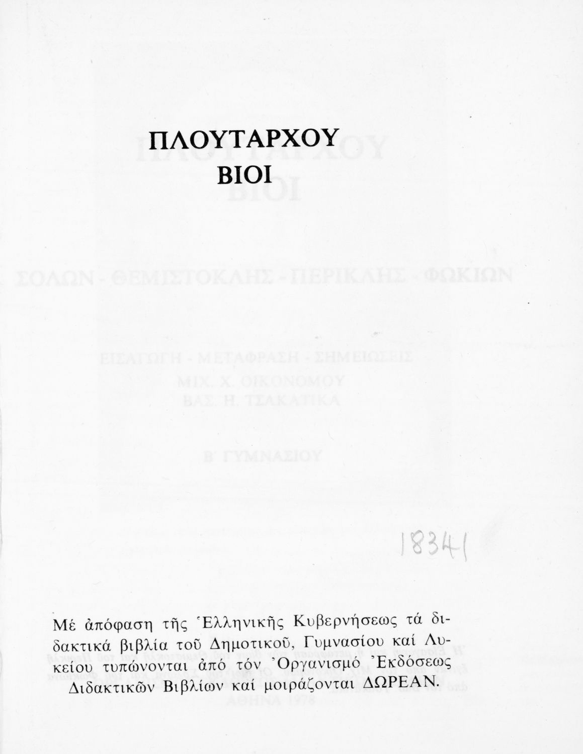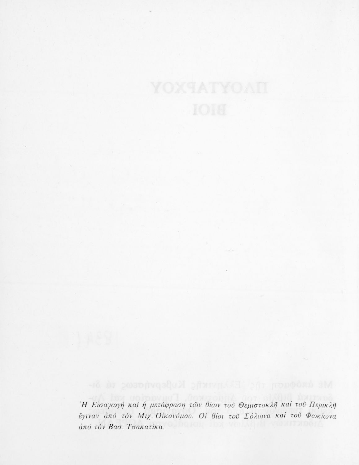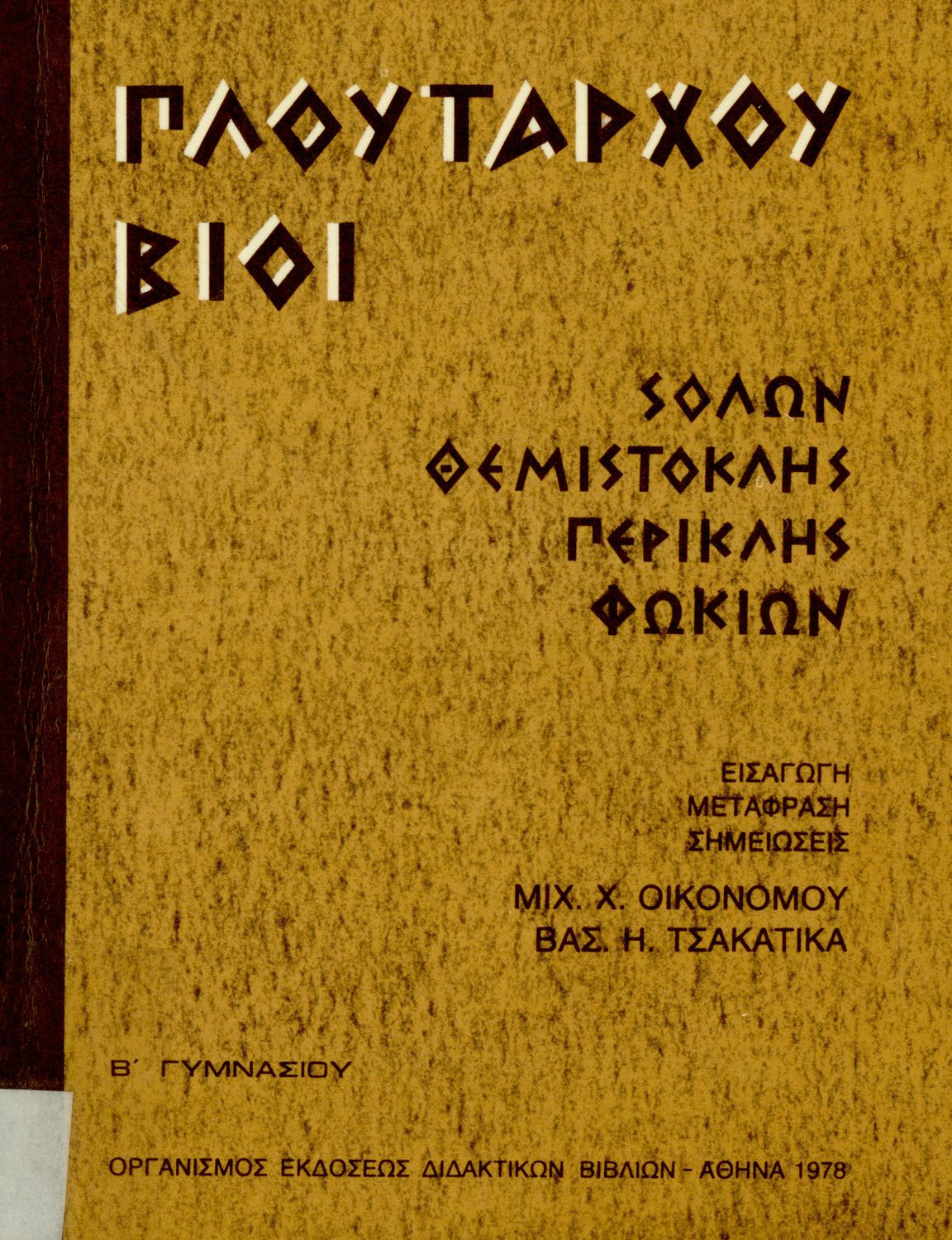 Σχολικό εγχειρίδιο Αρχαίων Ελληνικών. Το βιβλίο περιλαμβάνει εισαγωγή σχετικά με τη ζωή και το έργο του Πλουτάρχου. Η εισαγωγή και η μετάφραση των βίων του Θεμιστοκλή και του Περικλή έγιναν από τον Μιχ. Οικονόμου. Οι βίοι του Σόλωνα και του Φωκίωνα από τον Βασ. Τσακατίκα.