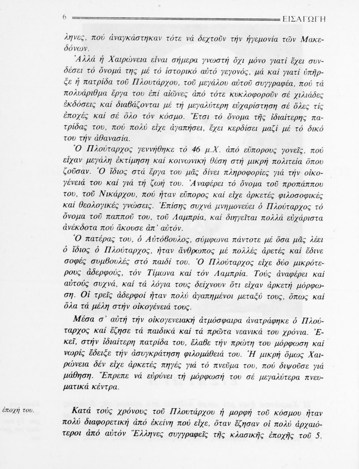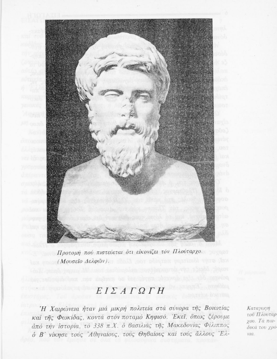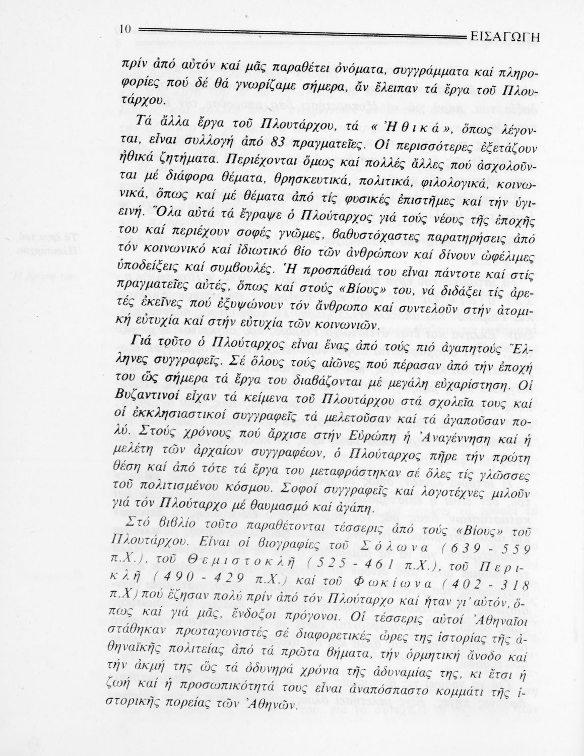 Σχολικό εγχειρίδιο Αρχαίων Ελληνικών. Το βιβλίο περιλαμβάνει εισαγωγή σχετικά με τη ζωή και το έργο του Πλουτάρχου. Η εισαγωγή και η μετάφραση των βίων του Θεμιστοκλή και του Περικλή έγιναν από τον Μιχ. Οικονόμου. Οι βίοι του Σόλωνα και του Φωκίωνα από τον Βασ. Τσακατίκα.