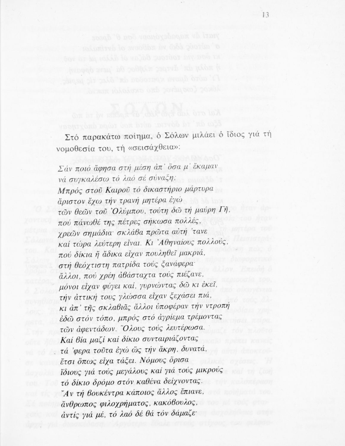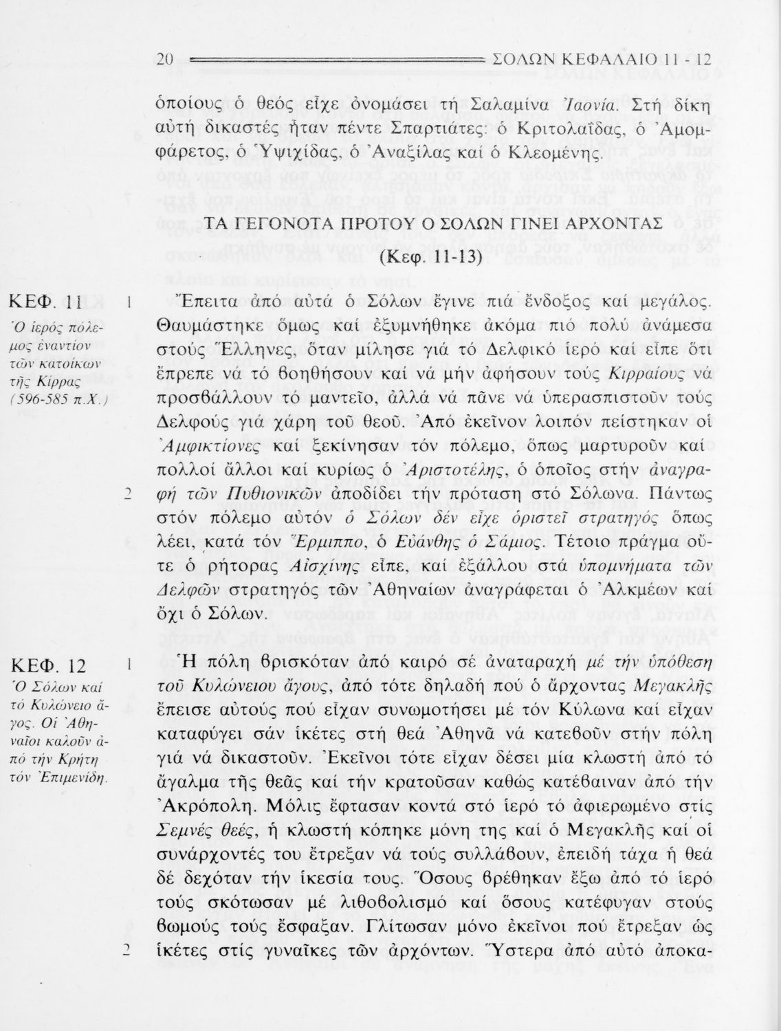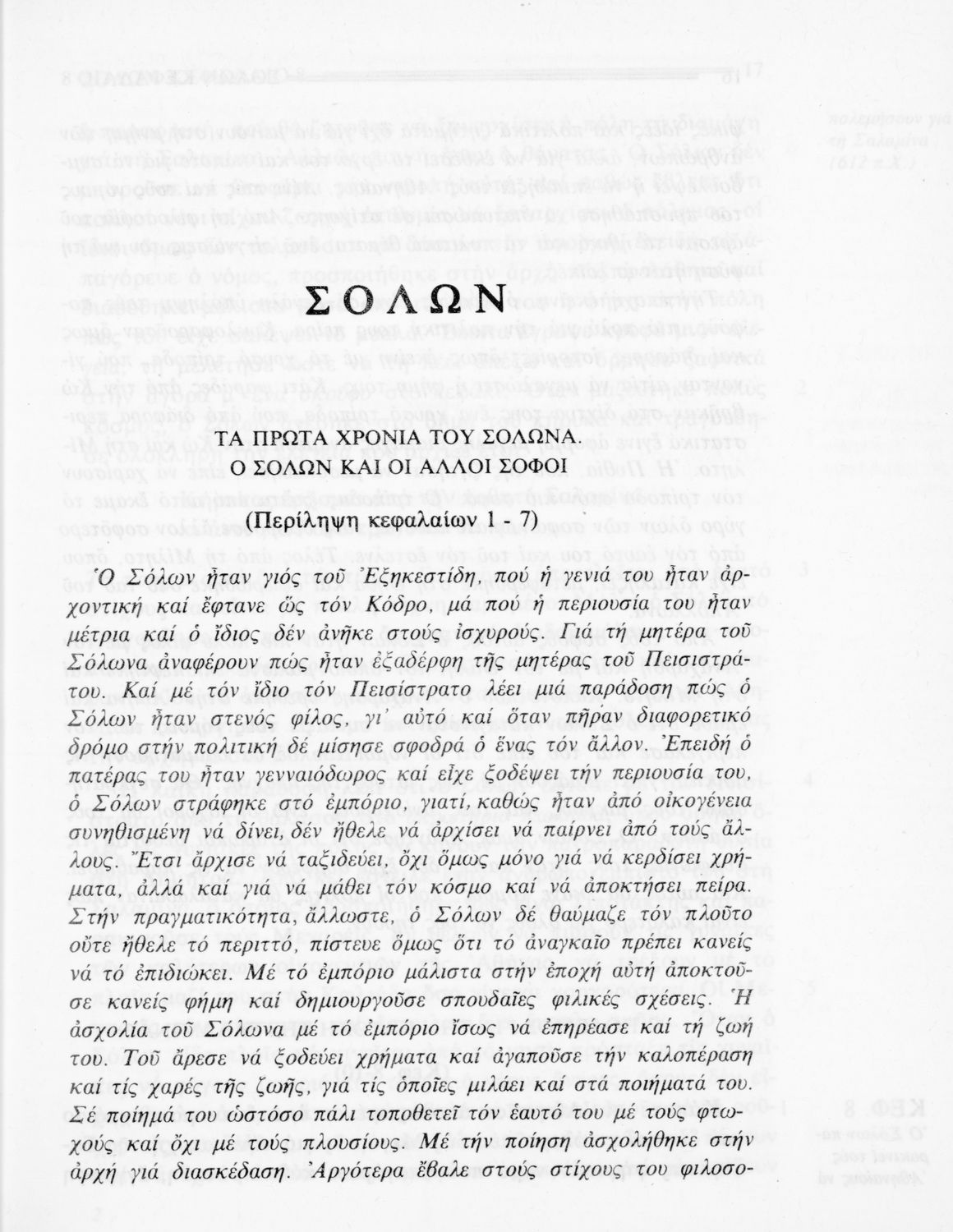 Σχολικό εγχειρίδιο Αρχαίων Ελληνικών. Αρχικά ένα εισαγωγικό σημείωμα αναφέρεται στη ζωή και το έργο του Πλουτάρχου. Ακολουθούν από το έργο του "Παράλληλοι Βίοι", σε μετάφραση, οι βιογραφίες του Σόλωνα, του ...