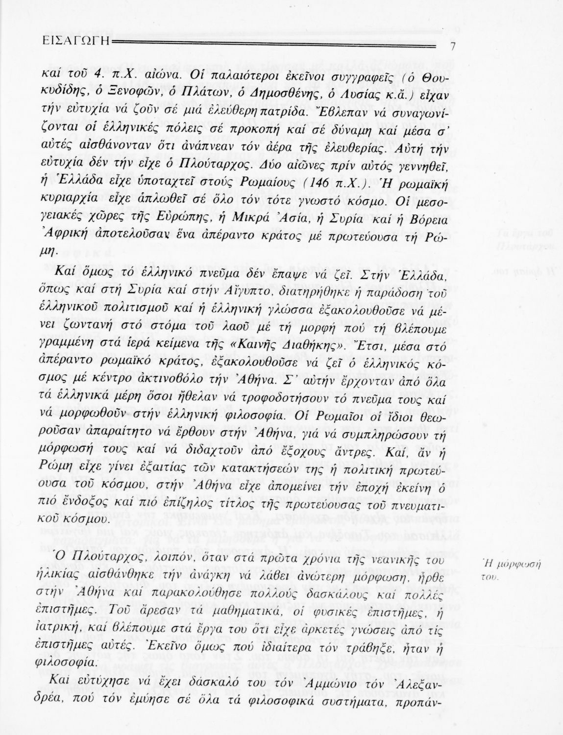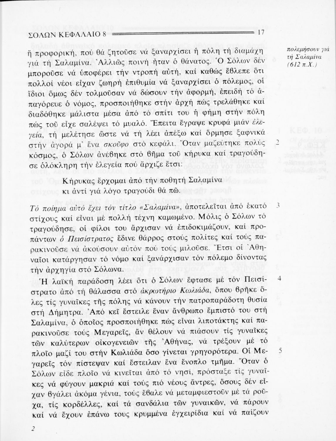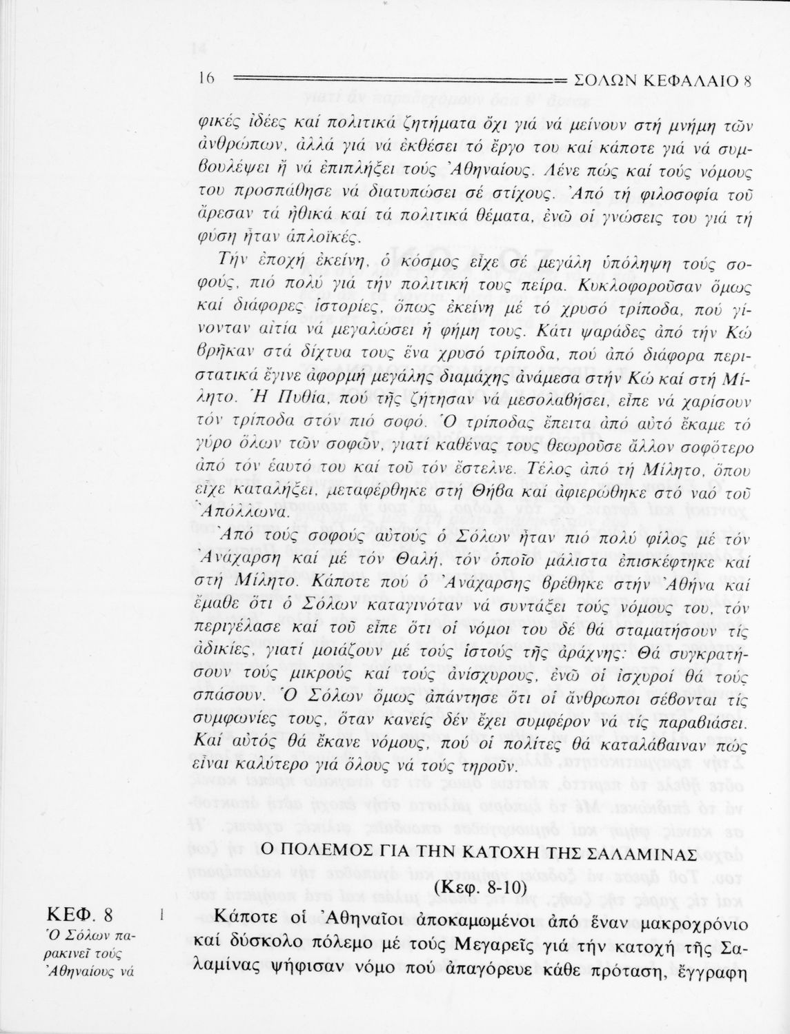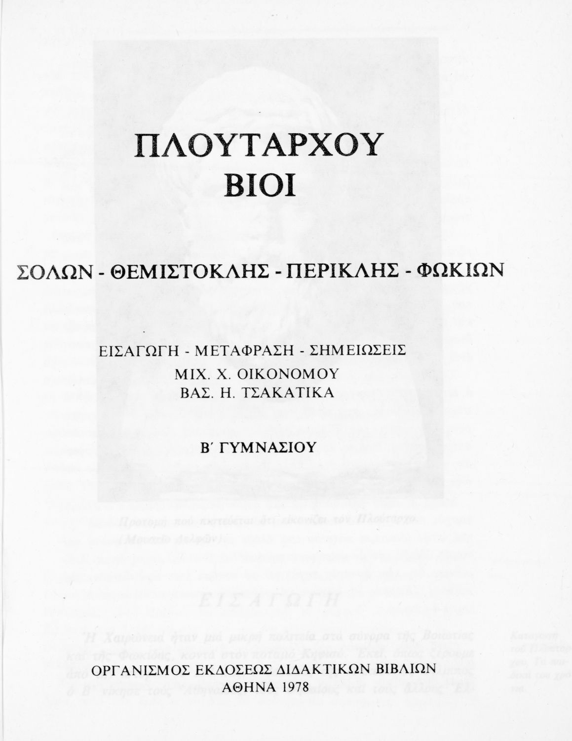 Σχολικό εγχειρίδιο Αρχαίων Ελληνικών της Β' Γυμνασίου. Το βιβλίο περιλαμβάνει τέσσερις από τους “Βίους” του Πλούταρχου: του Σόλωνα, του Θεμιστοκλή, του Περικλή και του Φωκίωνα