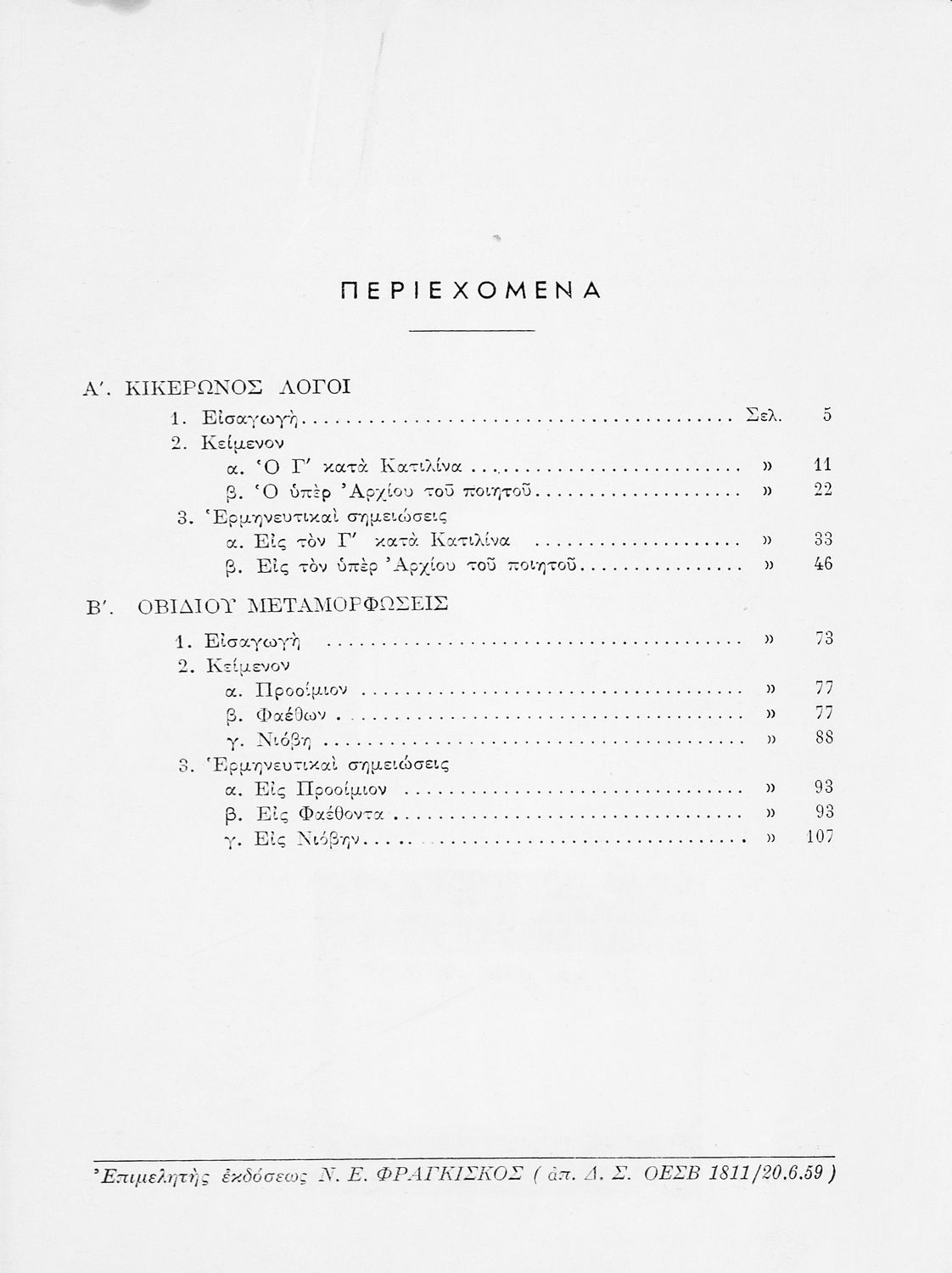 Κικέρωνος λόγοι ο Γ΄ κατά Κατιλίνα και ο υπέρ Αρχίου του ποιητού / Οβίδιου Μεταμορφώσεις (Εκλογαί) δια την Ε΄ τάξιν των Γυμνασίων
