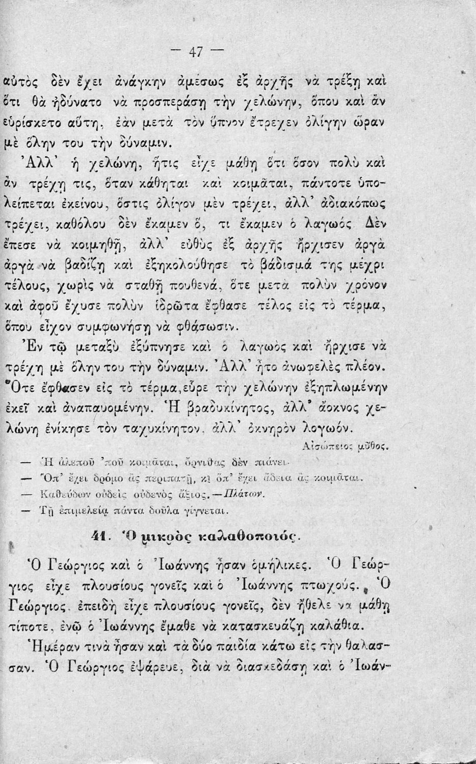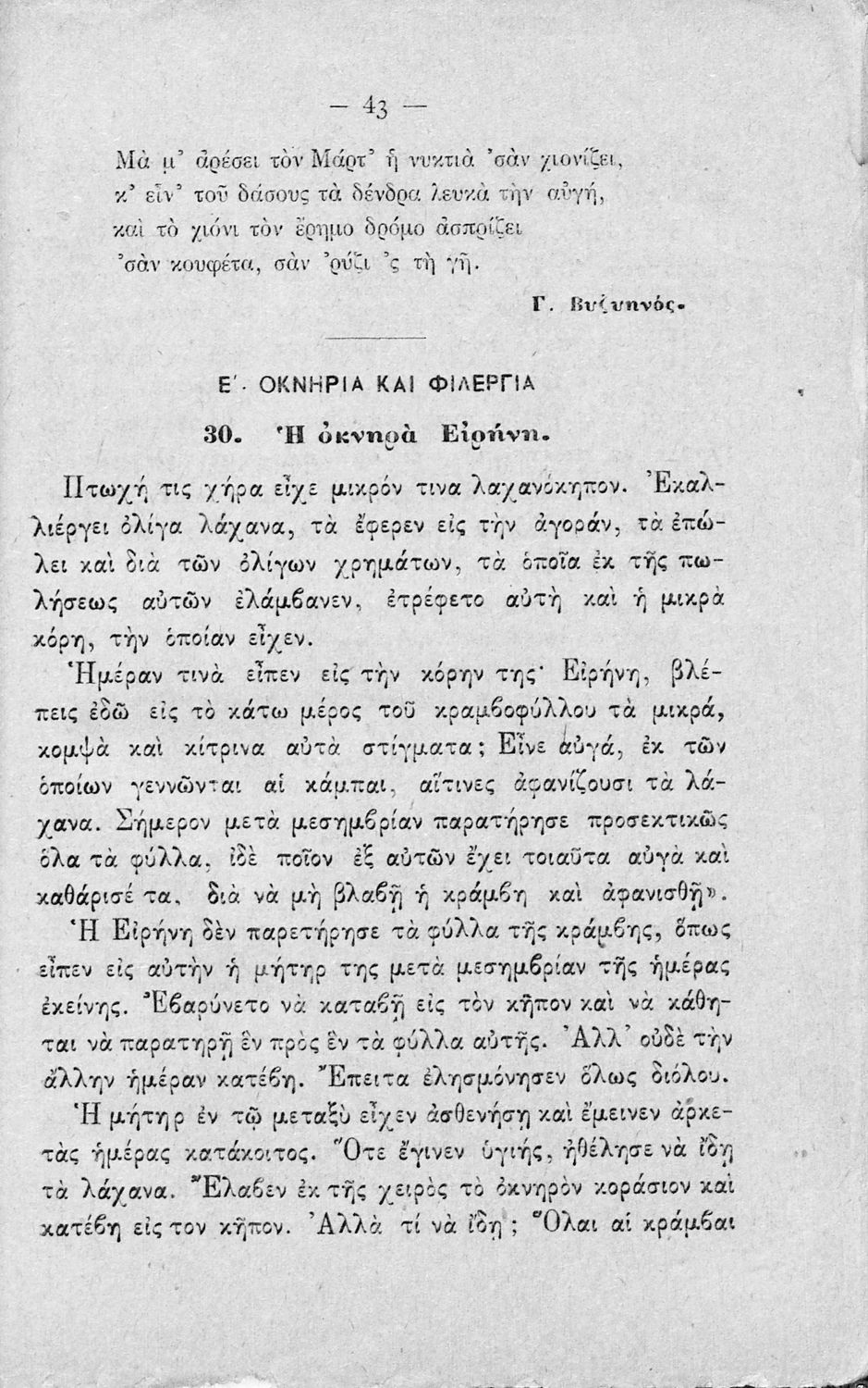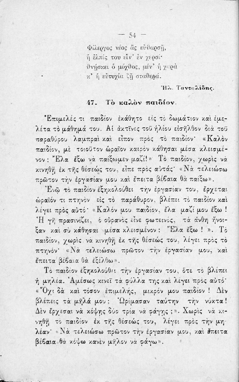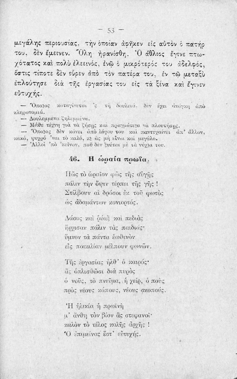 Βαθμίδα εκπαίδευσης: Πρωτοβάθμια Τάξη: Γ' Δημοτικού Μάθημα: Νέα Ελληνικά Γλώσσα: Καθαρεύουσα Παρουσίαση περιεχομένου: Αναγνωστικό Γ΄ Δημοτικού που περιλαμβάνει ποιήματα και πεζά με θέματα όπως η καλή και κακή συναναστροφή, η φρόνηση, η οκνηρία, η φιλανθρωπία και η πίστη στο Θεό |