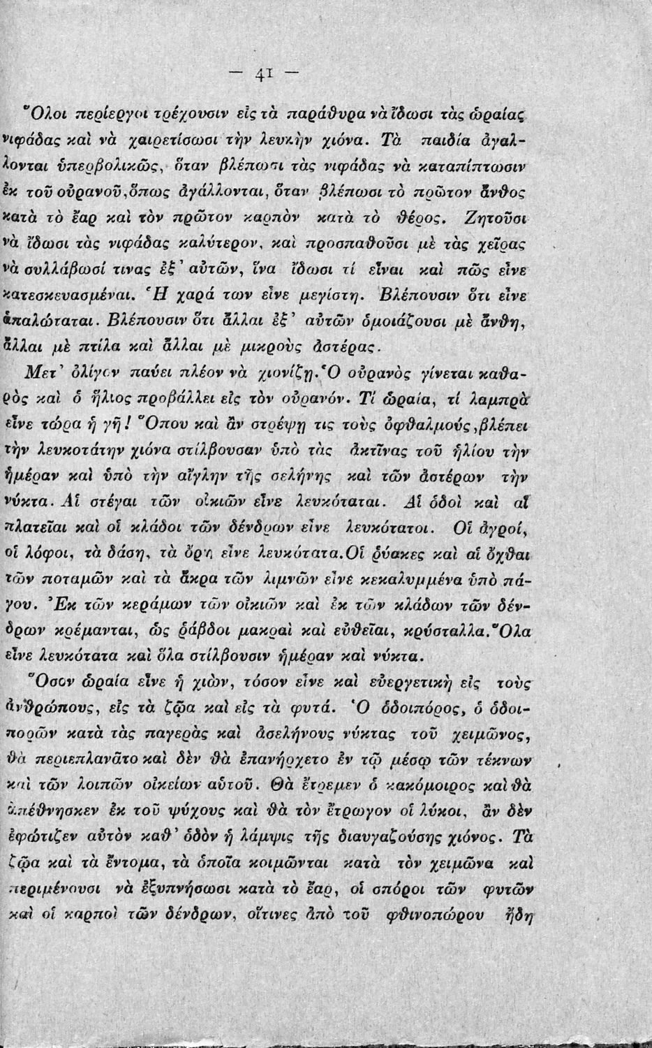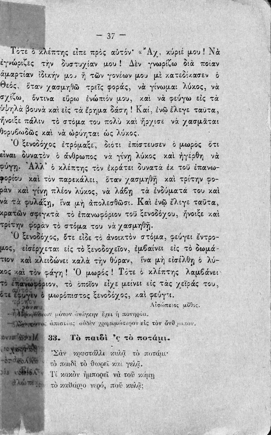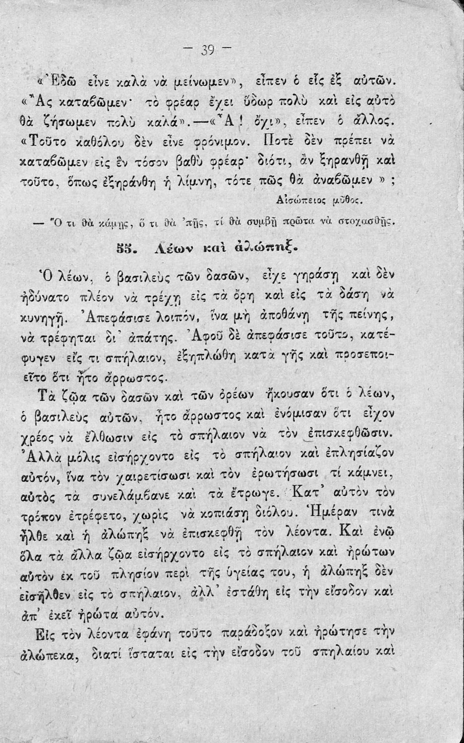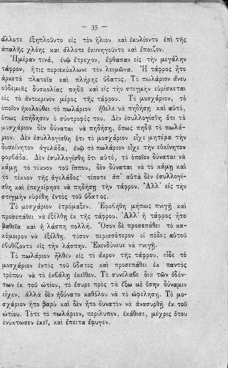 Βαθμίδα εκπαίδευσης: Πρωτοβάθμια Τάξη: Γ' Δημοτικού Μάθημα: Νέα Ελληνικά Γλώσσα: Καθαρεύουσα Παρουσίαση περιεχομένου: Αναγνωστικό Γ΄ Δημοτικού που περιλαμβάνει ποιήματα και πεζά με θέματα όπως η καλή και κακή συναναστροφή, η φρόνηση, η οκνηρία, η φιλανθρωπία και η πίστη στο Θεό |