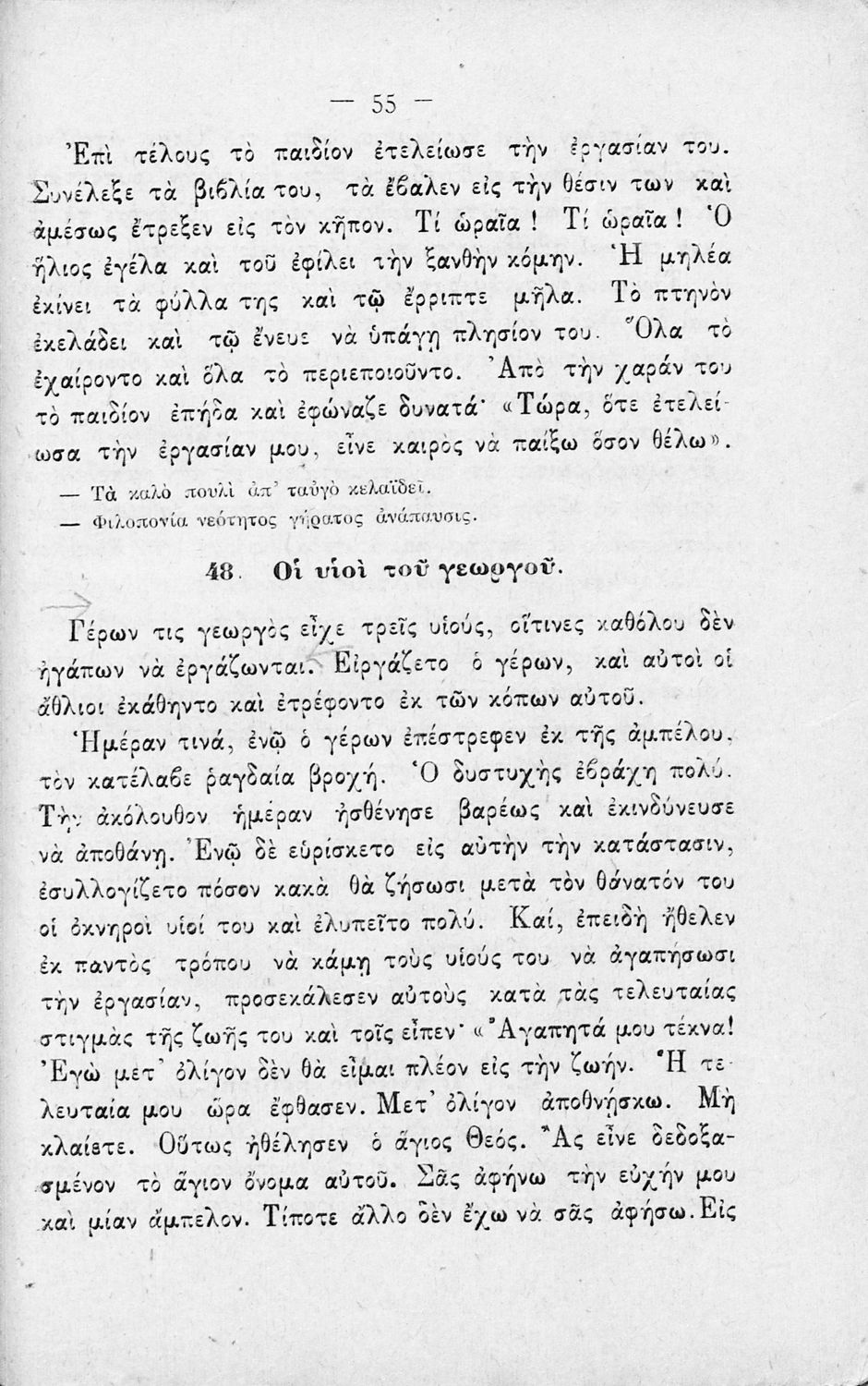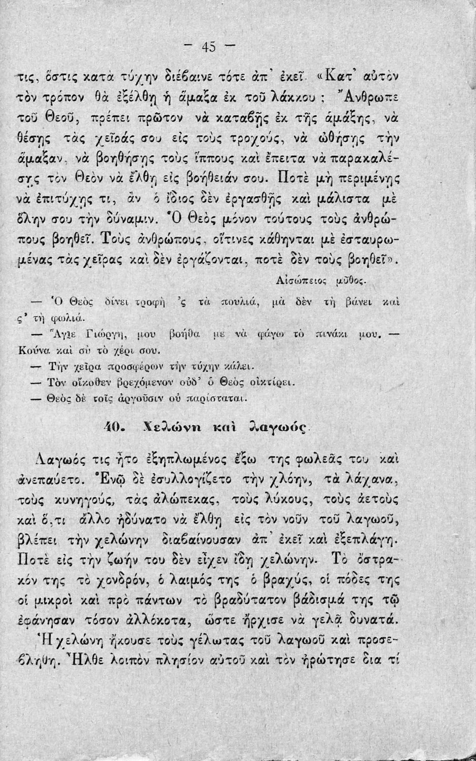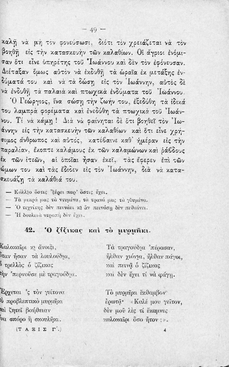 Αναγνωστικό Γ΄ Δημοτικού που περιλαμβάνει ποιήματα και πεζά με θέματα όπως η καλή και κακή συναναστροφή, η φρόνηση, η οκνηρία, η φιλανθρωπία και η πίστη στο Θεό