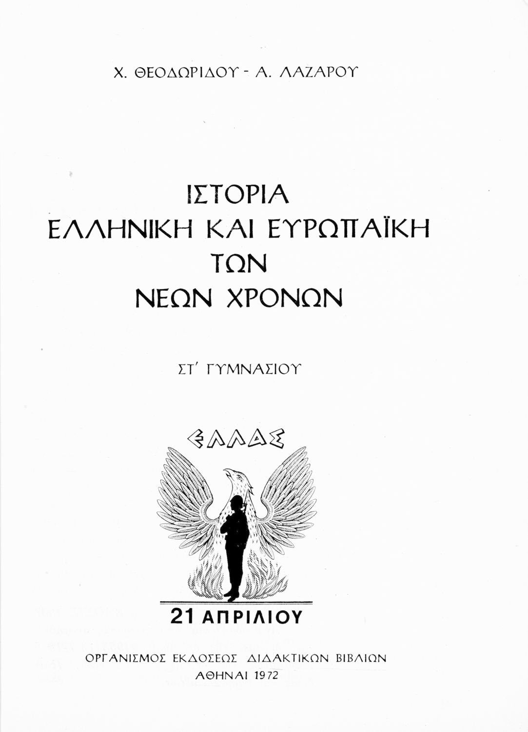 Σχολικό εγχειρίδιο Ιστορίας ΣΤ΄ Γυμνασίου που αποτελεί μια συνοπτική επισκόπηση της ιστορία της Ευρώπης και καλύπτει το διάστημα από την Συνθήκη της Βεστφαλίας ως τον Α΄ Παγκόσμιο Πόλεμο. Φέρει το σύμβολο της δικτατορίας.