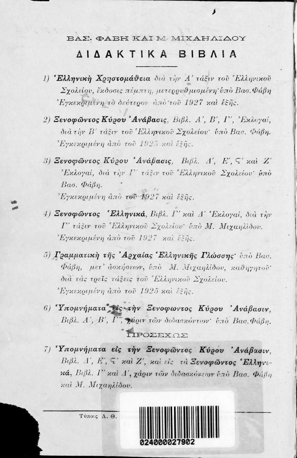 Σχολικό εγχειρίδιο Αρχαίων Ελληνικών Γ' Ελληνικού Σχολείου που περιλαμβάνει γραμματική της αρχαίας ελληνικής, αποσπάσματα από το έργο του Ξενοφώντα Ελληνικά και τα έργα του Λουκιανού Ενύπνιον και Ανάχαρσις, ...