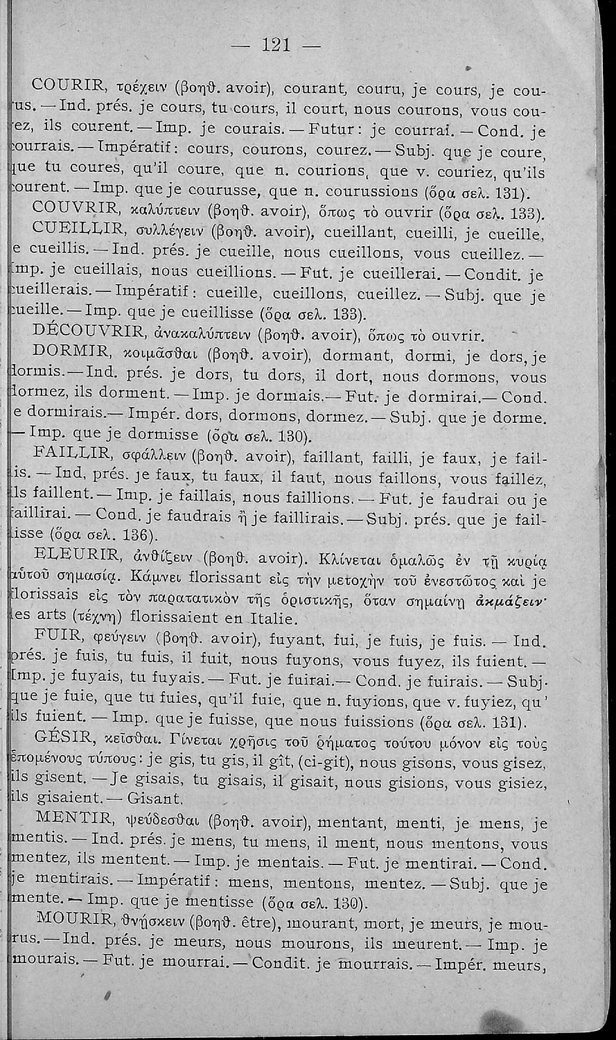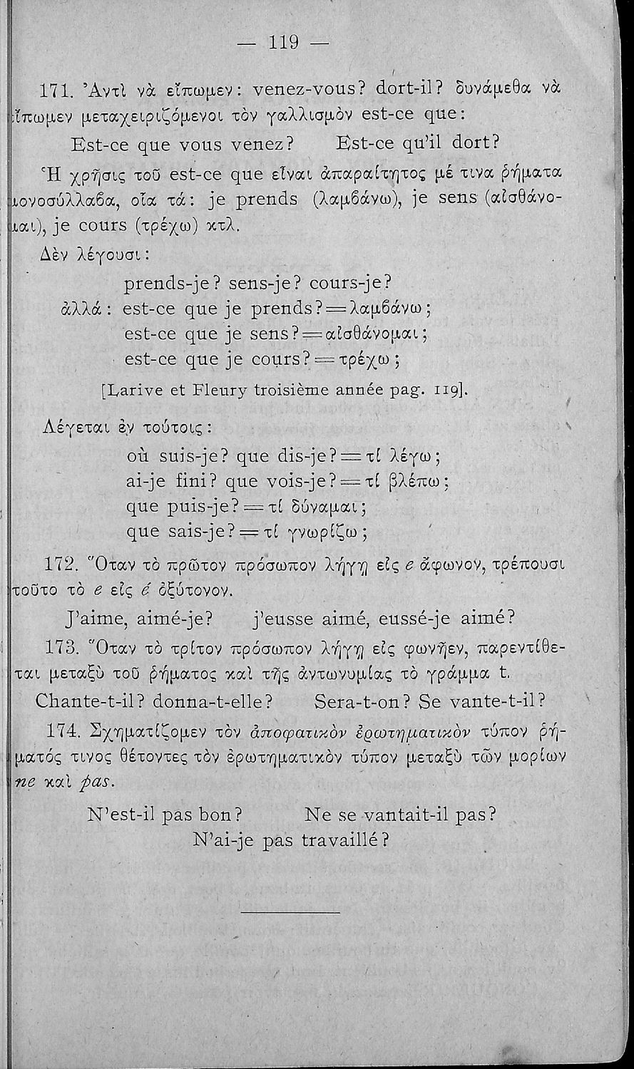 Σχολικό εγχειρίδιο Γαλλικών για τα Γυμνάσια, Αστικά Σχολεία και Διδασκαλεία που περιλαμβάνει τη γραμματική και το συντακτικό της γαλλικής γλώσσας, παραδείγματα και ασκήσεις.