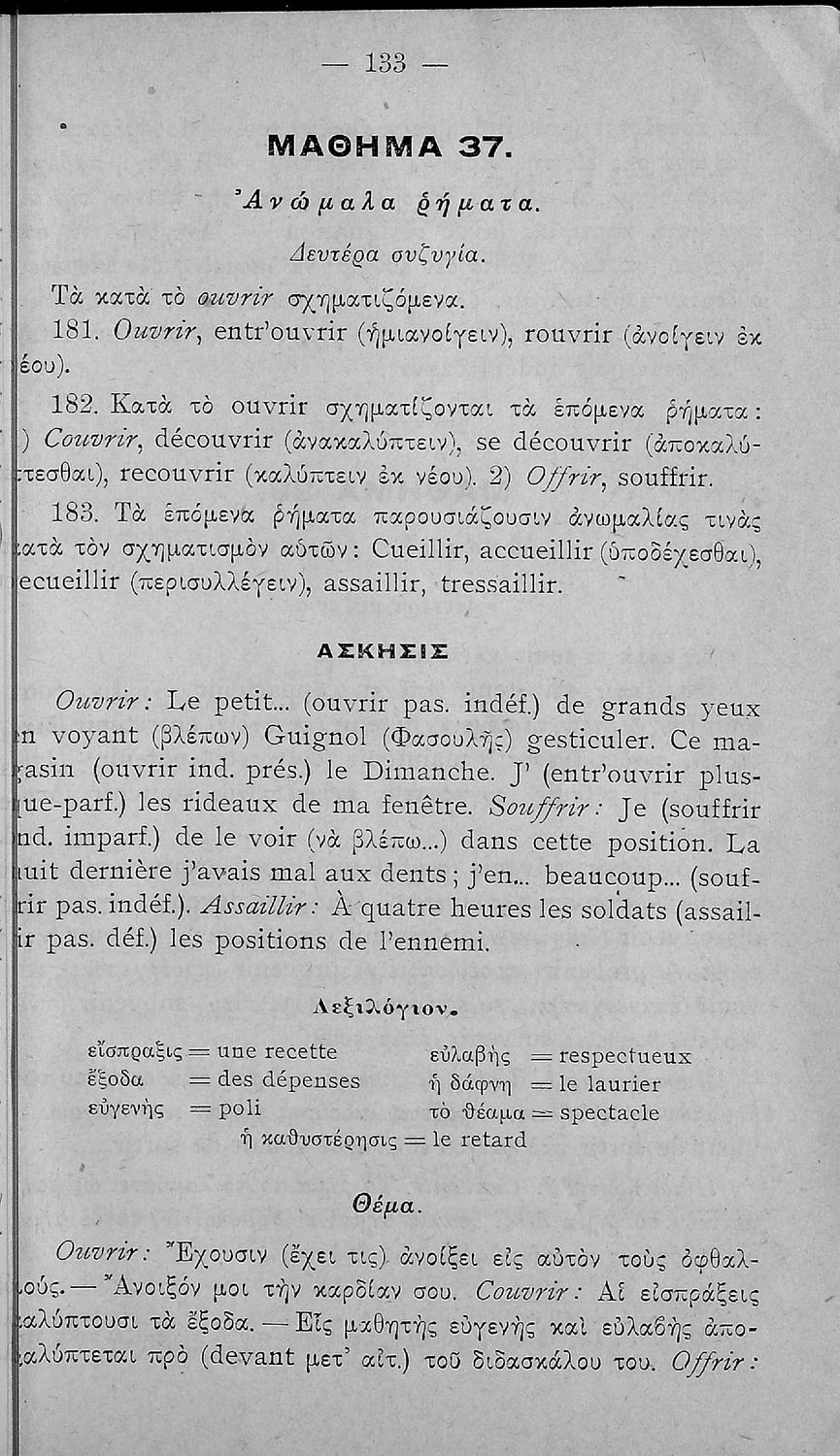 Γραμματική της Γαλλικής γλώσσας για τα Τετρατάξια Γυμνάσια, τη Γ΄ τάξη των Αστικών Σχολείων Θηλέων και τα Διδασκαλεία της Δημοτικής Εκπαίδευσης που περιλαμβάνει θεωρία, ασκήσεις και λεξιλόγιο.