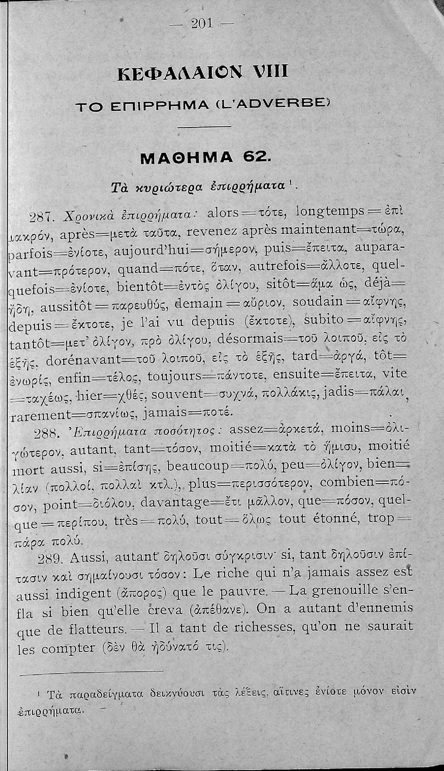Γραμματική της Γαλλικής γλώσσας για τα Τετρατάξια Γυμνάσια, τη Γ΄ τάξη των Αστικών Σχολείων των Θηλέων και τα Διδασκαλεία της Δημοτικής Εκπαίδευσης που περιλαμβάνει θεωρία, ασκήσεις και λεξιλόγιο.
