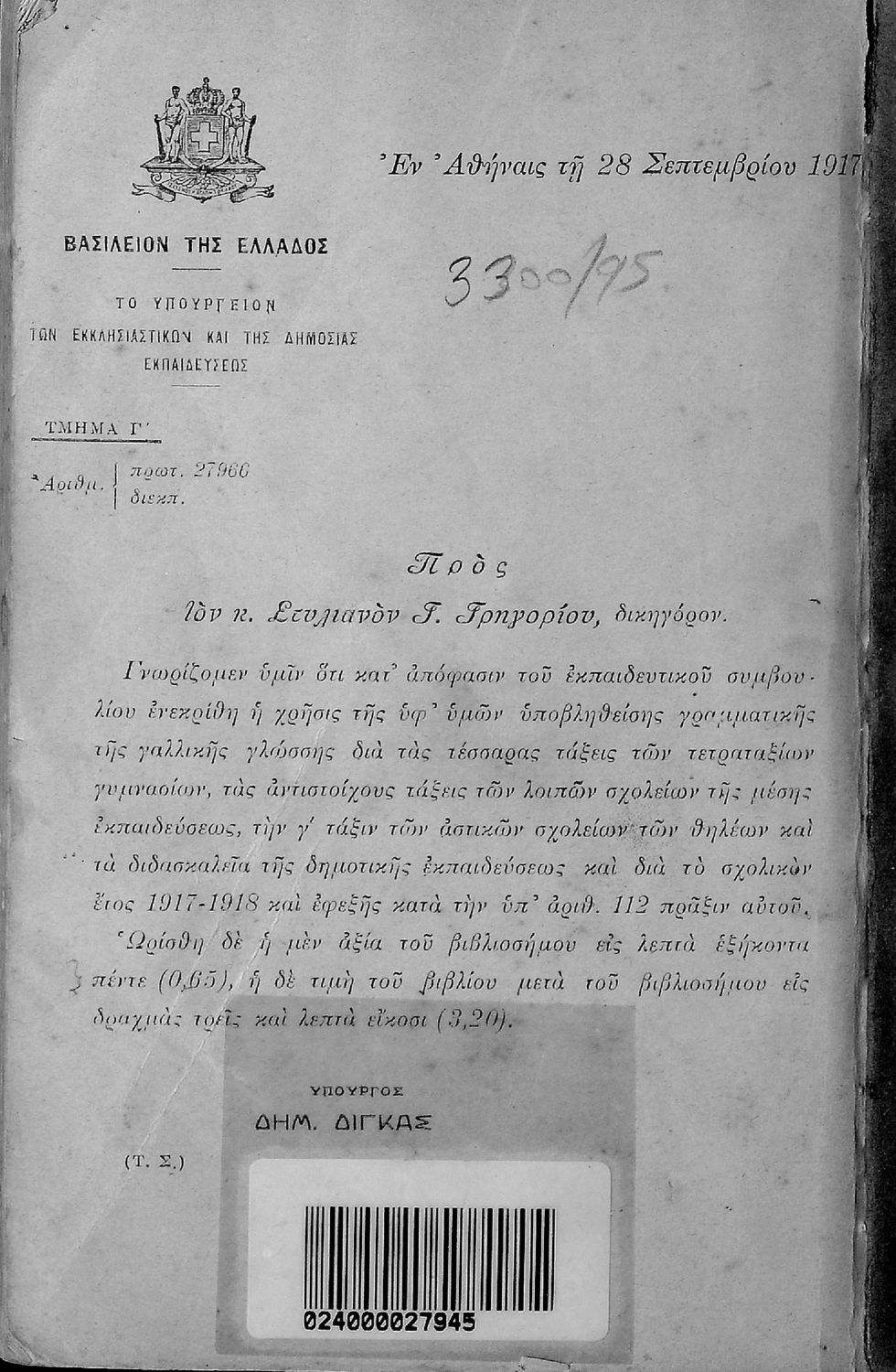 Υπουργική απόφαση / Σύμβαση: 27966/28-9-1917