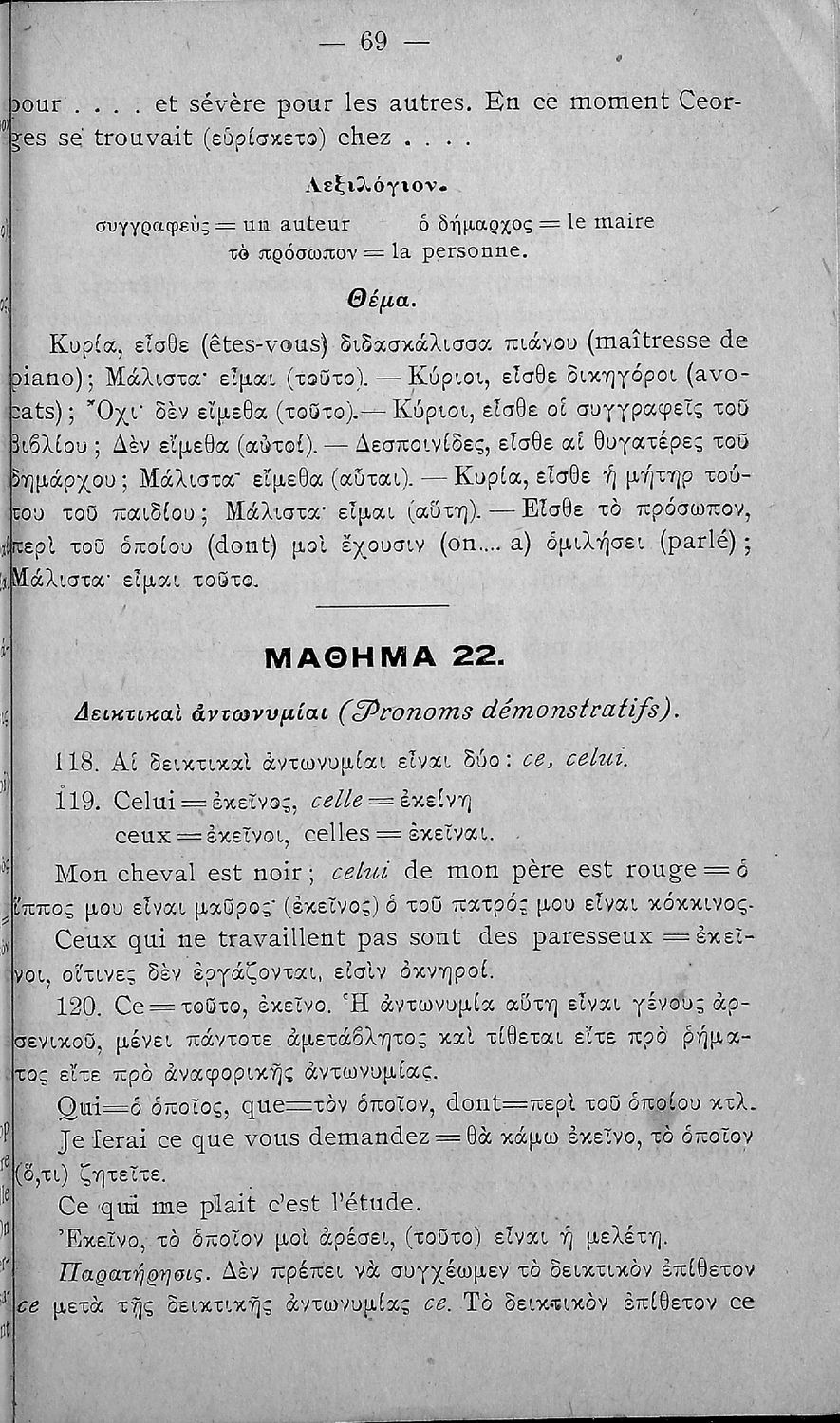 Γραμματική της Γαλλικής γλώσσας για τα Τετρατάξια Γυμνάσια, τη Γ΄ τάξη των Αστικών Σχολείων Θηλέων και τα Διδασκαλεία της Δημοτικής Εκπαίδευσης που περιλαμβάνει θεωρία, ασκήσεις και λεξιλόγιο.