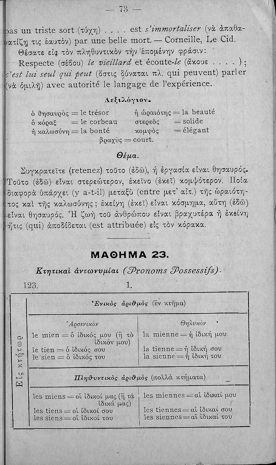Σχολικό εγχειρίδιο Γαλλικών για τα Γυμνάσια, Αστικά Σχολεία και Διδασκαλεία που περιλαμβάνει τη γραμματική και το συντακτικό της γαλλικής γλώσσας, παραδείγματα και ασκήσεις.
