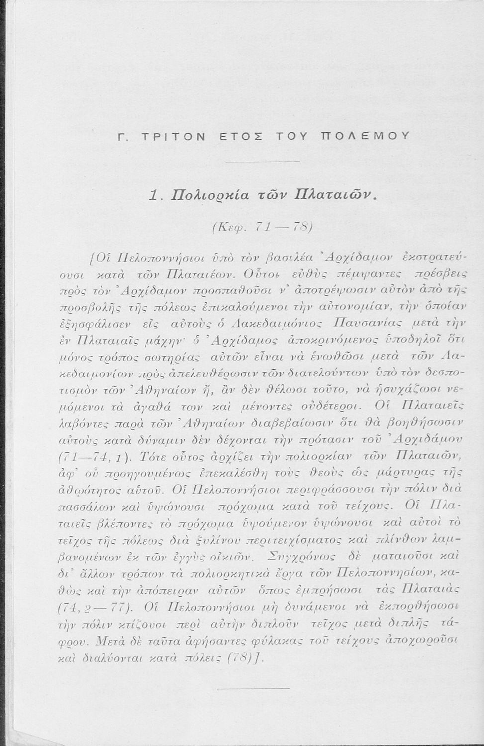 Σχολικό εγχειρίδιο Αρχαίων Ελληνικών για τις Δ΄, Ε΄ και ΣΤ΄ Γυμνασίου παλαιού τύπου που περιλαμβάνει σύντομο βιογραφικό σημείωμα του Θουκυδίδη, περιγραφή του ιστορικού πλαισίου, αποσπάσματα από τα Πλαταϊκά, τα