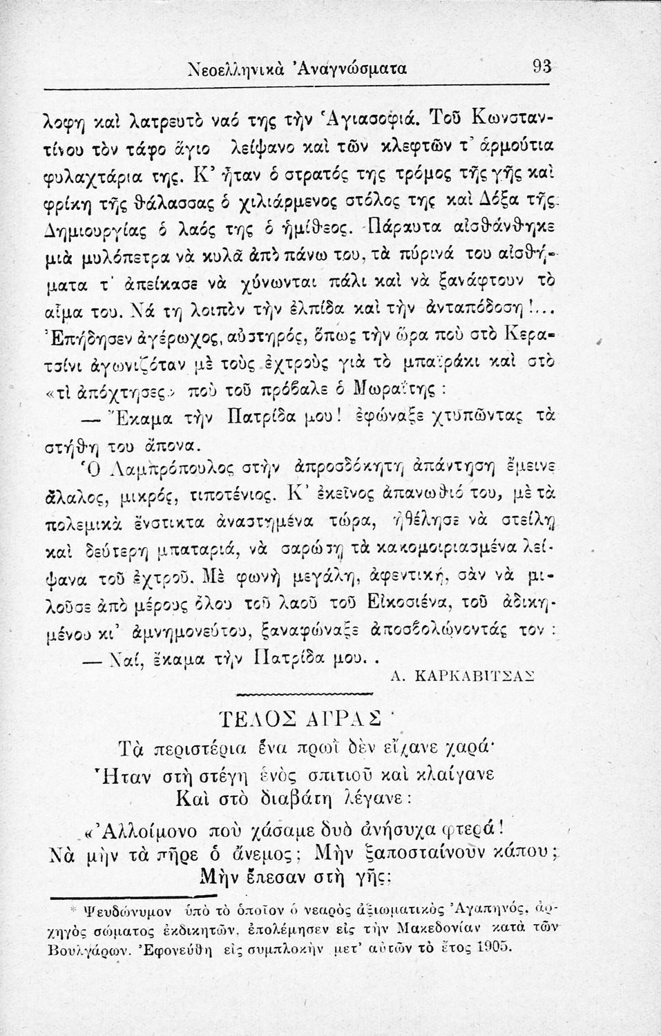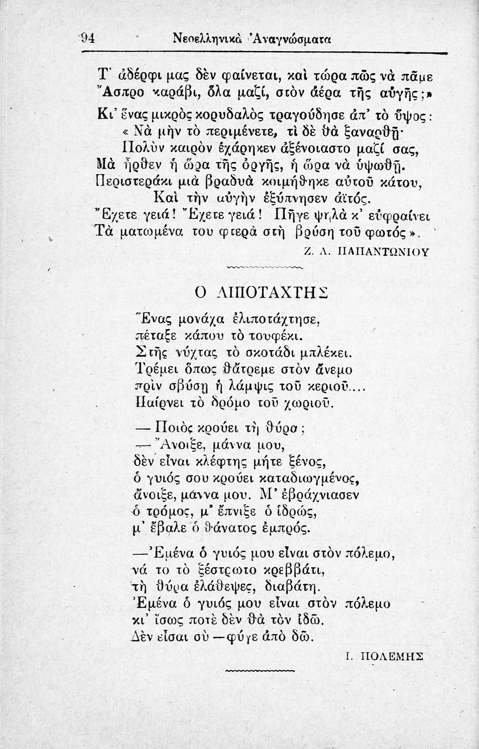 Σχολικό εγχειρίδιο Νεοελληνικών αναγνωσμάτων που περιλαμβάνει πεζά και ποιήματα με θέματα από την εθνική ζωή.