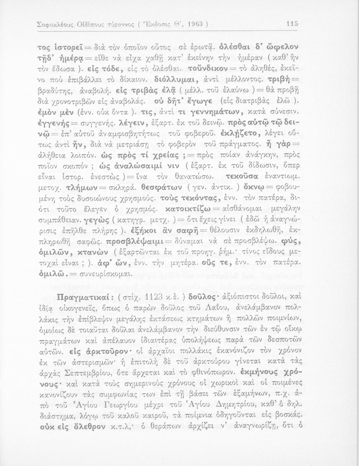 Σχολικό εγχειρίδιο της ΣΤ΄ Γυμνασίου για το μάθημα των Αρχαίων Ελληνικών. Περιλαμβάνει την τραγωδία Οιδίπους επί Κολωνώ, πραγματολογικά σχόλια και λεξιλογικές παρατηρήσεις. Ο συγγραφέας ήταν Γυμνασιάρχης.