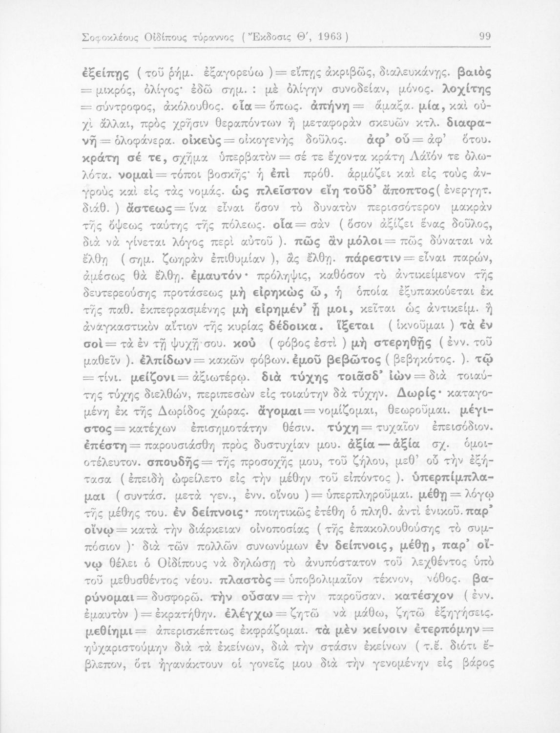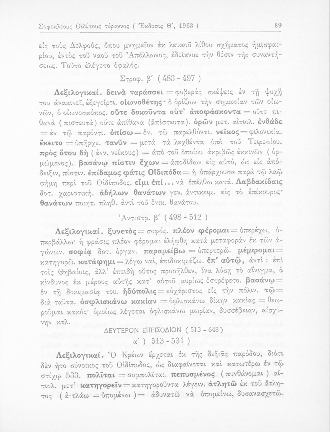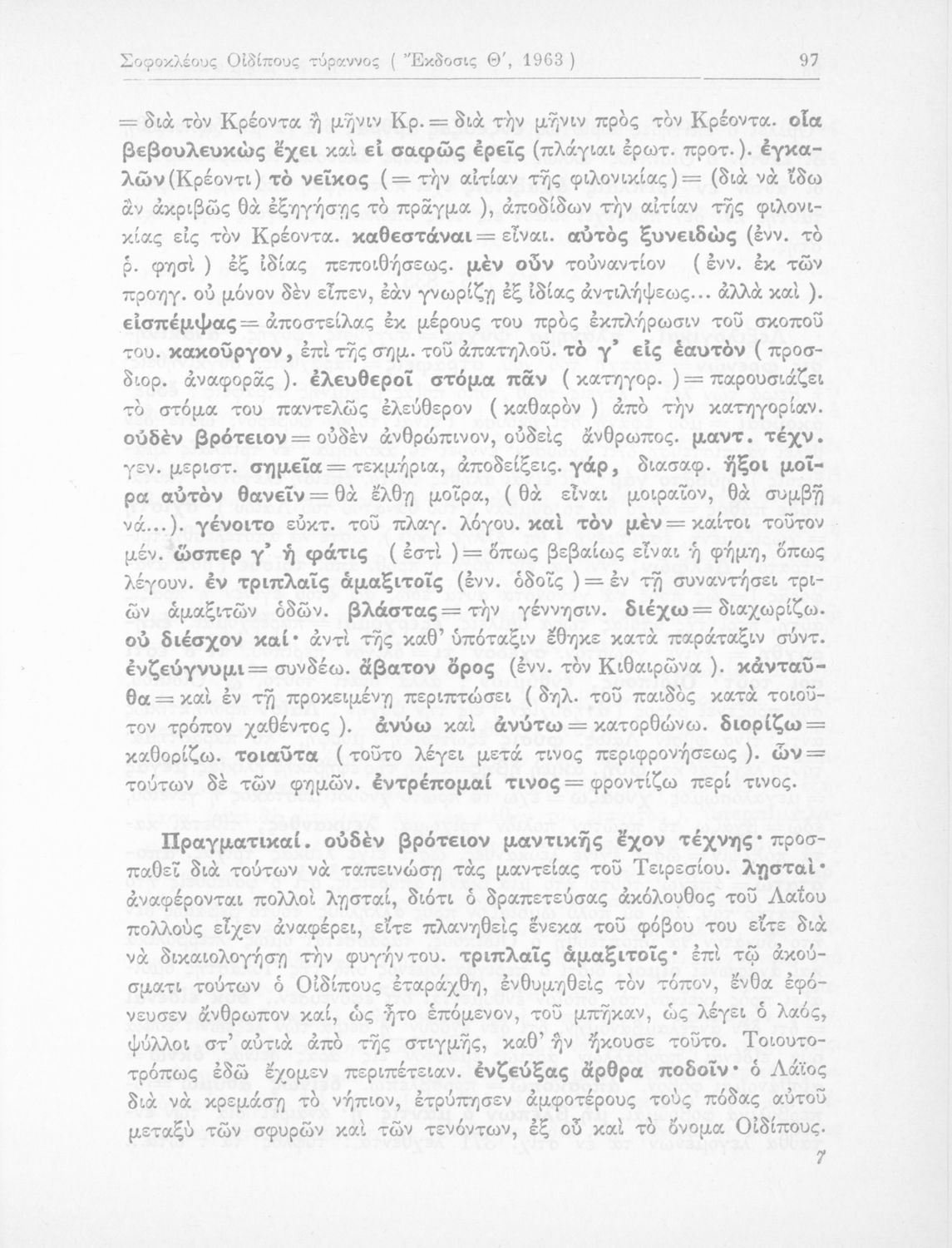Σχολικό εγχειρίδιο της ΣΤ΄ Γυμνασίου για το μάθημα των Αρχαίων Ελληνικών. Περιλαμβάνει την τραγωδία Οιδίπους επί Κολωνώ, πραγματολογικά σχόλια και λεξιλογικές παρατηρήσεις. Ο συγγραφέας ήταν Γυμνασιάρχης.