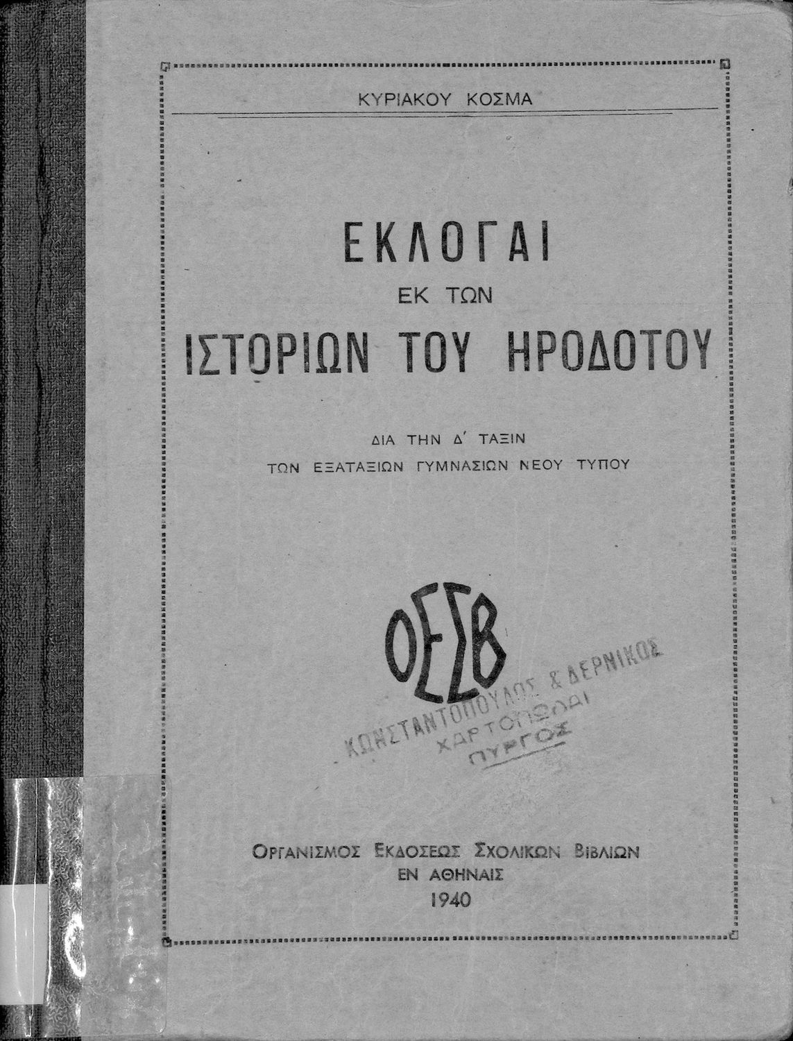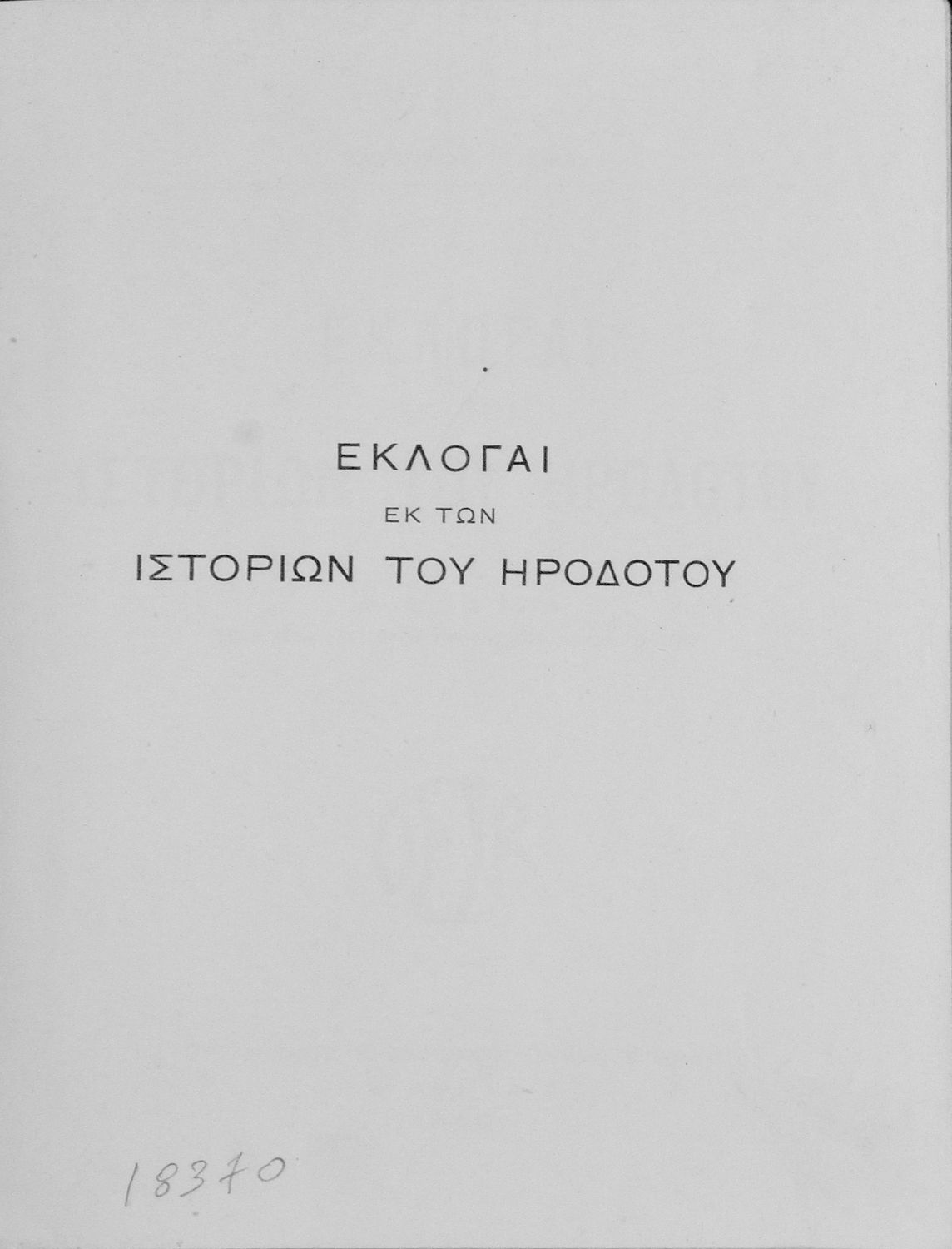 Τίτλος: Εκλογαί εκ των Ιστοριών του Ηροδότου δια την Δ΄ τάξιν των Εξαταξίων Γυμνασίων νέου τύπου