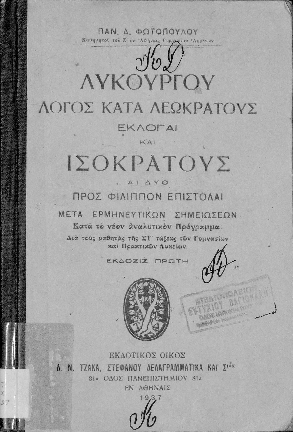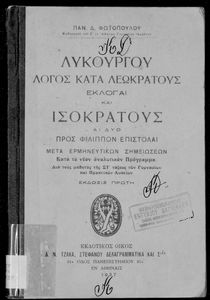 Λυκούργου Λόγος κατά Λεωκράτους εκλογαί μετά ερμηνευτικών σημειώσεων. Προς χρήσιν των μαθητών της Τετάρτης Γυμνασίων και Πρακτικών Λυκείων / Ισοκράτους Αι δύο προς Φίλιππον επιστολαί Προς χρήσιν των μαθητών της Τετάρτης Γυμνασίων και Πρακτικών Λυκείων