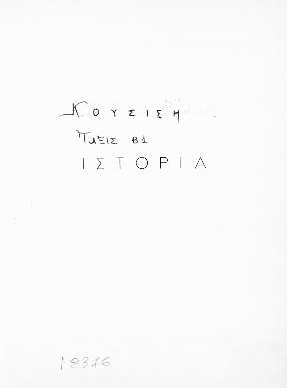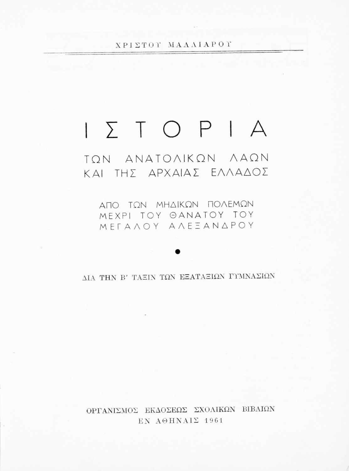 Τίτλος: Ιστορία των ανατολικών λαών και της αρχαίας Ελλάδος από των μηδικών πολέμων μέχρι του θανάτου του Μεγάλου Αλεξάνδρου. Δια την Β΄ Τάξιν των Εξαταξίων Γυμνασίων
