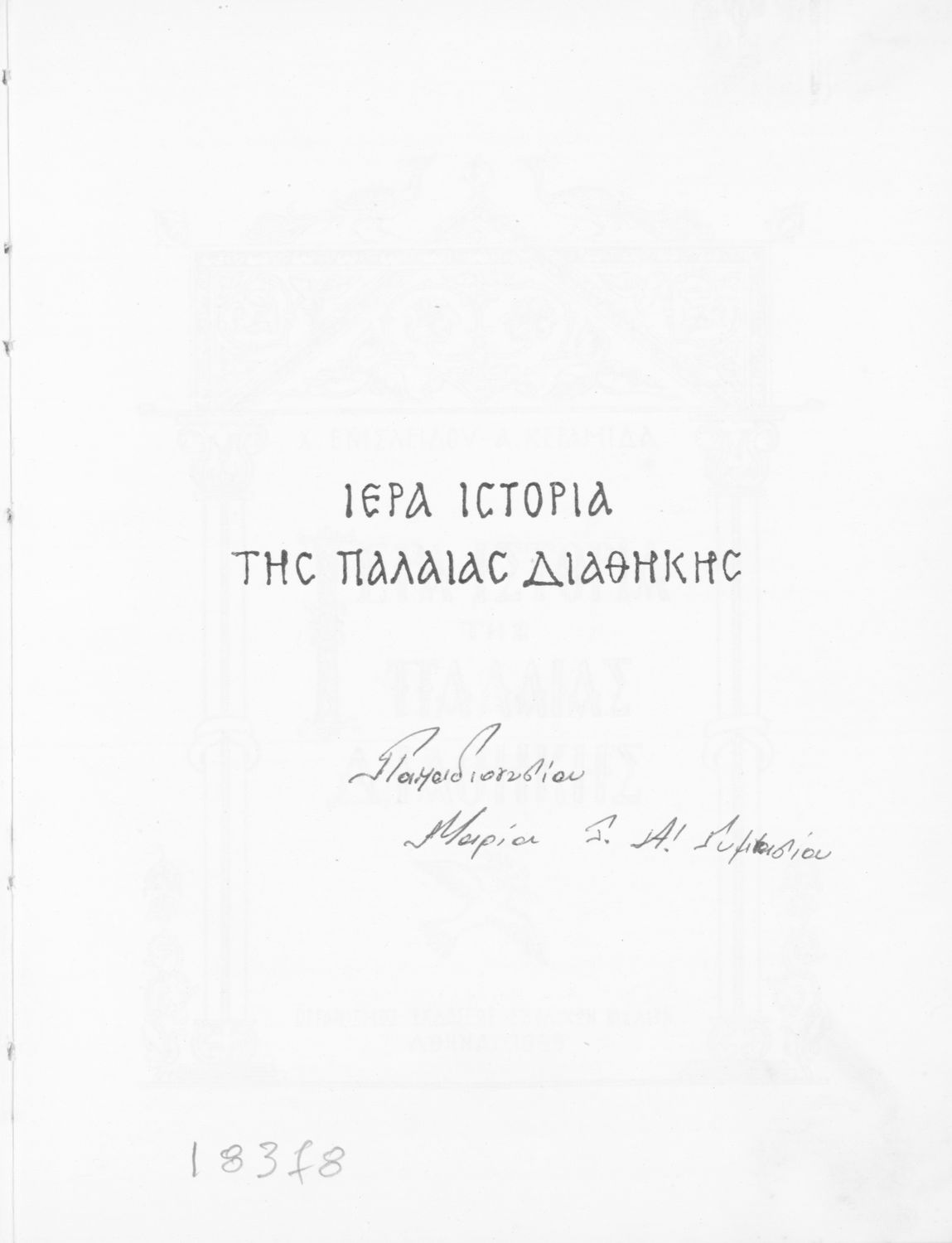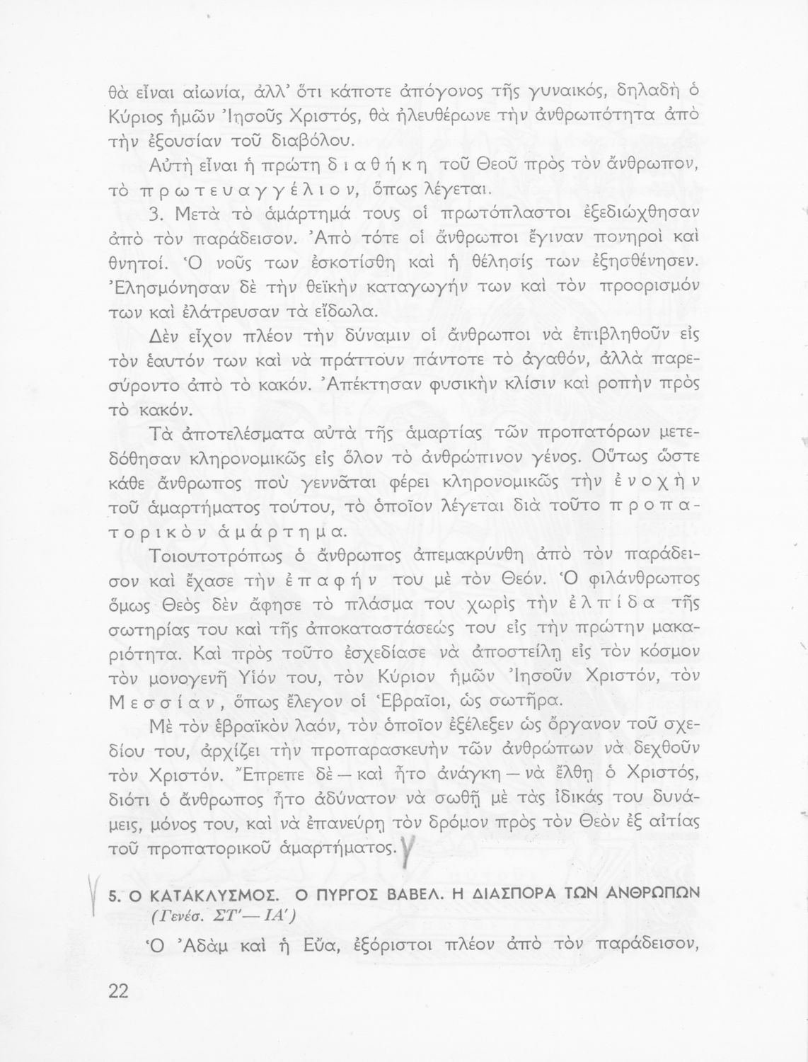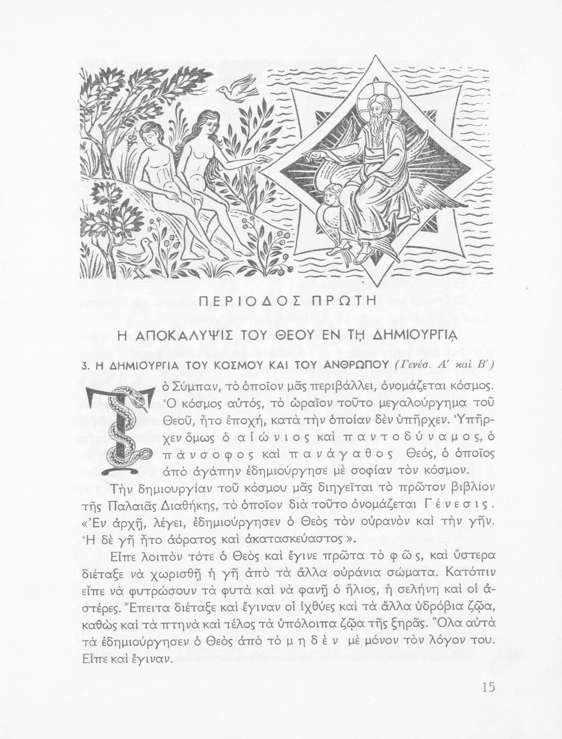 Σχολικό εγχειρίδιο Θρησκευτικών που συνιστά μία εξιστόρηση της Παλαιάς Διαθήκης από τη δημιουργία του κόσμου ως την υποταγή των Εβραίων στους Ρωμαίους. Περιέχει και στοιχεία γεωγραφίας της Παλαιστίνης.