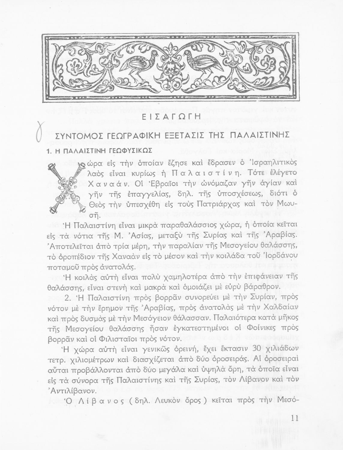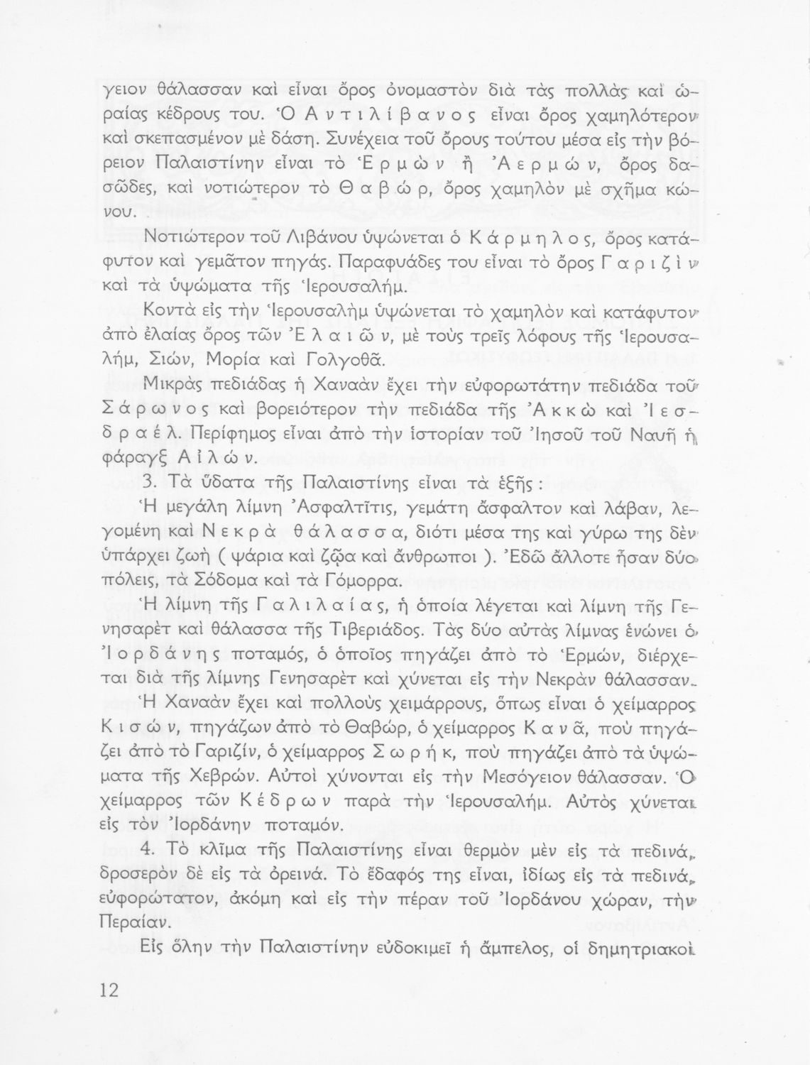 Μάθημα: Θρησκευτικά Γλώσσα: Απλή καθαρεύουσα Παρουσίαση περιεχομένου: Σχολικό εγχειρίδιο Θρησκευτικών που συνιστά μία εξιστόρηση της Παλαιάς Διαθήκης από τη δημιουργία του κόσμου ως την υποταγή των Εβραίων στους Ρωμαίους. Περιέχει και στοιχεία γεωγραφίας της Παλαιστίνης. |