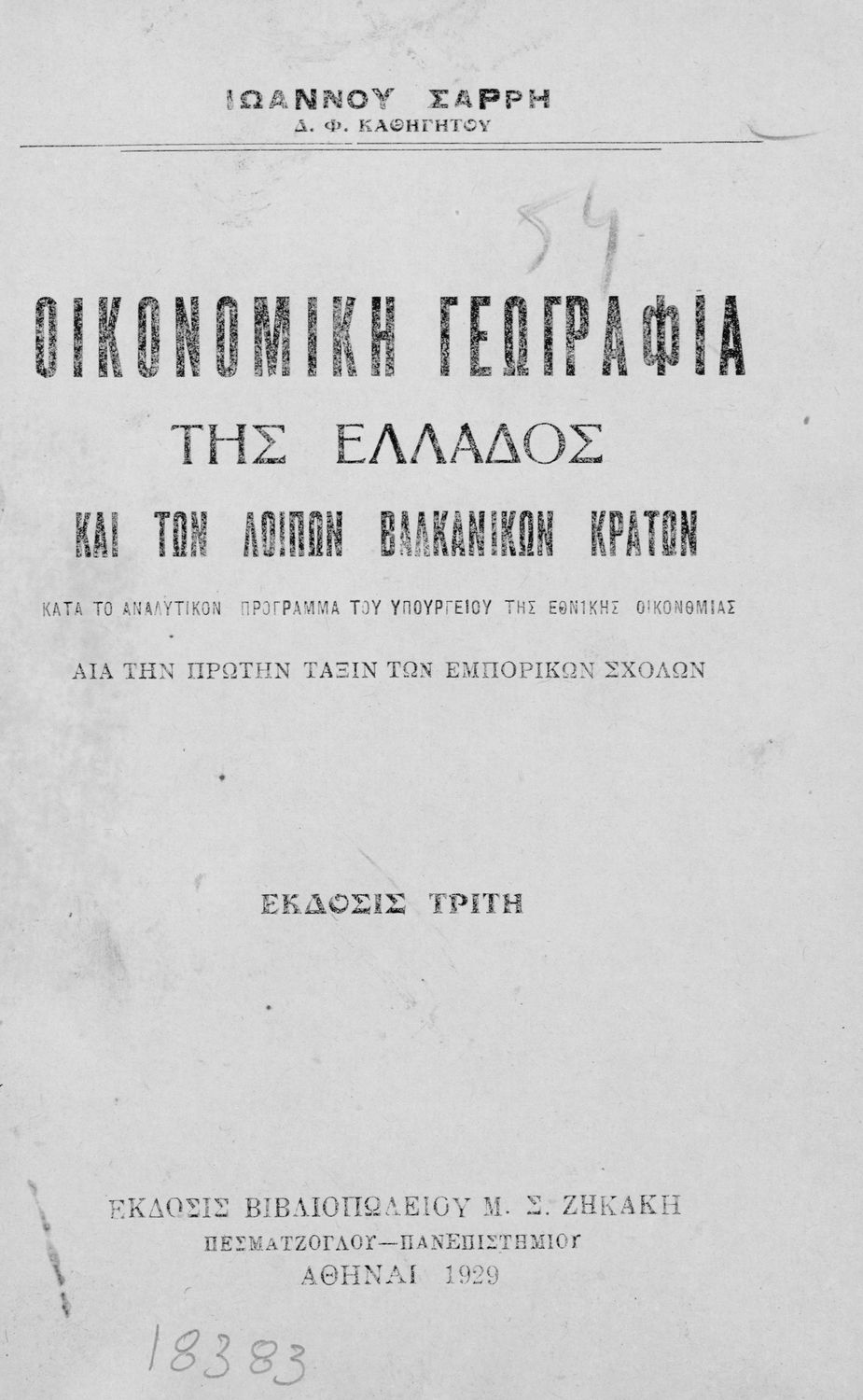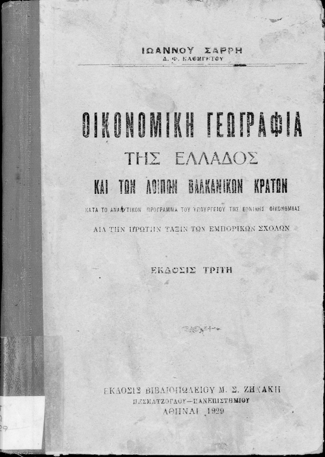 Κωδικός αναγνώρισης: 01-18383 Τίτλος: Οικονομική Γεωγραφία της Ελλάδος και των λοιπών Βαλκανικών κρατών δια την πρώτην τάξιν των εμπορικών σχολών Συγγραφέας: Ιωάννης Σαρρής Μέγεθος και υπόστρωμα: Σχολικό εγχειρίδιο, 112 σελίδες. Εικόνες (ασπρόμαυρες), χάρτες (ασπρόμαυροι). |