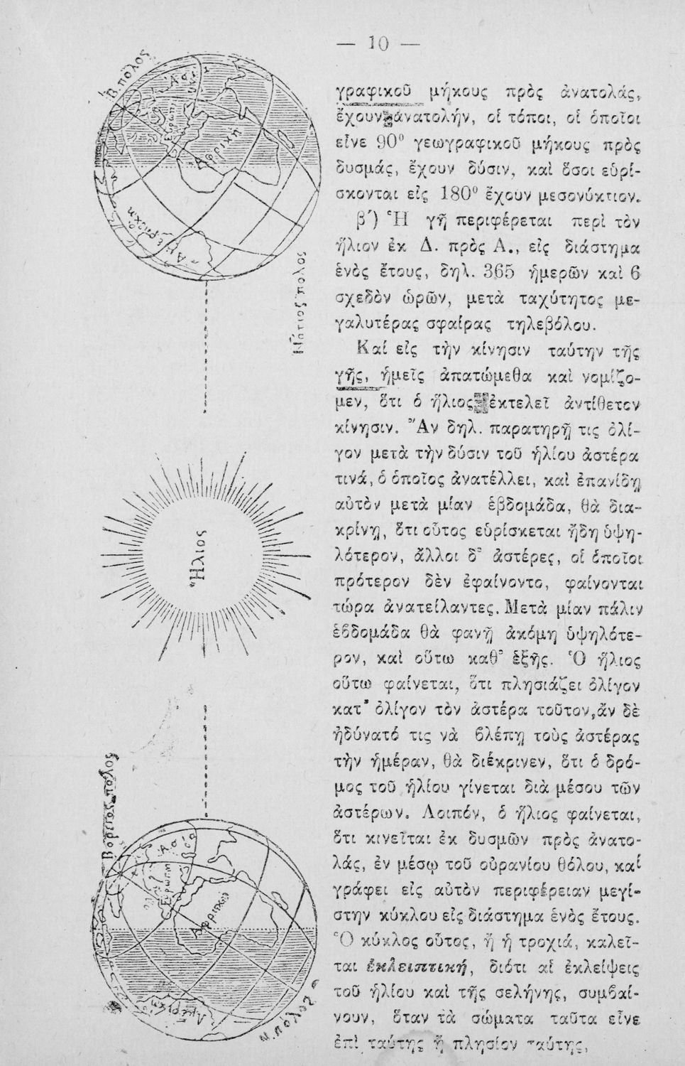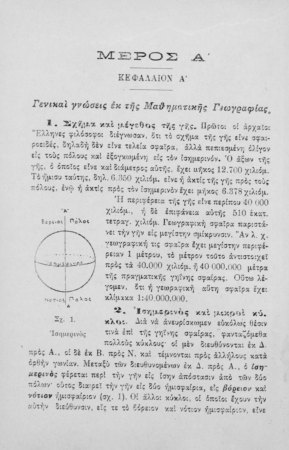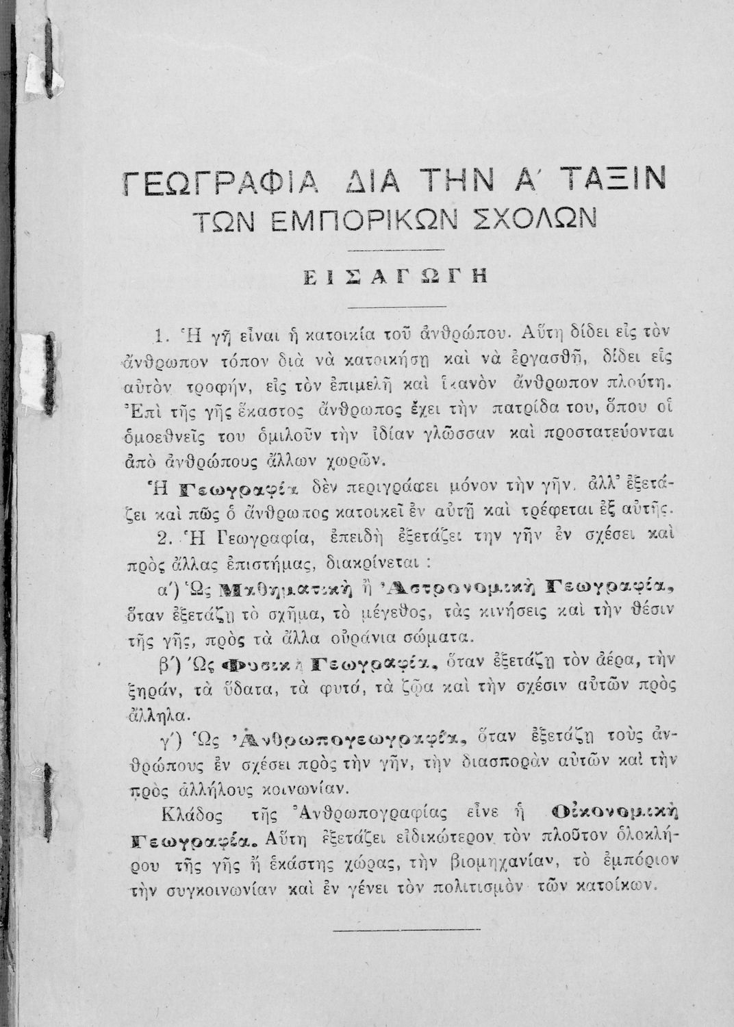 Σχολικό εγχειρίδιο Γεωγραφίας για την Α΄ Εμπορικών Σχολών. Περιλαμβάνει στοιχεία μαθηματικής, αστρονομικής και φυσικής γεωγραφίας. Περιέχει στοιχεία γεωφυσικά και πολιτικά της Ελλάδας και των χωρών της χερσονήσου του Αίμου.