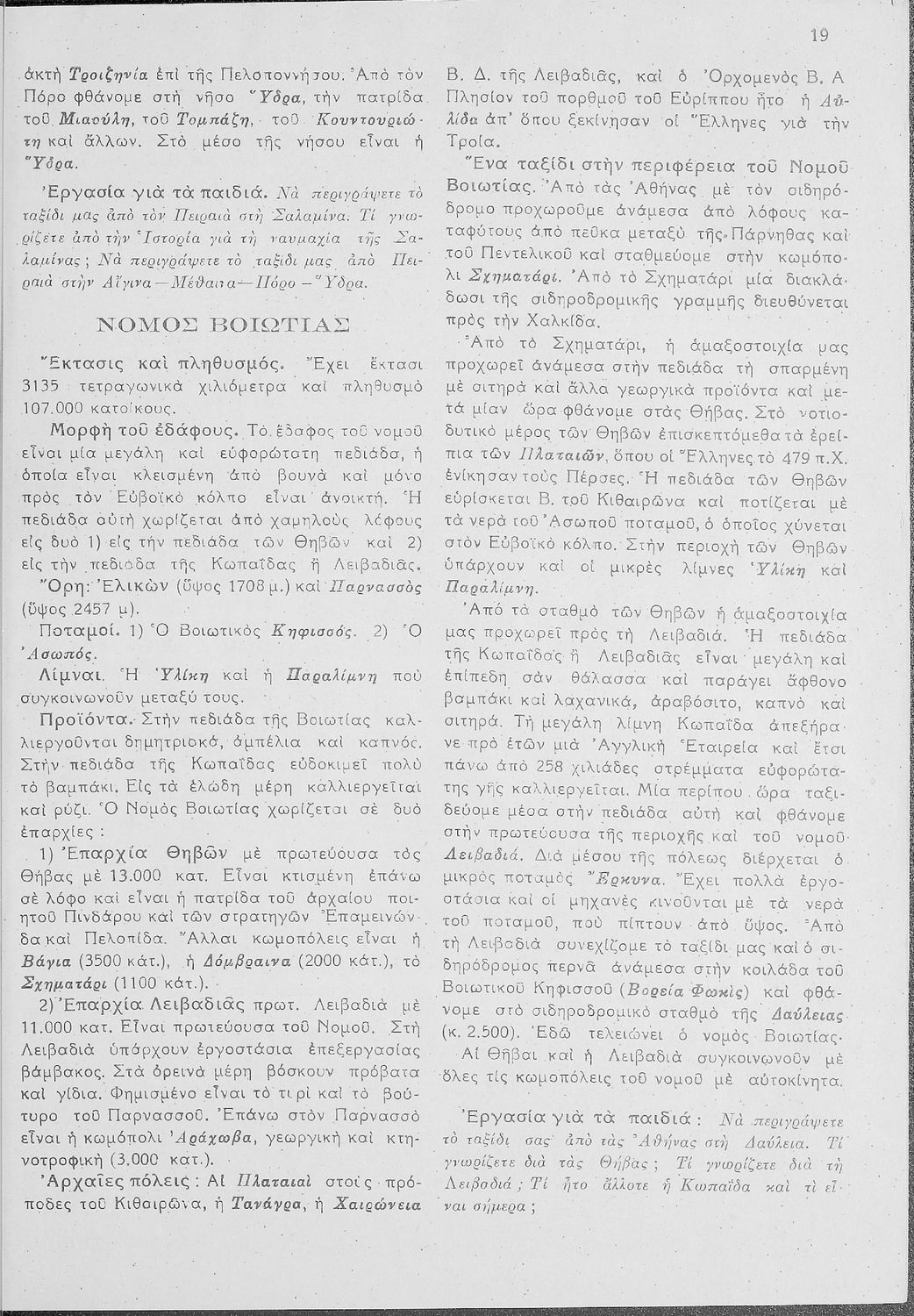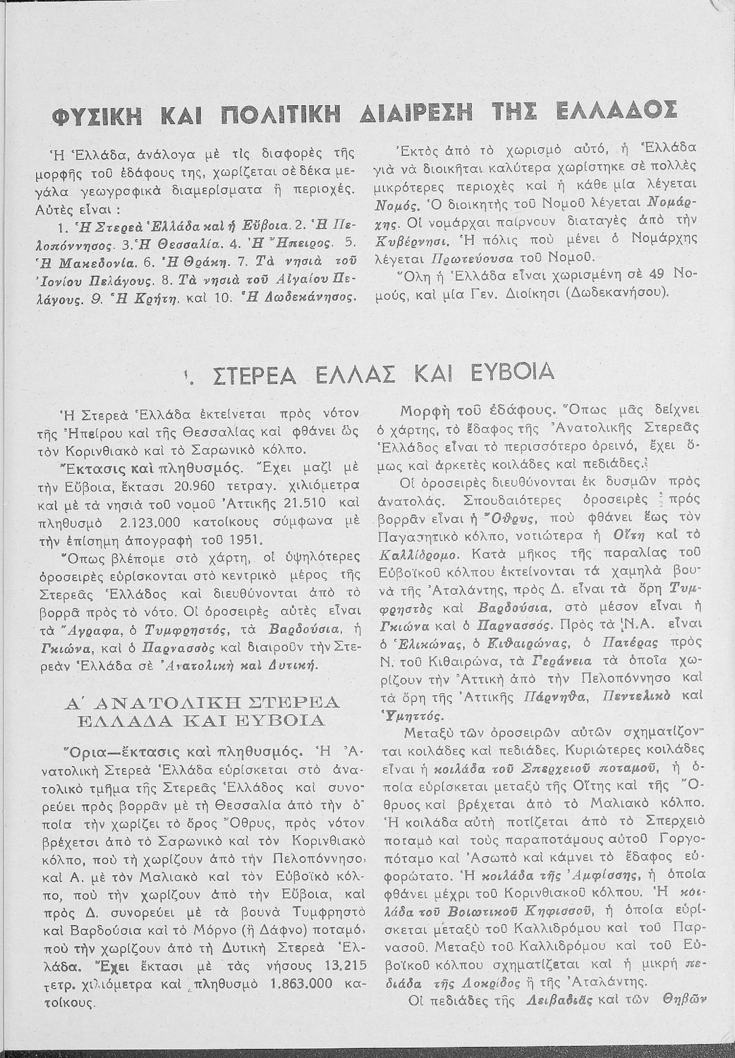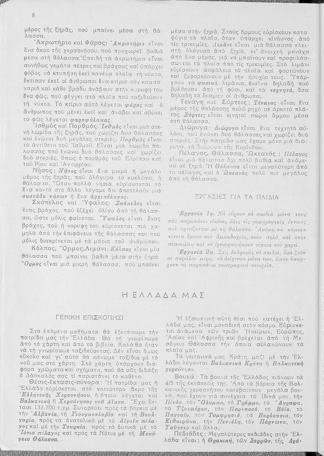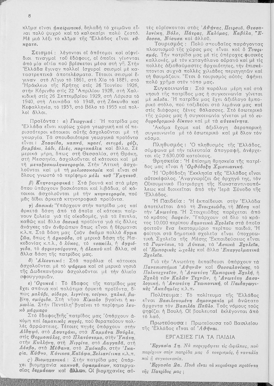 Μαθητικό βοήθημα Γεωγραφίας Γ΄, Δ΄ Δημοτικού που αποτελεί μια γενική επισκόπηση της Ελλάδας ανά διαμέρισμα και νομό από γεωμορφολογική, πολιτική και οικονομική σκοπιά. Περιέχει και ταξιδιωτικές οδηγίες.