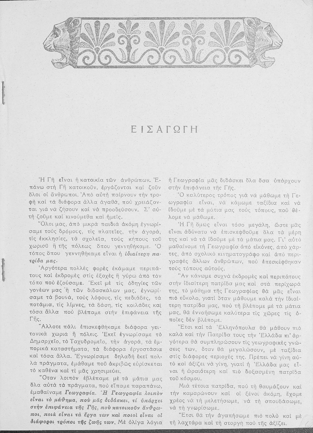 LDR 01265 2200193 4500 035 ## _a01-18385 040 ## _aΙνστιτούτο Εκπαιδευτικής Πολιτικής 041 ## _ael 100 ## _aΠαν. Παπαδόπουλος _aΦιλ. Κολοβός _aΔημ. Παπαδόπουλος 110 ## _a18385 245 0# _aΓεωγραφία- Άτλας Ελλάδος Προς χρήσιν των μαθητών Γ΄ και Δ΄ Δημοτικού 260 ## _aΑθήνα _bΠ. Δημητράκος Α.Ε. 300 ## _a81 _bΣκίτσα, φωτογραφίες και χάρτες (ασπρόμαυρα) _c28 520 ## _aΜαθητικό βοήθημα Γεωγραφίας Γ΄, Δ΄ Δημοτικού που αποτελεί μια γενική επισκόπηση της Ελλάδας ανά διαμέρισμα και νομό από γεωμορφολογική, πολιτική και οικονομική σκοπιά. Περιέχει και ταξιδιωτικές οδηγίες. 521 ## _aΓ' Δημοτικού / Δ' Δημοτικού 522 ## _aΕλλάδα 546 ## _aΔημοτική 563 ## _aΜαλακό Εξώφυλλο 650 #4 _aΜακεδονία _aΠελοπόννησος _aΣτερεά Ελλάδα _aΣυγκοινωνίες