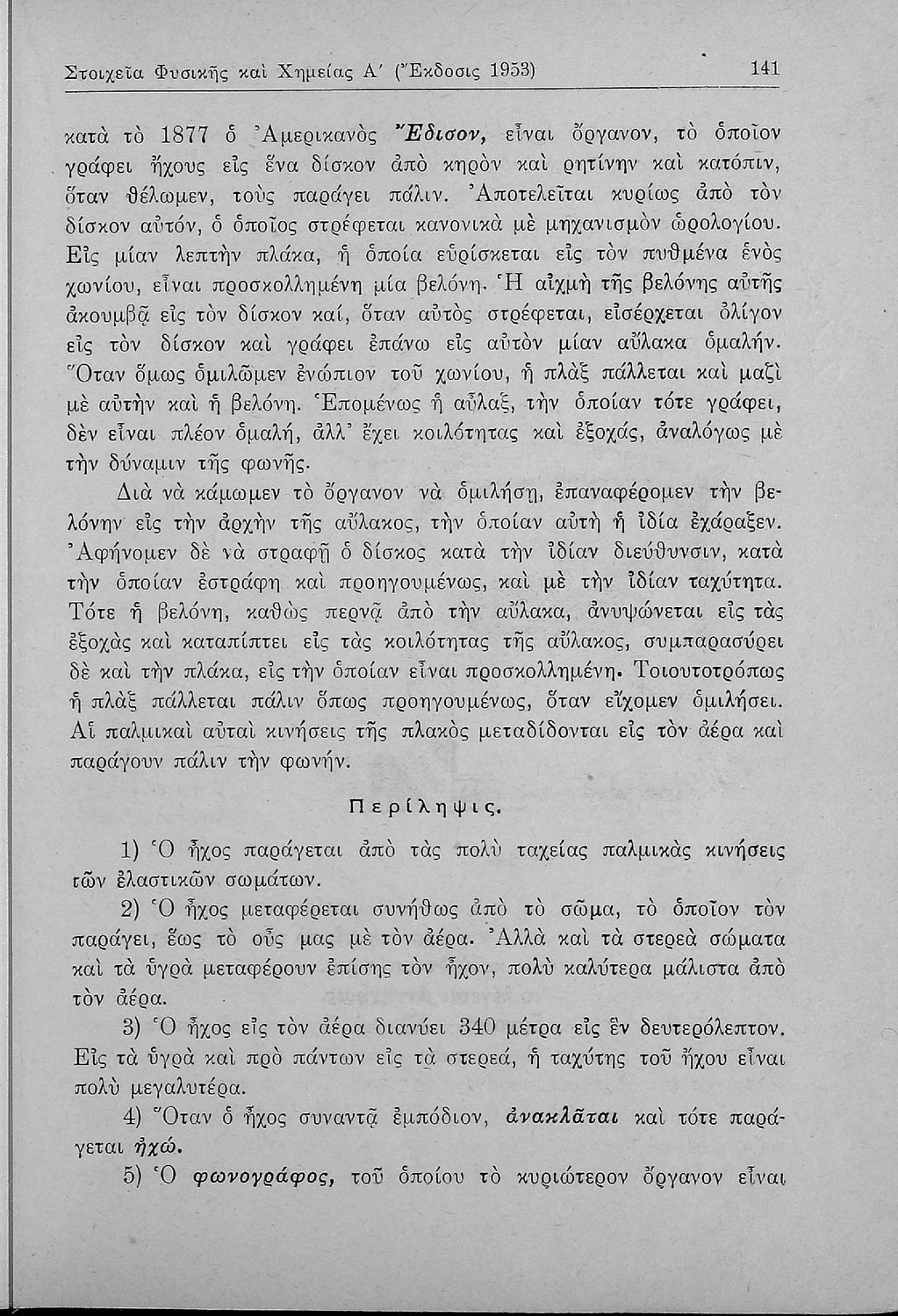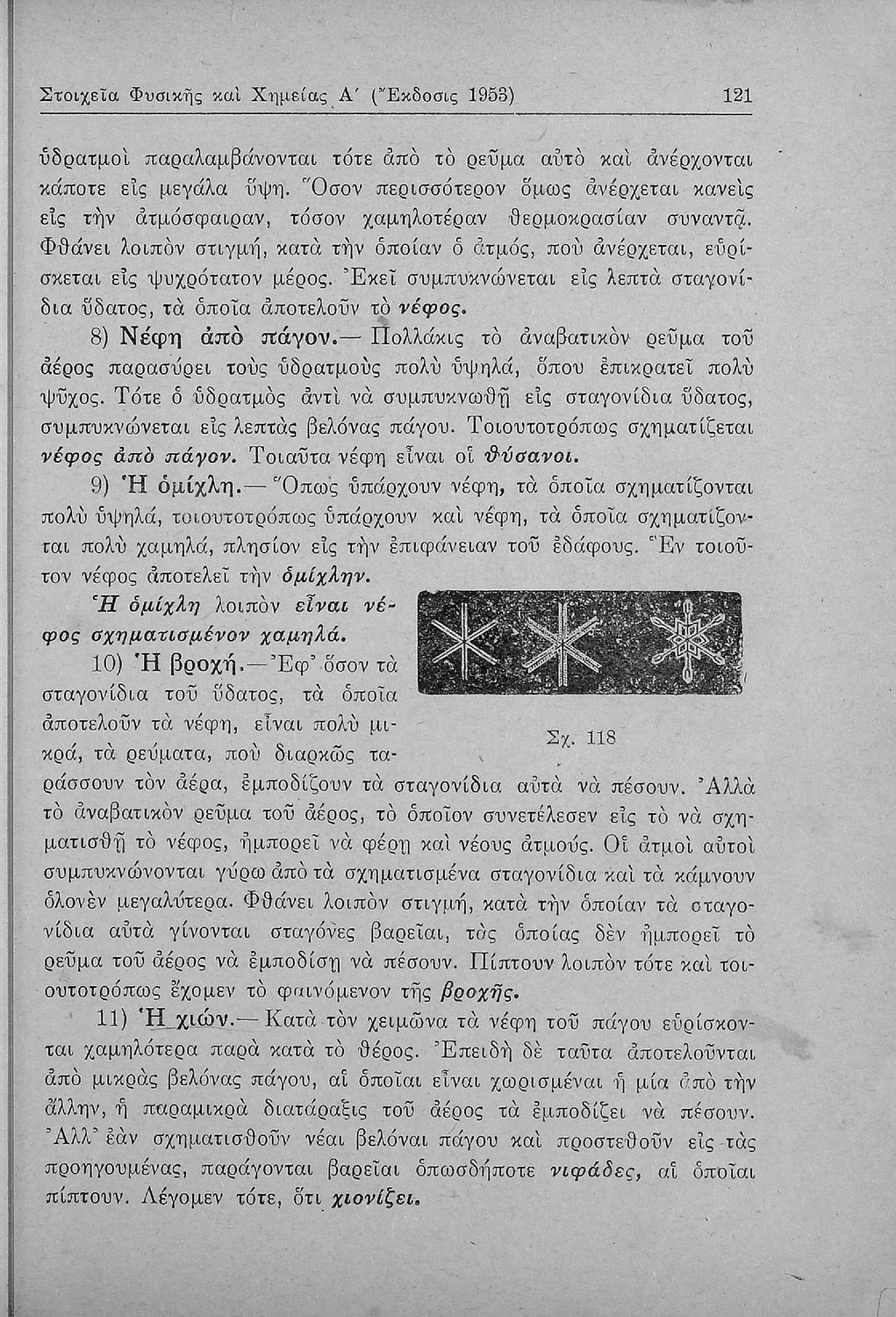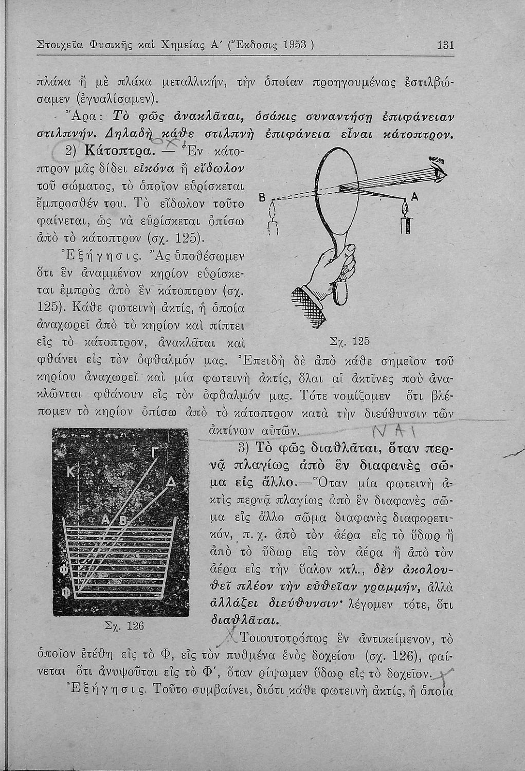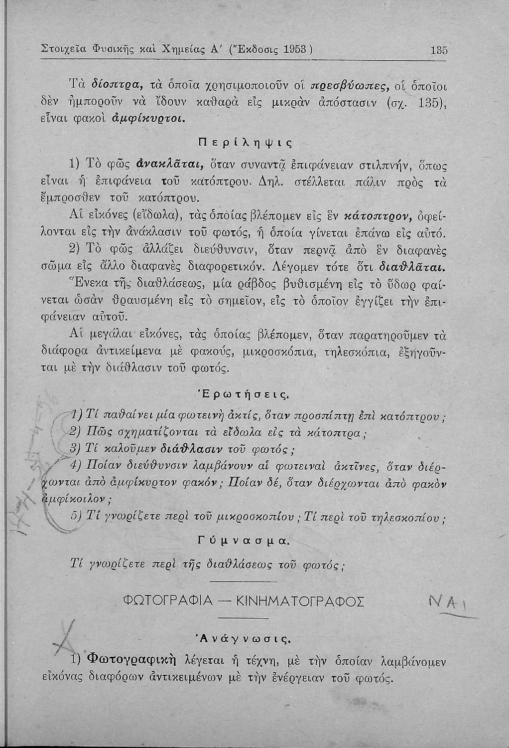 Βαθμίδα εκπαίδευσης: Δευτεροβάθμια Τάξη: Α' Γυμνασίου Μάθημα: Φυσική Γλώσσα: Απλή καθαρεύουσα Παρουσίαση περιεχομένου: Σχολικό εγχειρίδιο της Α΄ Γυμνασίου για το μάθημα της Φυσικής. Παρέχει βασικές γνώσεις της Φυσικής επιστήμης και της Χημείας. Αναλύει τα φαινόμενα της αδράνειας, της βαρύτητας, της υδροστατικής πίεσης κ.α. Όσον αφορά τη Χημεία αναφέρεται στις ιδιότητες των μετάλλων, τα οξέα, τις βάσεις και τα άλατα. Αναφέρεται στην πρακτική εφαρμογή της φυσικής και της χημείας στην καθημερινότητά. Επίσης, περιλαμβάνει πολλά από τα όργανα, που χρησιμοποιούνται στη φυσική. Περιέχει εικόνες και σχεδιαγράμματα τα οποία βοηθούν τη διδασκαλία. |