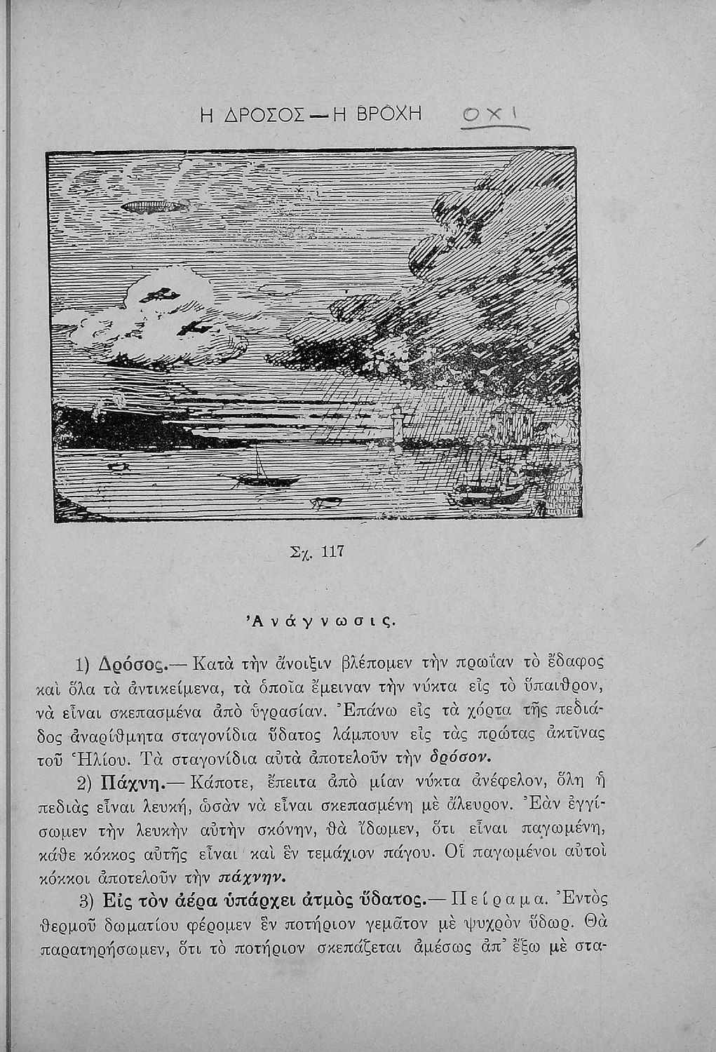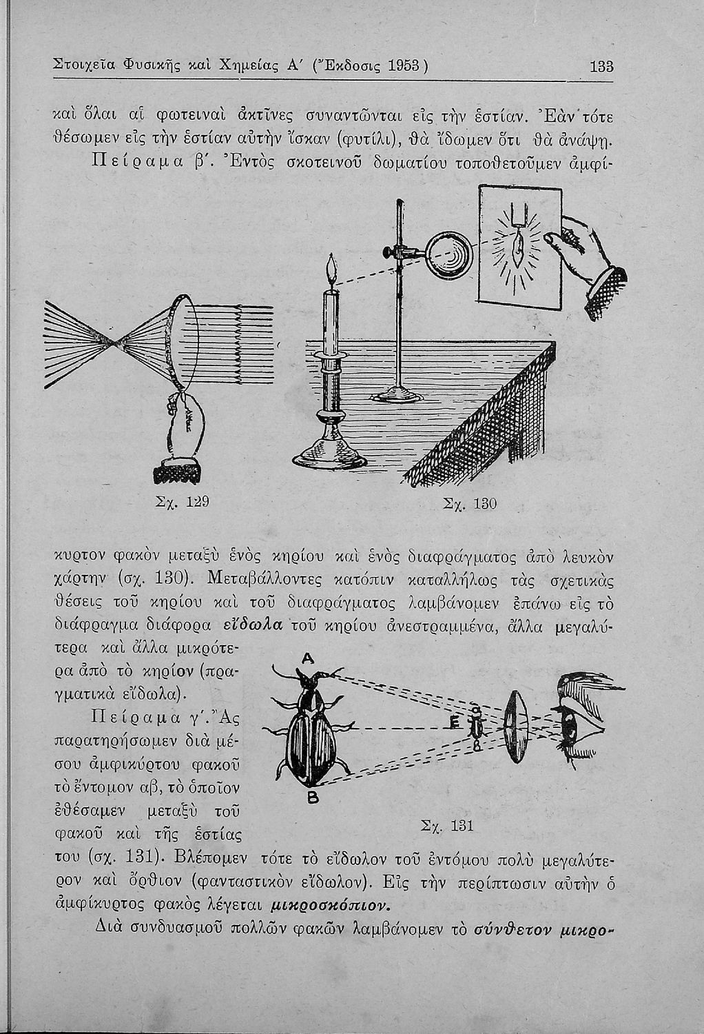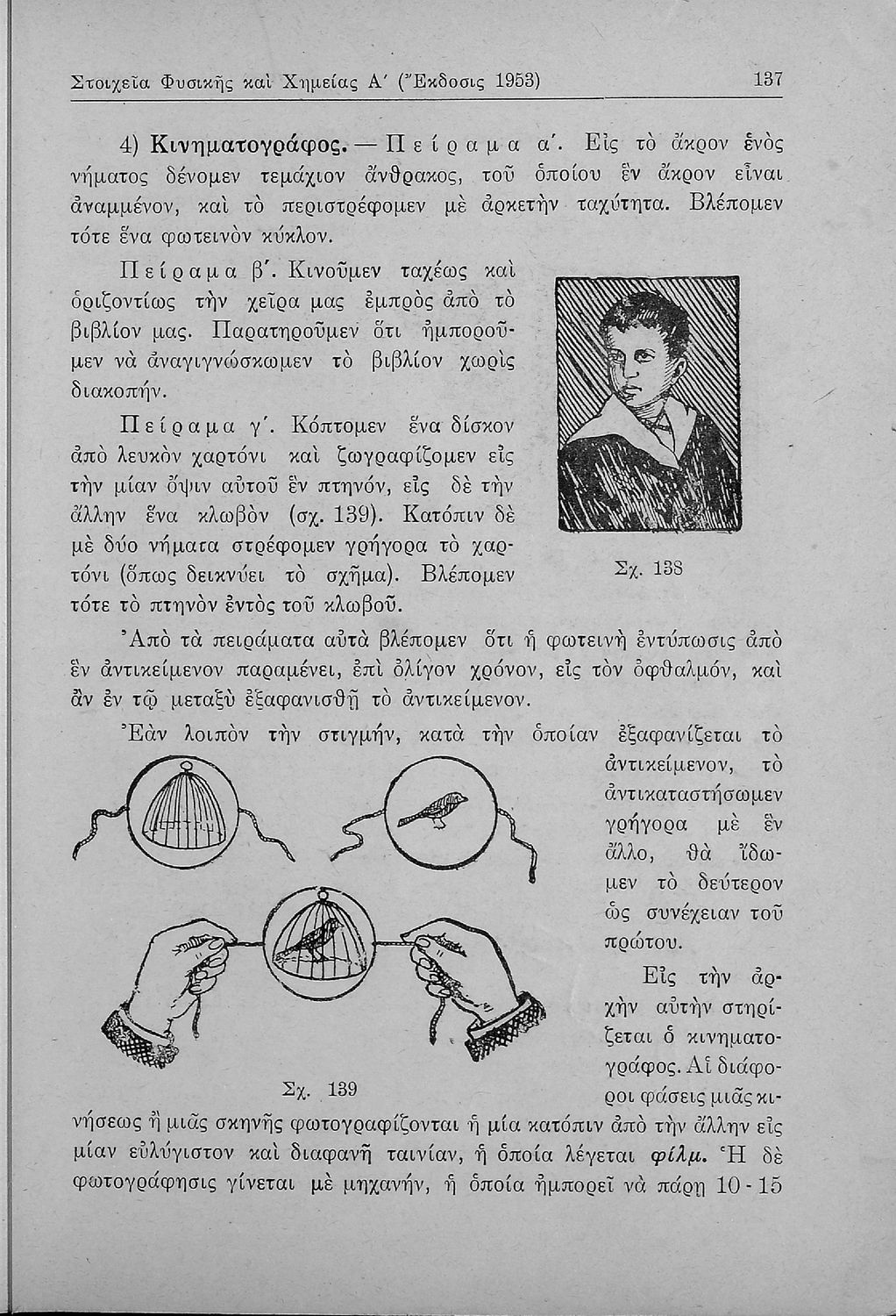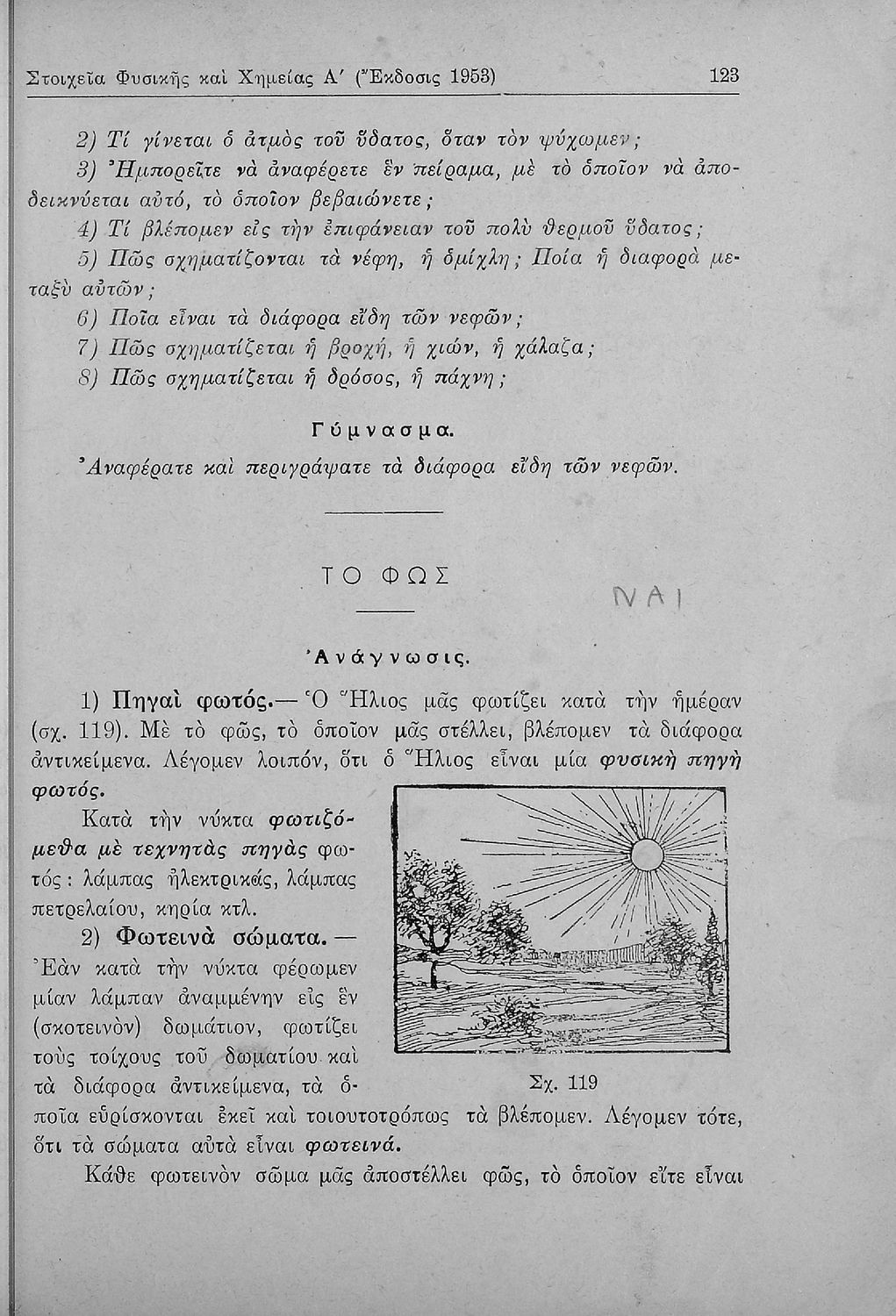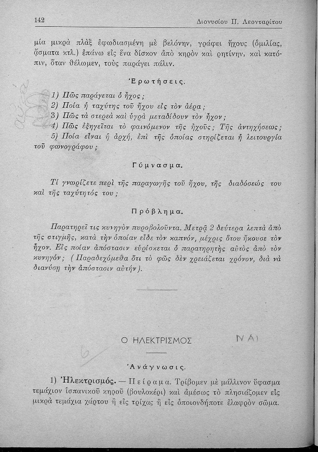 Βαθμίδα εκπαίδευσης: Δευτεροβάθμια Τάξη: Α' Γυμνασίου Μάθημα: Φυσική Γλώσσα: Απλή καθαρεύουσα Παρουσίαση περιεχομένου: Σχολικό εγχειρίδιο της Α΄ Γυμνασίου για το μάθημα της Φυσικής. Παρέχει βασικές γνώσεις της Φυσικής επιστήμης και της Χημείας. Αναλύει τα φαινόμενα της αδράνειας, της βαρύτητας, της υδροστατικής πίεσης κ.α. Όσον αφορά τη Χημεία αναφέρεται στις ιδιότητες των μετάλλων, τα οξέα, τις βάσεις και τα άλατα. Αναφέρεται στην πρακτική εφαρμογή της φυσικής και της χημείας στην καθημερινότητά. Επίσης, περιλαμβάνει πολλά από τα όργανα, που χρησιμοποιούνται στη φυσική. Περιέχει εικόνες και σχεδιαγράμματα τα οποία βοηθούν τη διδασκαλία. |