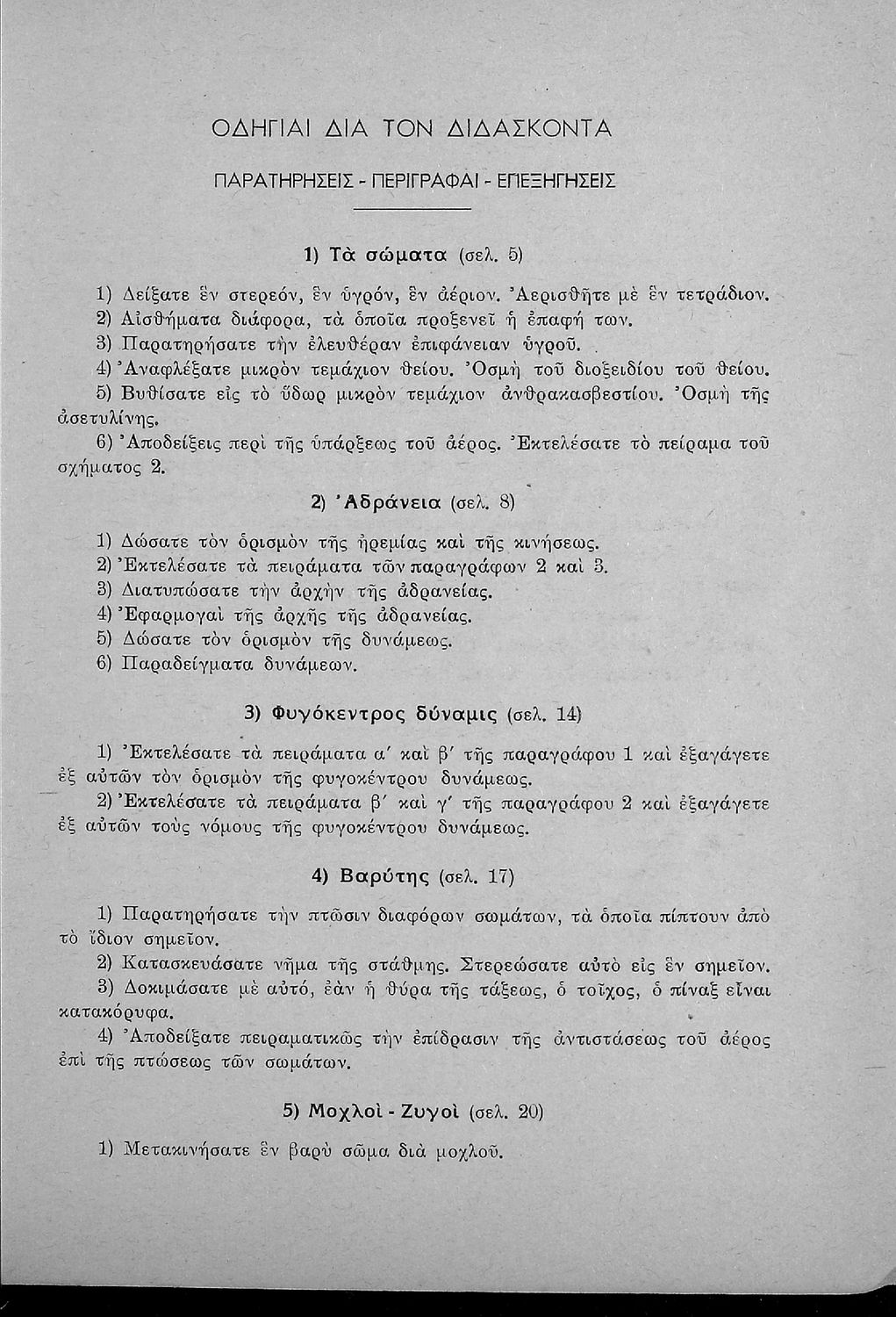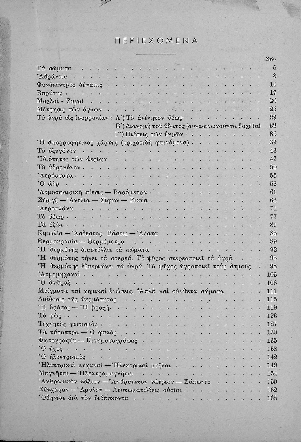 Βαθμίδα εκπαίδευσης: Δευτεροβάθμια Τάξη: Α' Γυμνασίου Μάθημα: Φυσική Γλώσσα: Απλή καθαρεύουσα Παρουσίαση περιεχομένου: Σχολικό εγχειρίδιο της Α΄ Γυμνασίου για το μάθημα της Φυσικής. Παρέχει βασικές γνώσεις της Φυσικής επιστήμης και της Χημείας. Αναλύει τα φαινόμενα της αδράνειας, της βαρύτητας, της υδροστατικής πίεσης κ.α. Όσον αφορά τη Χημεία αναφέρεται στις ιδιότητες των μετάλλων, τα οξέα, τις βάσεις και τα άλατα. Αναφέρεται στην πρακτική εφαρμογή της φυσικής και της χημείας στην καθημερινότητά. Επίσης, περιλαμβάνει πολλά από τα όργανα, που χρησιμοποιούνται στη φυσική. Περιέχει εικόνες και σχεδιαγράμματα τα οποία βοηθούν τη διδασκαλία. |