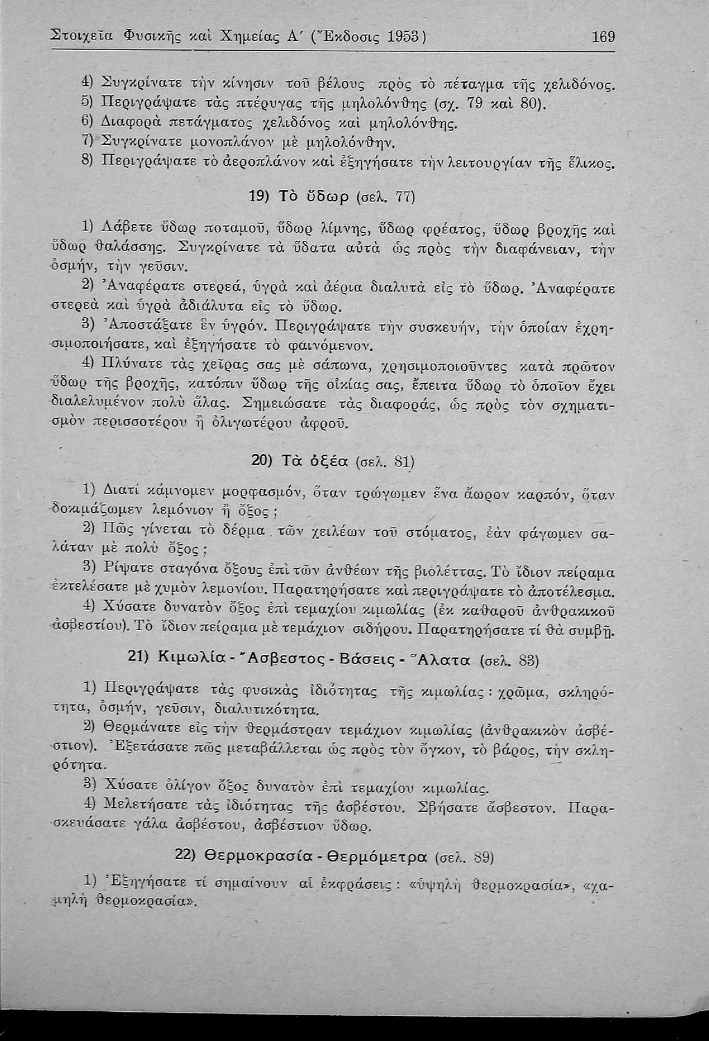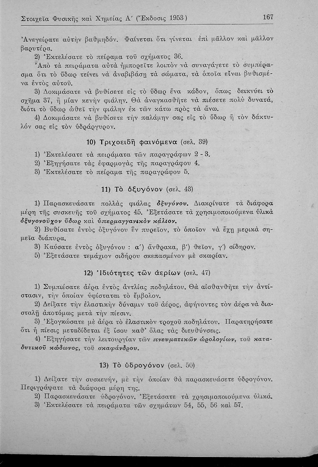 Σχολικό εγχειρίδιο της Α΄ Γυμνασίου για το μάθημα της Φυσικής. Παρέχει βασικές γνώσεις της Φυσικής επιστήμης και της Χημείας. Αναλύει τα φαινόμενα της αδράνειας, της βαρύτητας, της υδροστατικής πίεσης κ.α. Όσον αφορά τη Χημεία αναφέρεται στις ιδιότητες των μετάλλων, τα οξέα, τις βάσεις και τα άλατα. Αναφέρεται στην πρακτική εφαρμογή της φυσικής και της χημείας στην καθημερινότητά. Επίσης, περιλαμβάνει πολλά από τα όργανα, που χρησιμοποιούνται στη φυσική. Περιέχει εικόνες και σχεδιαγράμματα τα οποία βοηθούν τη διδασκαλία.