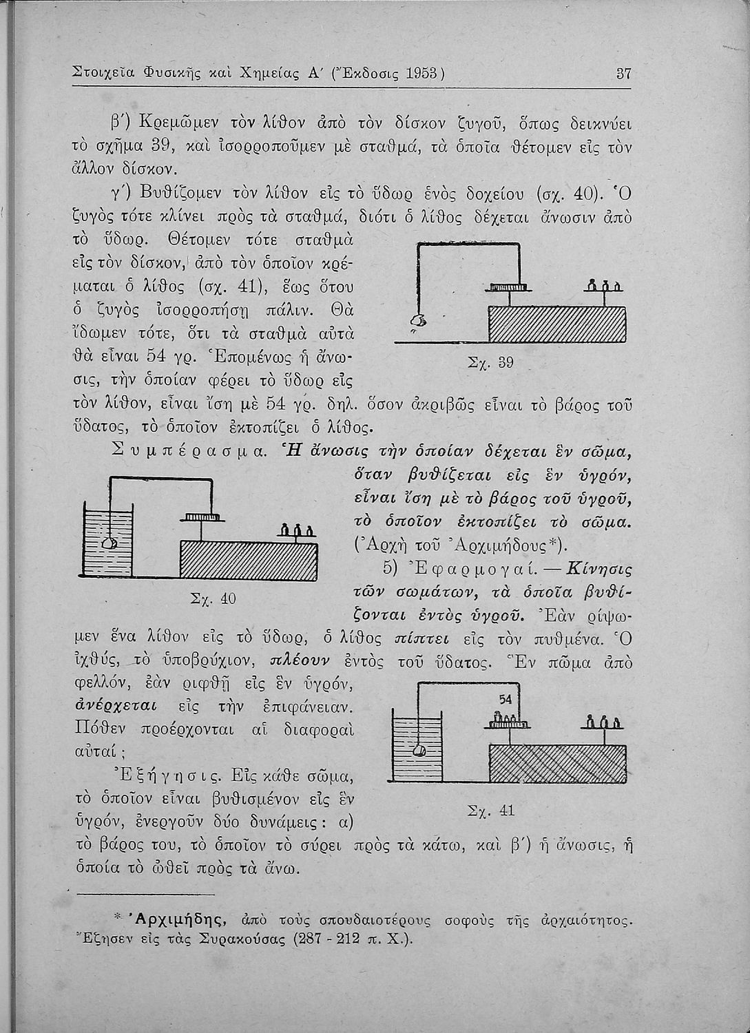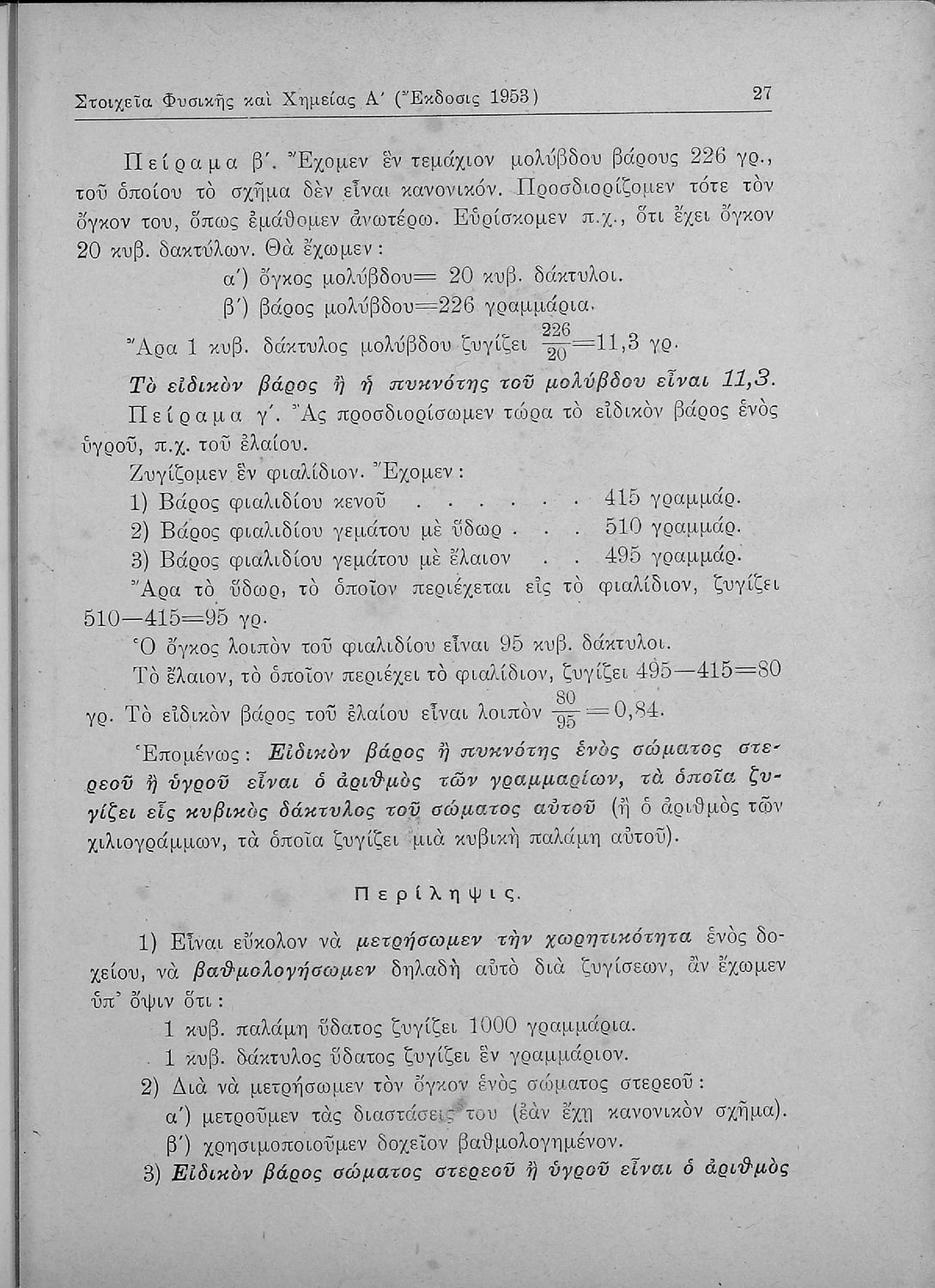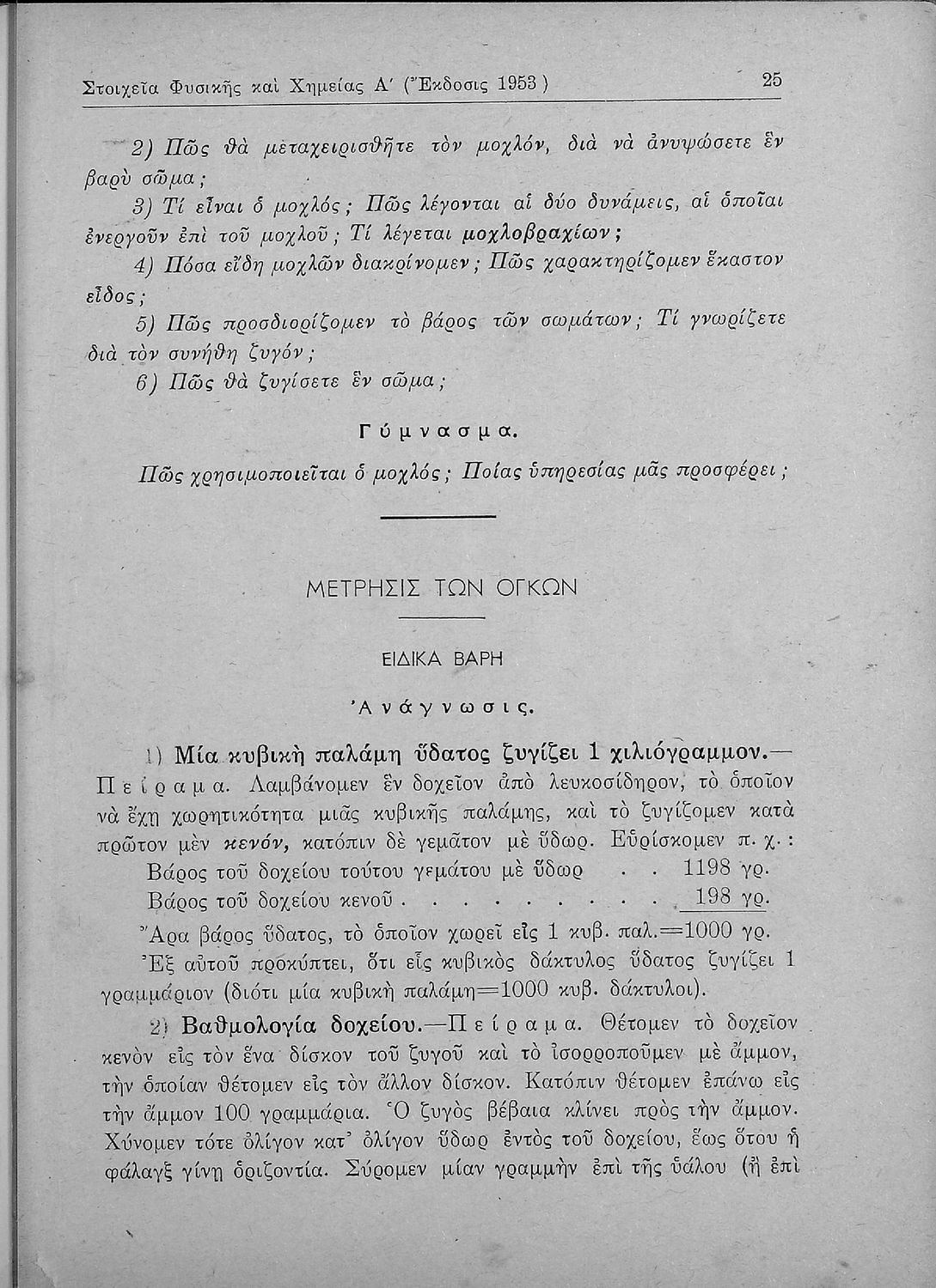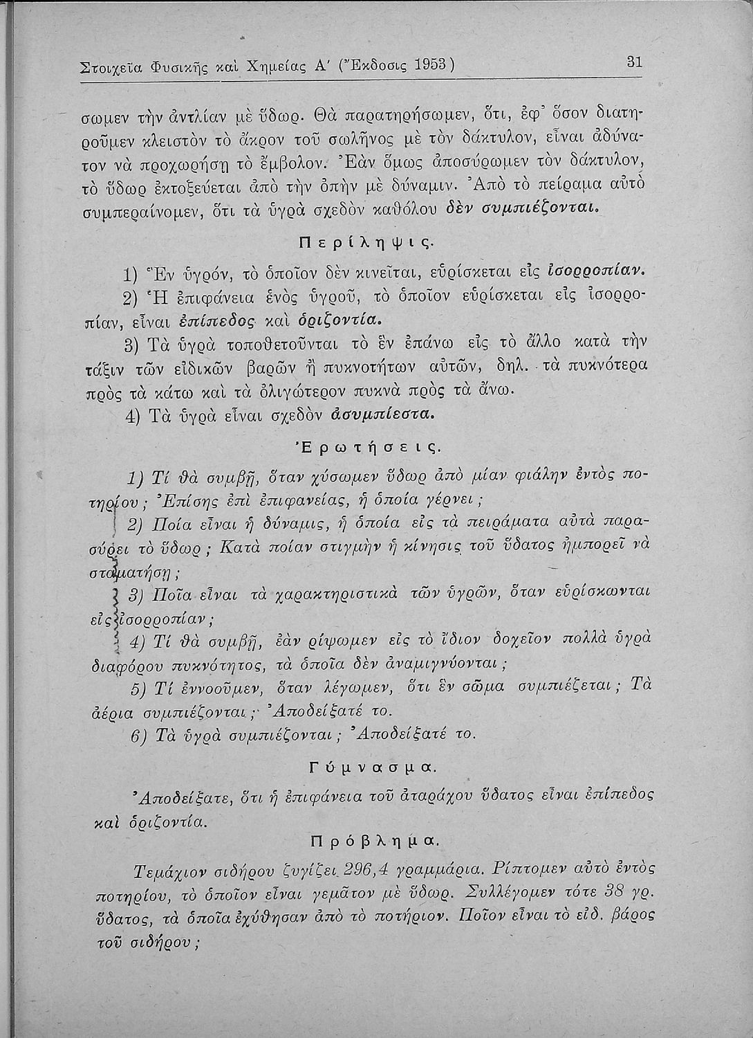 Σχολικό εγχειρίδιο Φυσικής και Χημείας που προσδιορίζει τη μηχανική στερεών σωμάτων, αναφέρει τις ιδιότητες ποικίλων στοιχείων της φύσης (οξυγόνο, υδρογόνο, αέρα, νερό) περιγράφοντας τις χημικές ενώσεις που ...