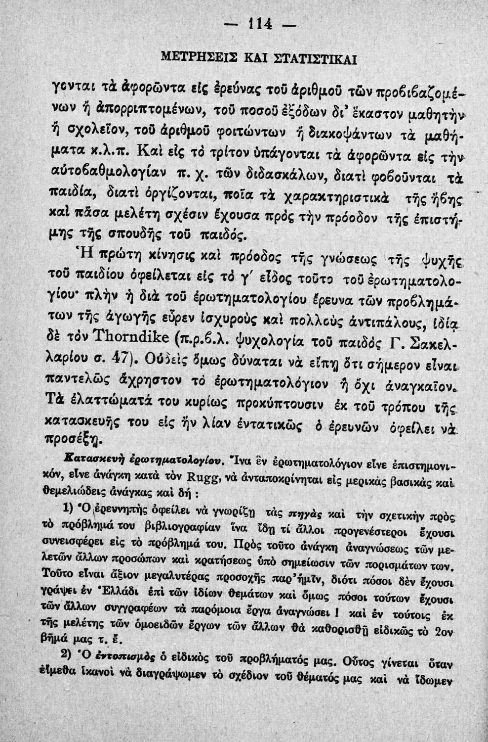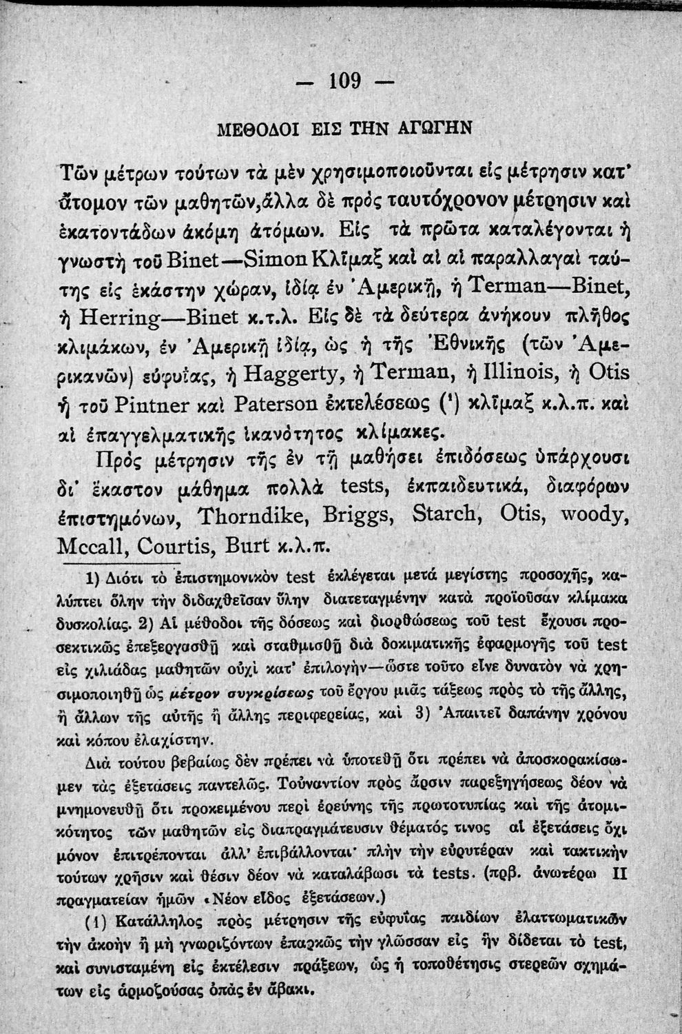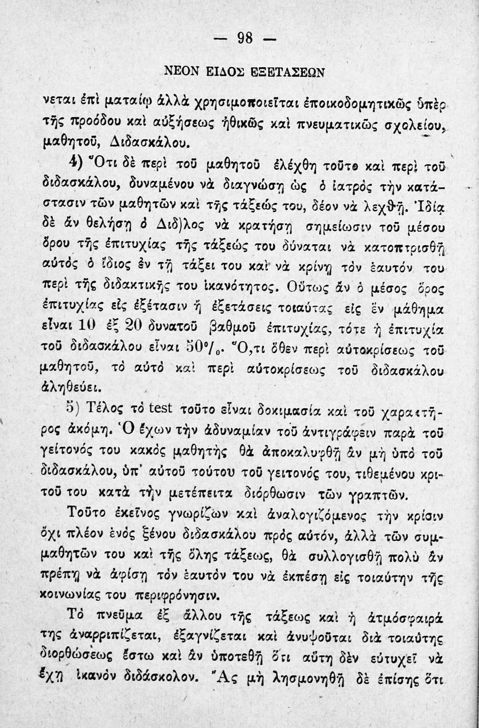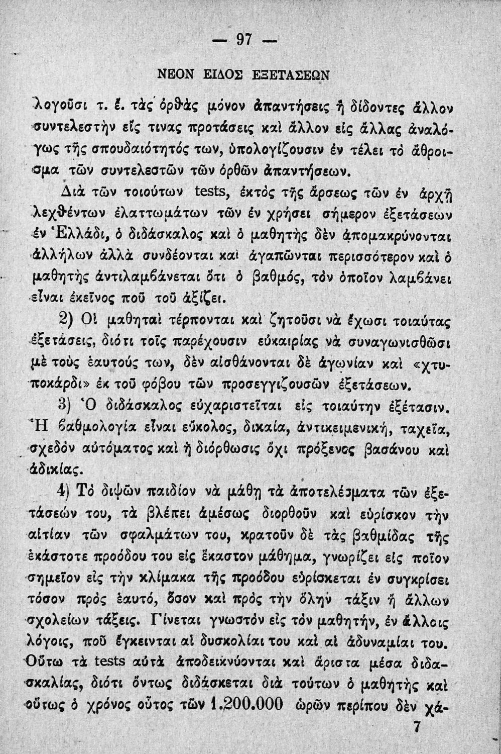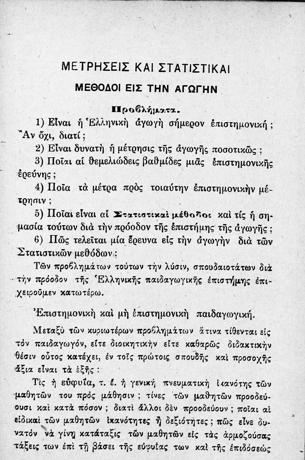 Παρουσίαση περιεχομένου: Παιδαγωγικό βοήθημα που αναφέρεται στη δημοκρατική μέθοδο εργασίας στο σχολείο, στο νέο είδος εξετάσεων, στις μετρήσεις και στατιστικές μεθόδους καθώς και στις πνευματικές και παιδευτικές μετρήσεις των Ελληνόπουλων. Ο συγγραφέας ήταν Επιμελητής της Πειραματικής Παιδαγωγικής του Πανεπιστημίου Αθηνών.