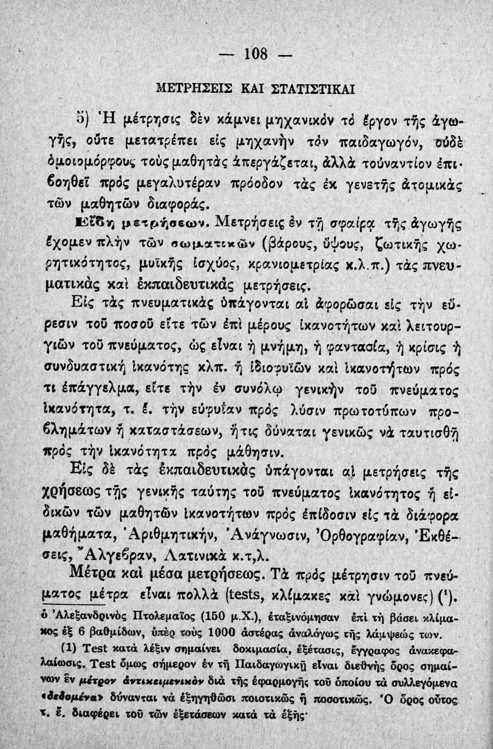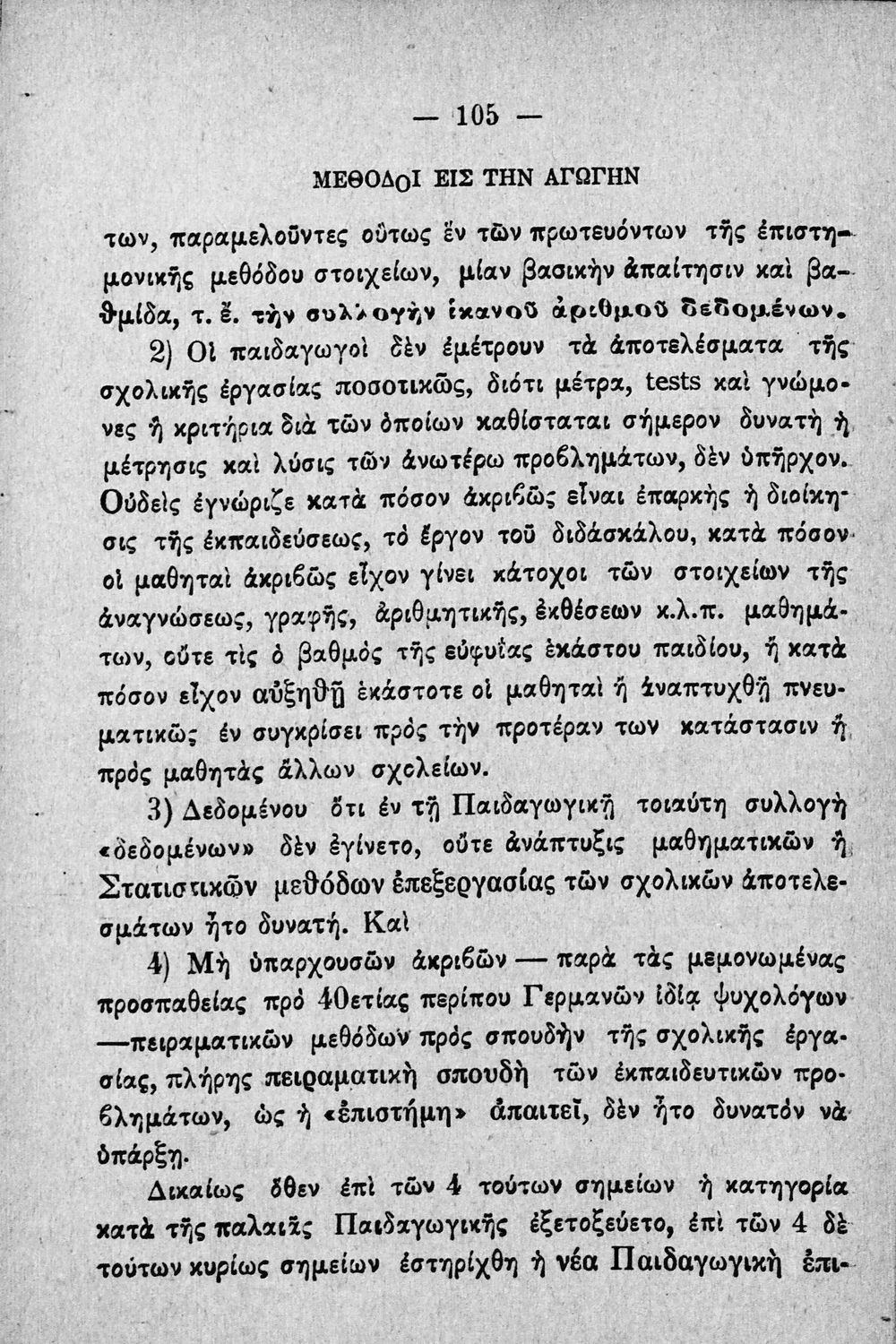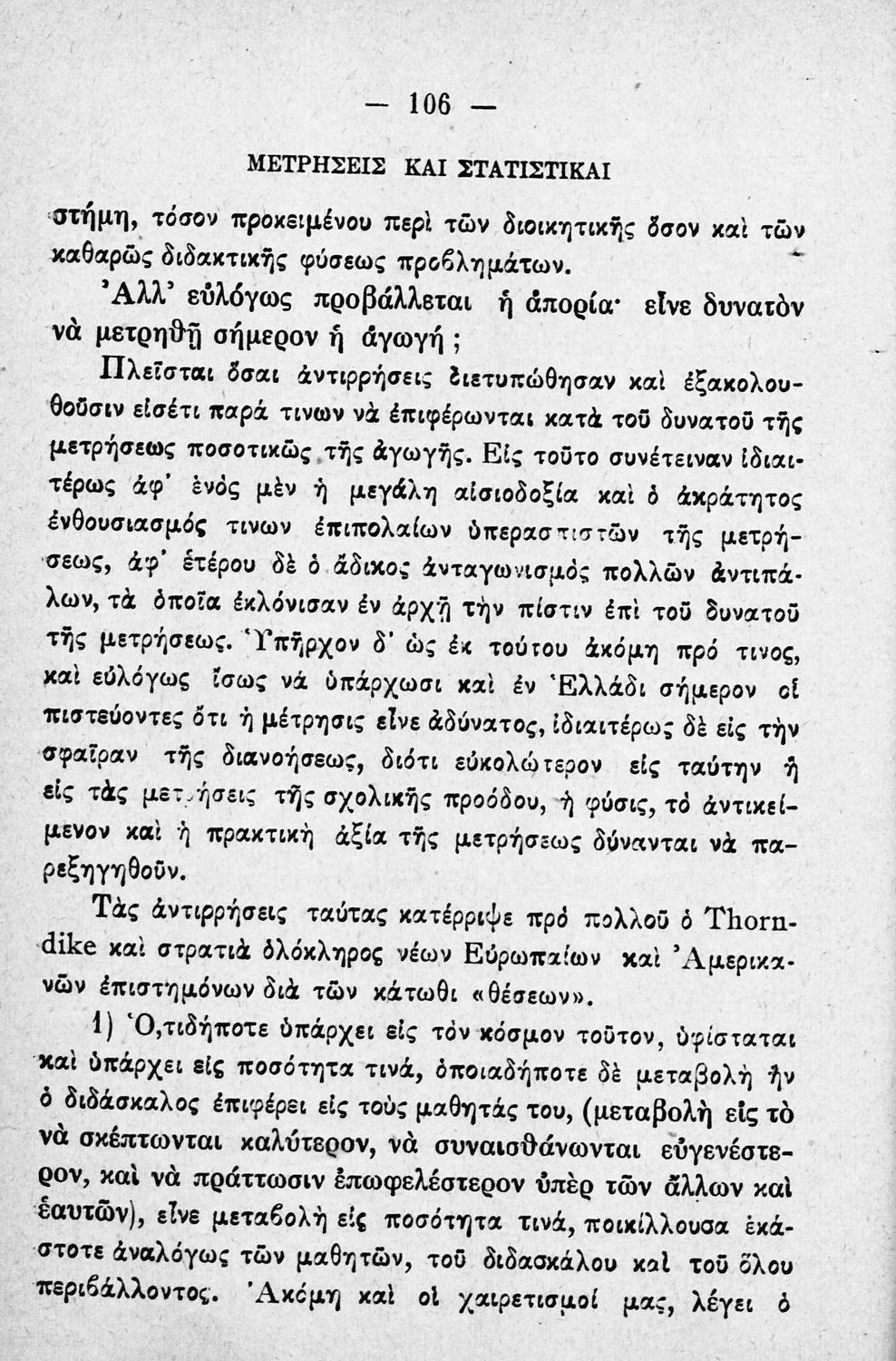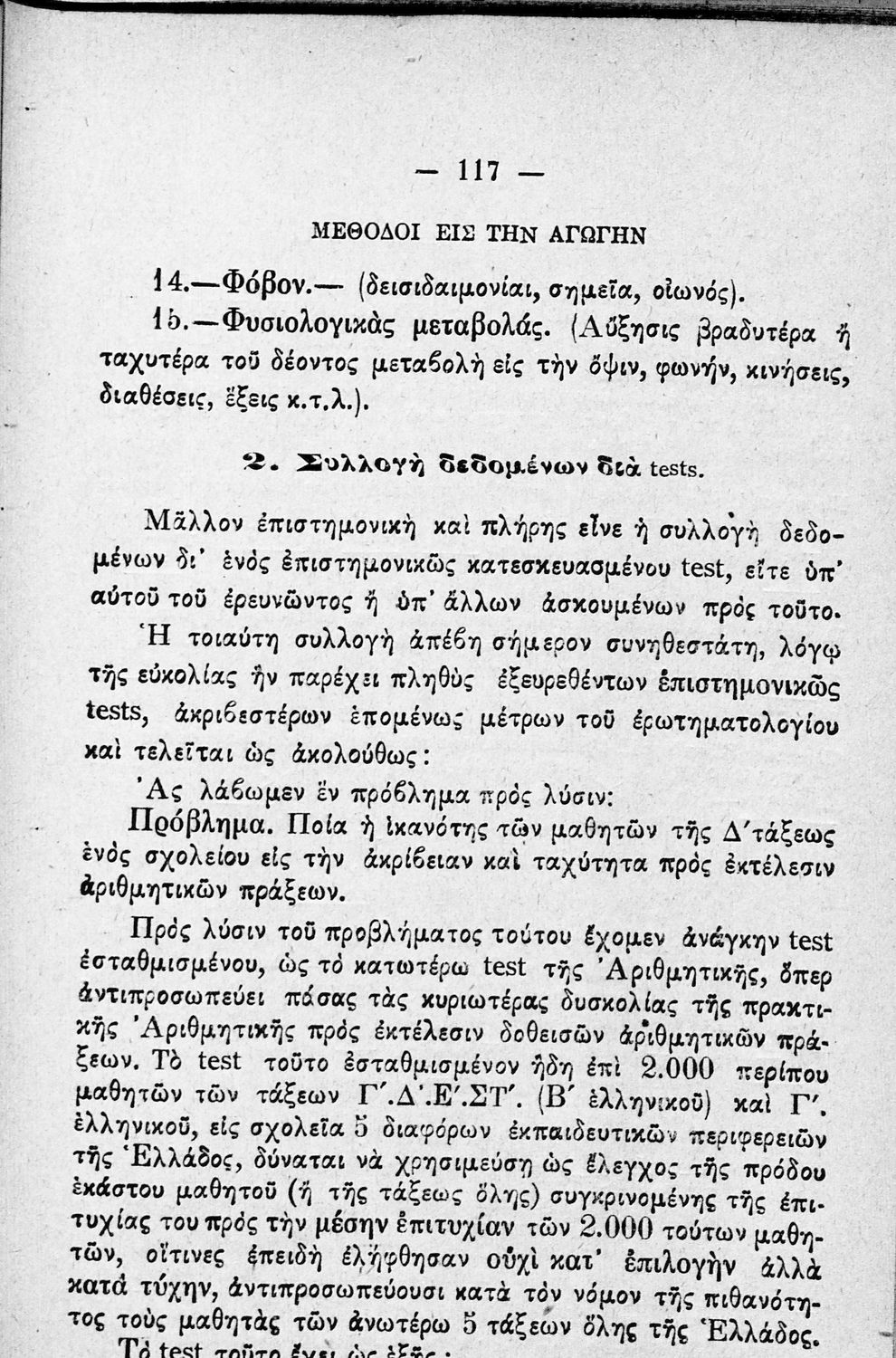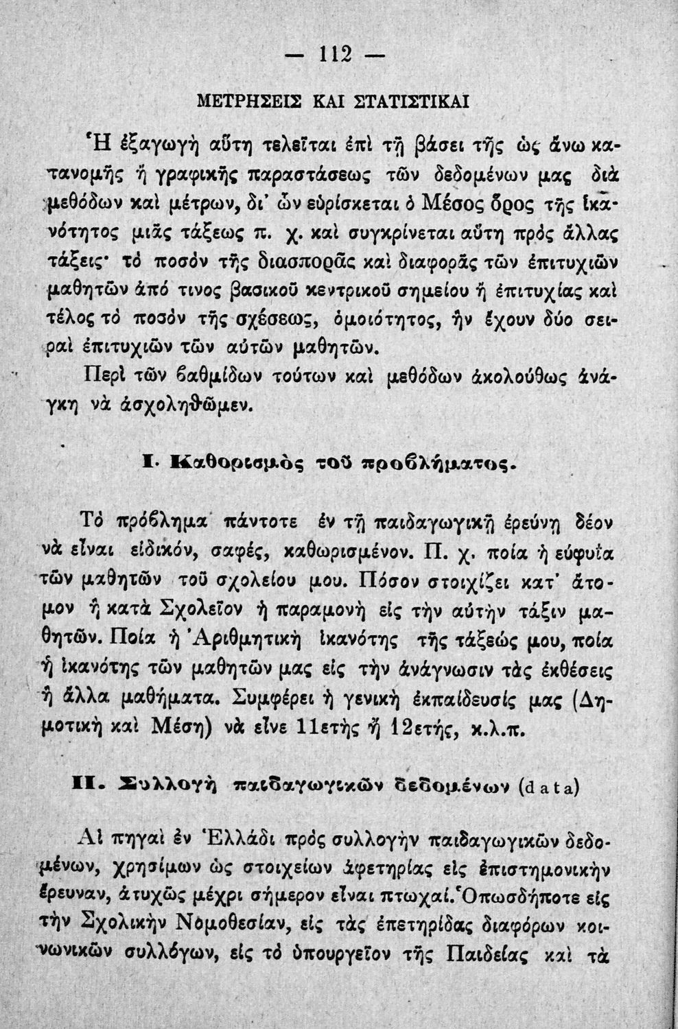 Παρουσίαση περιεχομένου: Παιδαγωγικό βοήθημα που αναφέρεται στη δημοκρατική μέθοδο εργασίας στο σχολείο, στο νέο είδος εξετάσεων, στις μετρήσεις και στατιστικές μεθόδους καθώς και στις πνευματικές και παιδευτικές μετρήσεις των Ελληνόπουλων. Ο συγγραφέας ήταν Επιμελητής της Πειραματικής Παιδαγωγικής του Πανεπιστημίου Αθηνών.