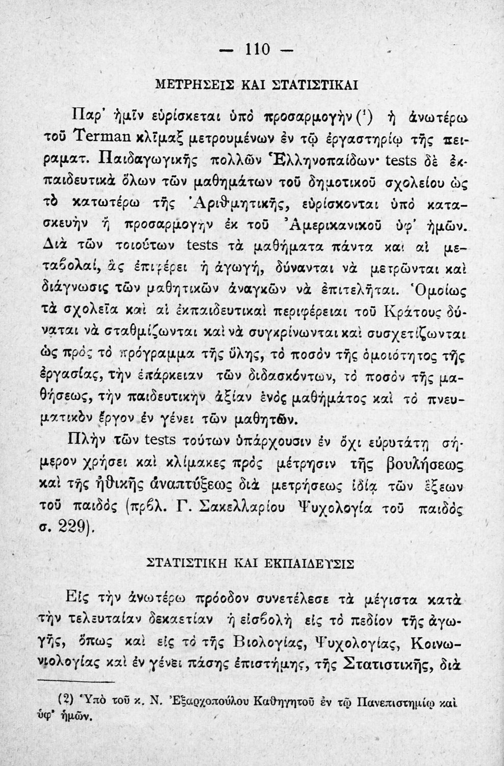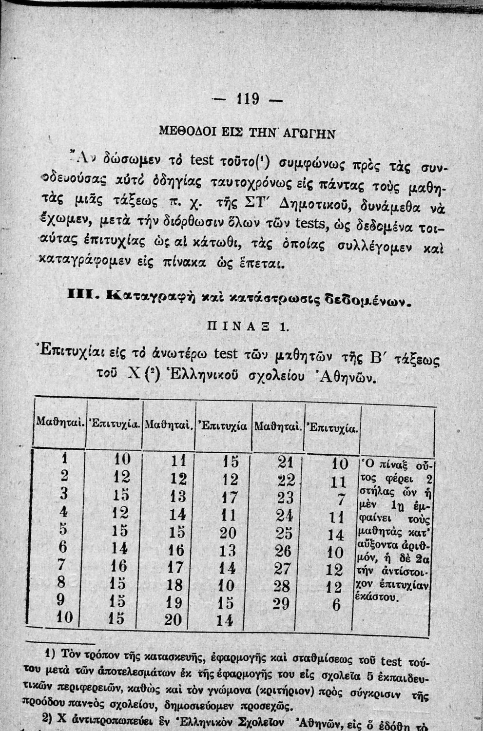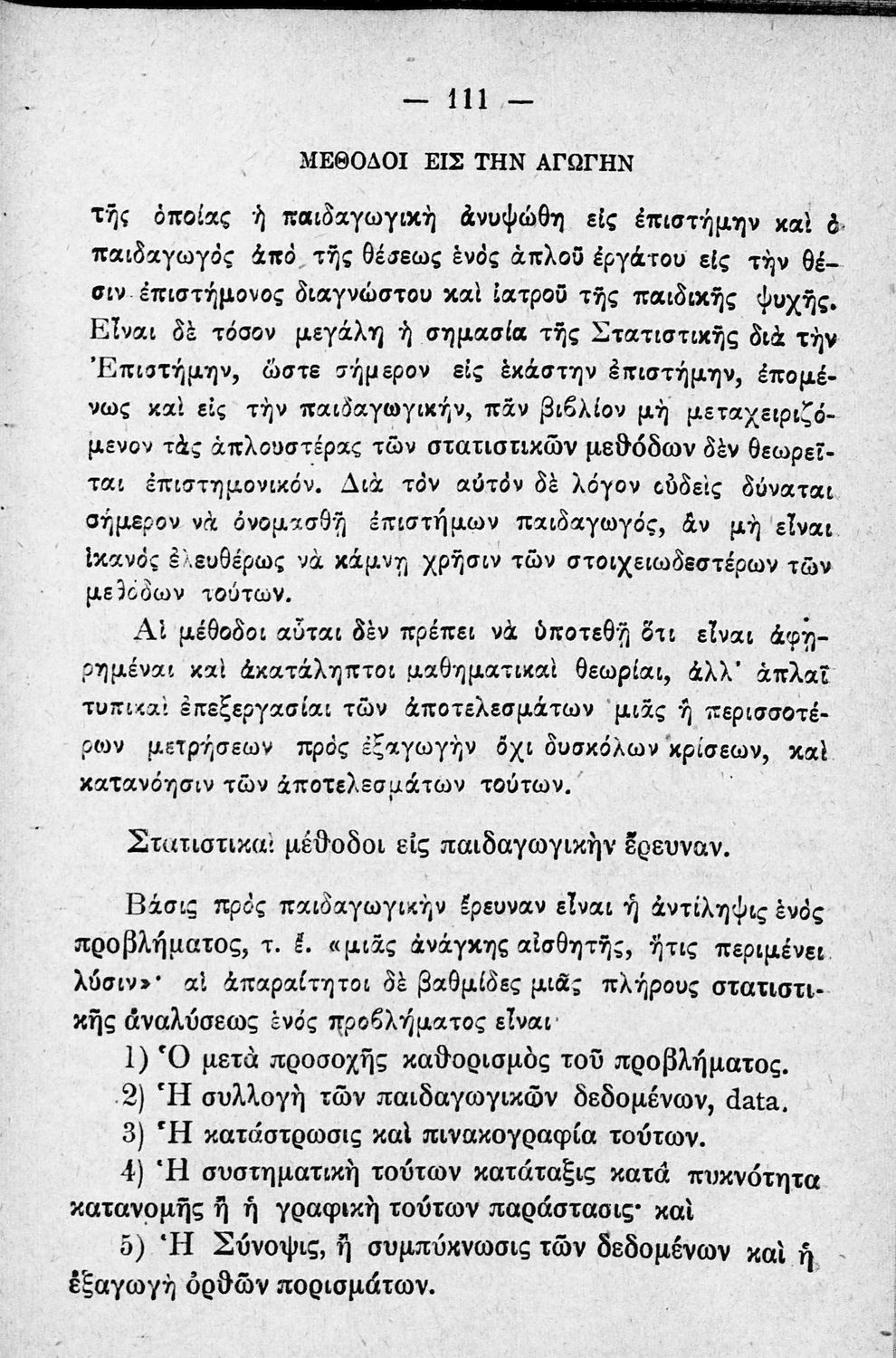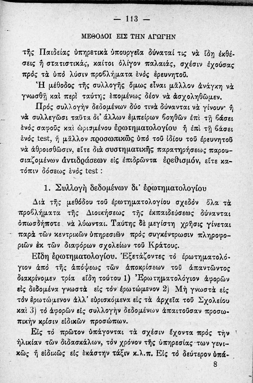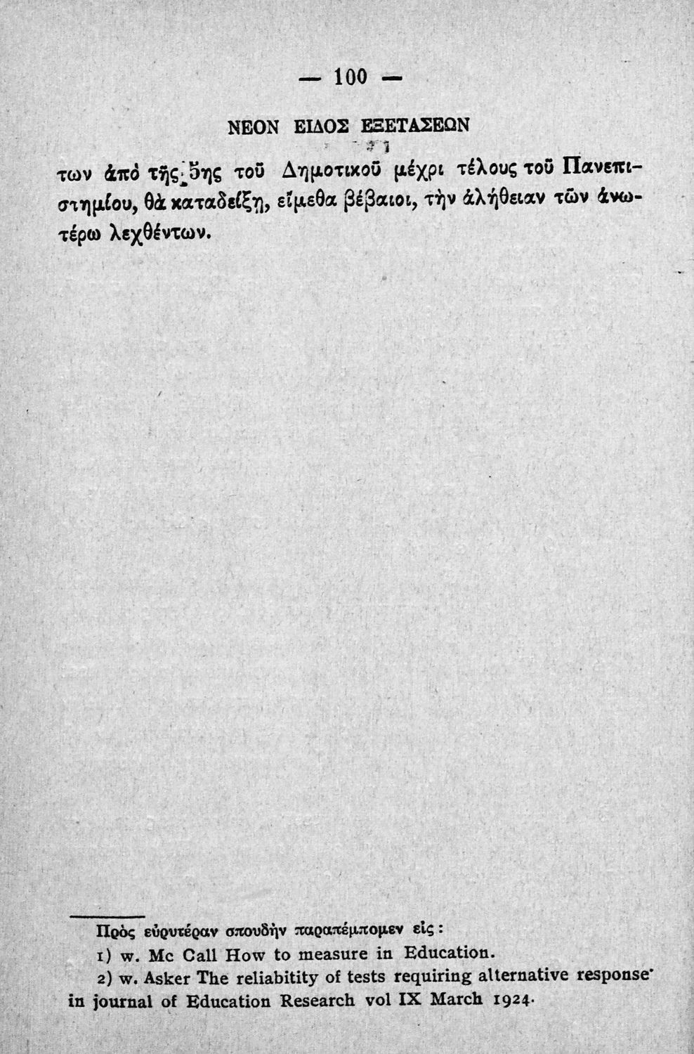 Παρουσίαση περιεχομένου: Παιδαγωγικό βοήθημα που αναφέρεται στη δημοκρατική μέθοδο εργασίας στο σχολείο, στο νέο είδος εξετάσεων, στις μετρήσεις και στατιστικές μεθόδους καθώς και στις πνευματικές και παιδευτικές μετρήσεις των Ελληνόπουλων. Ο συγγραφέας ήταν Επιμελητής της Πειραματικής Παιδαγωγικής του Πανεπιστημίου Αθηνών.