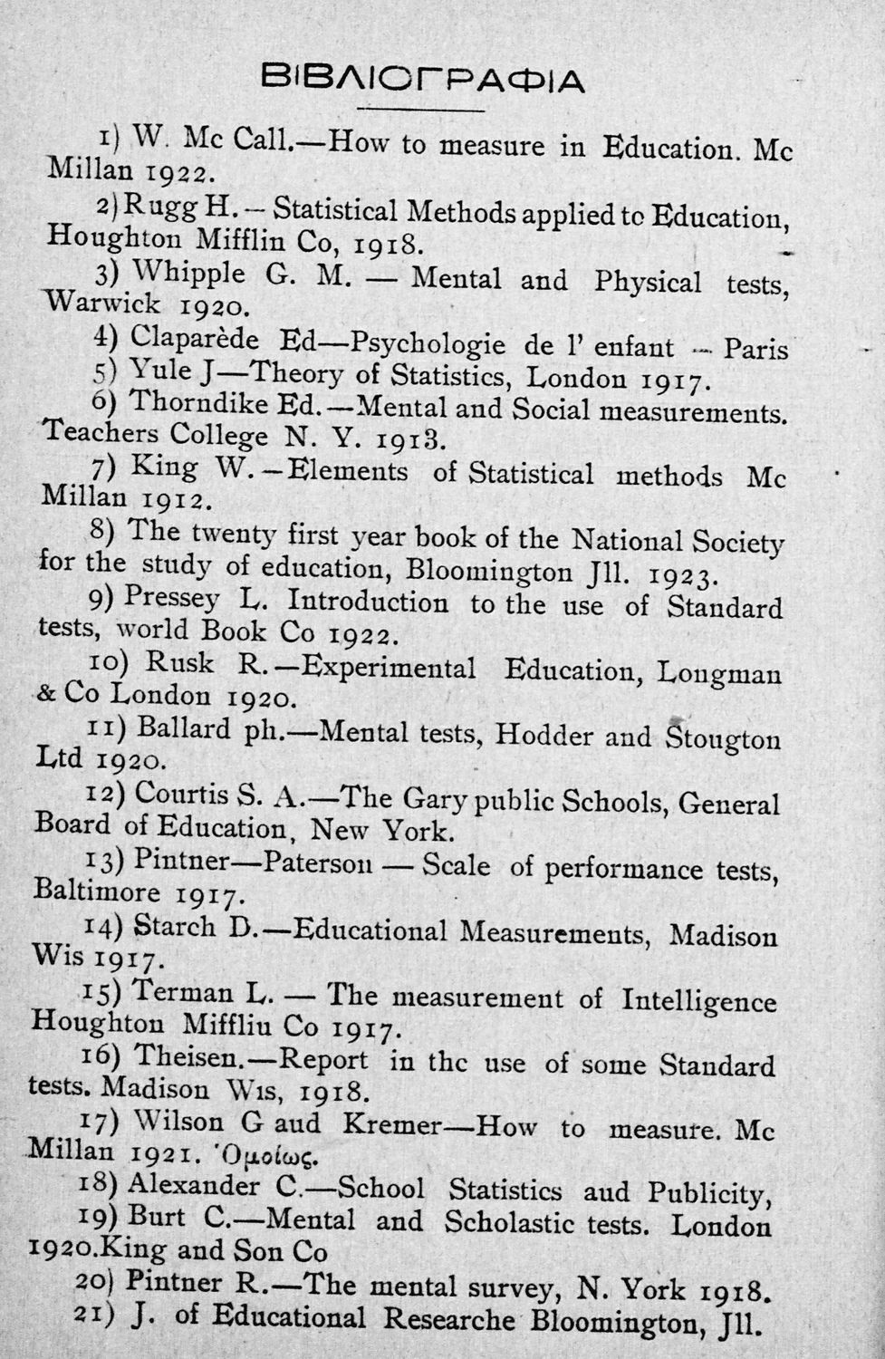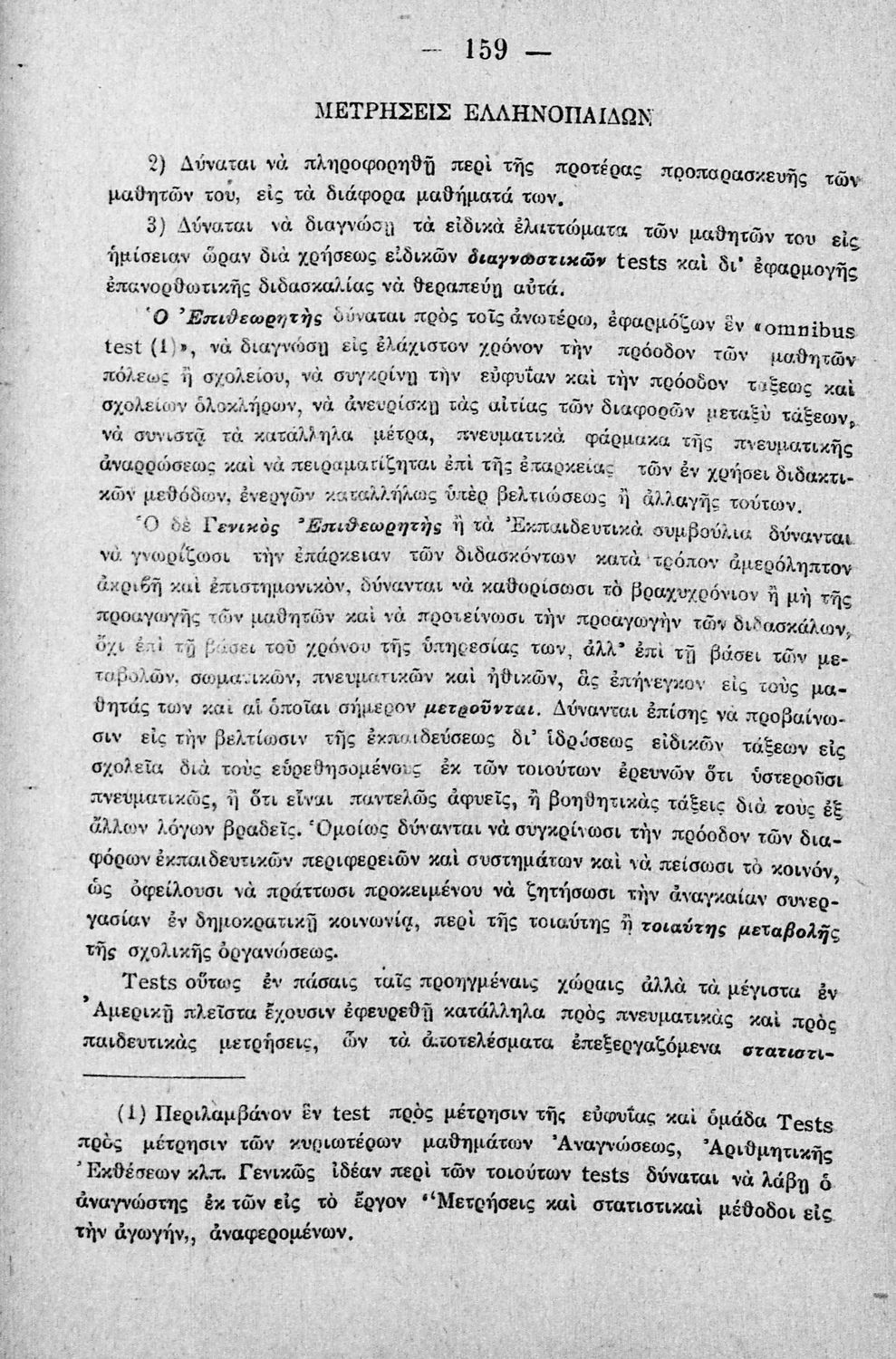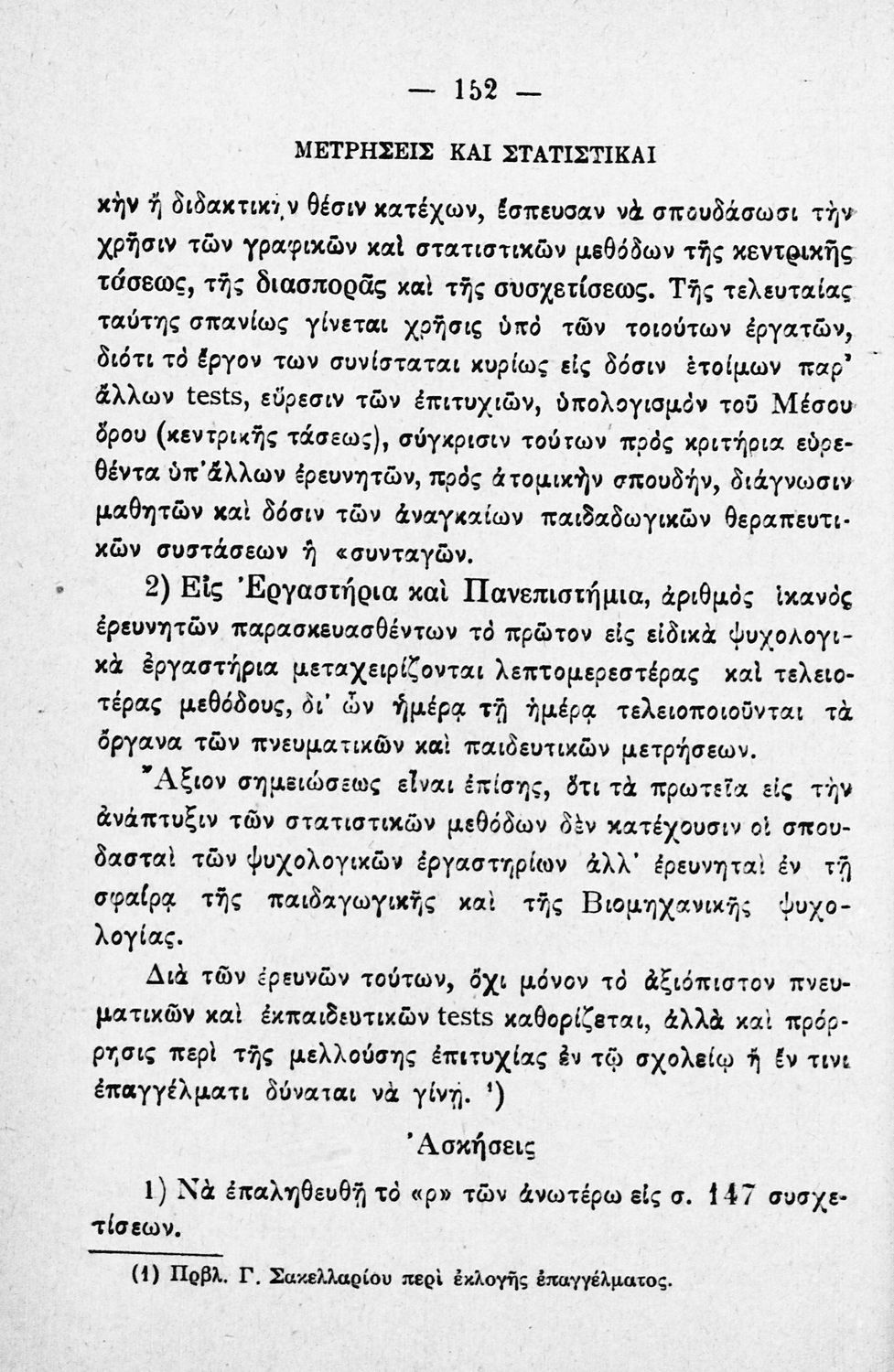 Παιδαγωγικό βοήθημα που αναφέρεται στη δημοκρατική μέθοδο εργασίας στο σχολείο, στο νέο είδος εξετάσεων, στις μετρήσεις και στατιστικές μεθόδους καθώς και στις πνευματικές και παιδευτικές μετρήσεις των Ελληνόπουλων. Ο συγγραφέας ήταν Επιμελητής της Πειραματικής Παιδαγωγικής του Πανεπιστημίου Αθηνών.