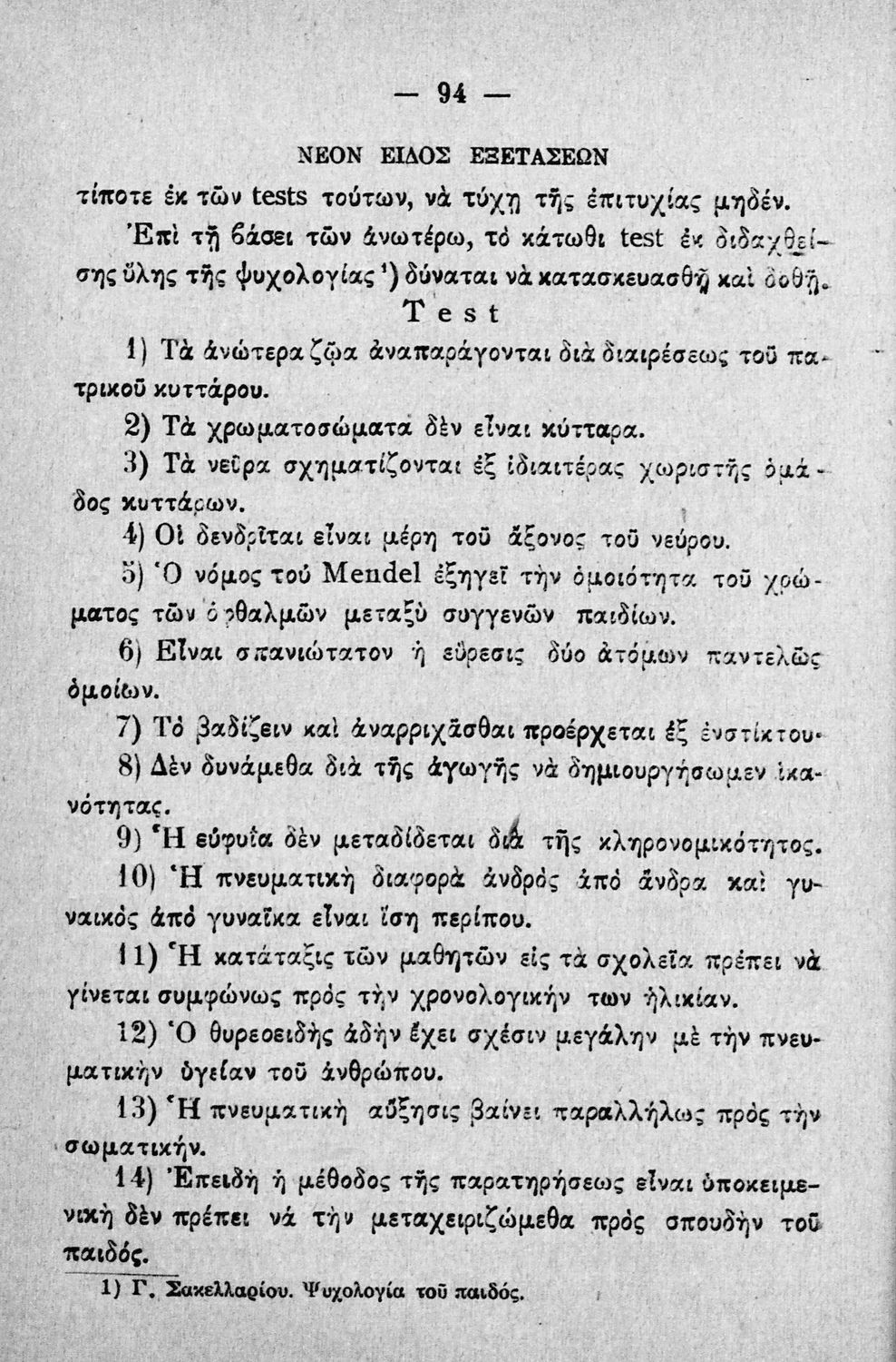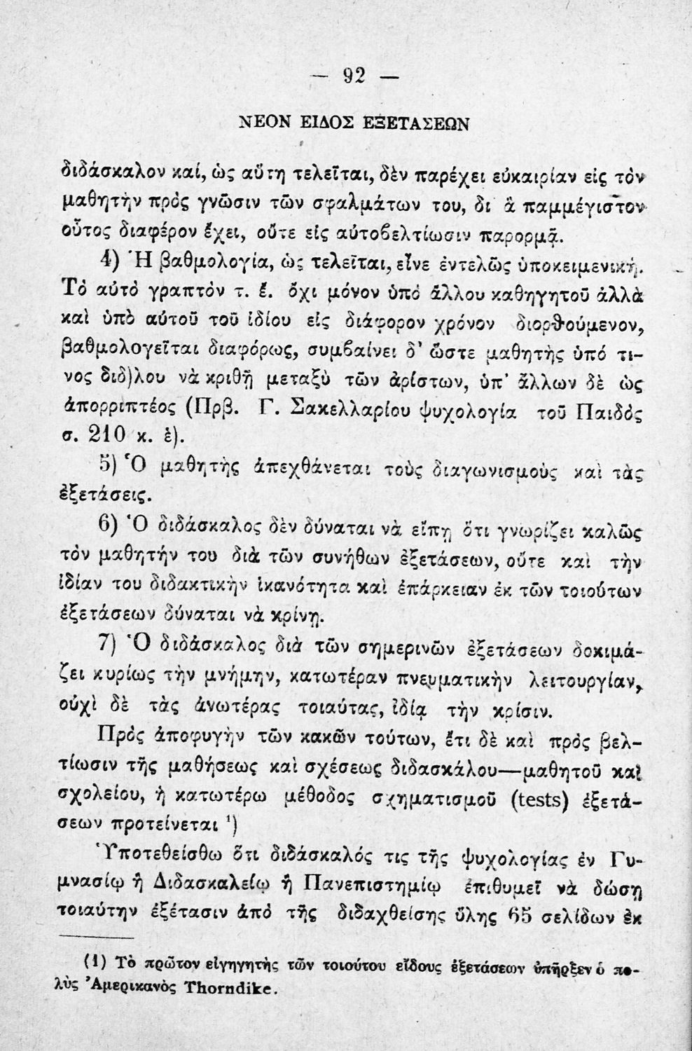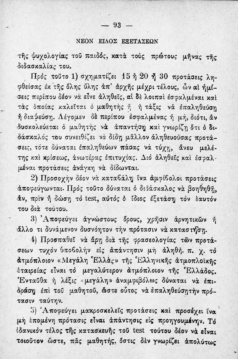 Παιδαγωγικό βοήθημα που αναφέρεται στη δημοκρατική μέθοδο εργασίας στο σχολείο, στο νέο είδος εξετάσεων, στις μετρήσεις και στατιστικές μεθόδους καθώς και στις πνευματικές και παιδευτικές μετρήσεις των Ελληνόπουλων. Ο συγγραφέας ήταν Επιμελητής της Πειραματικής Παιδαγωγικής του Πανεπιστημίου Αθηνών.