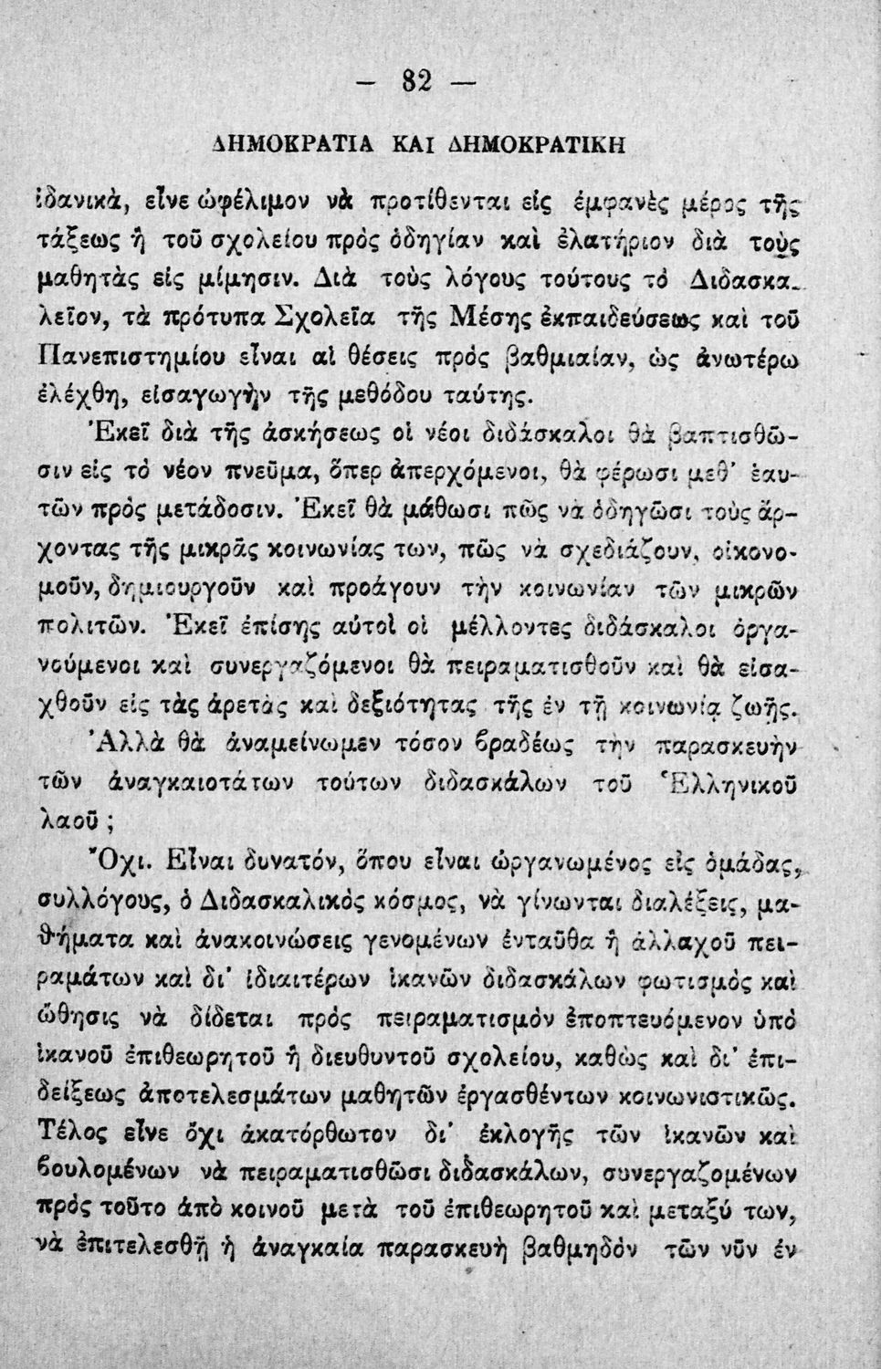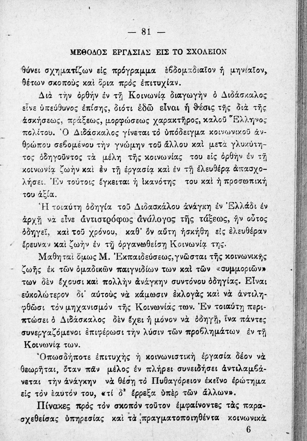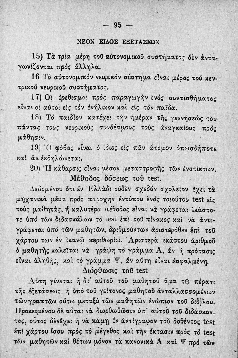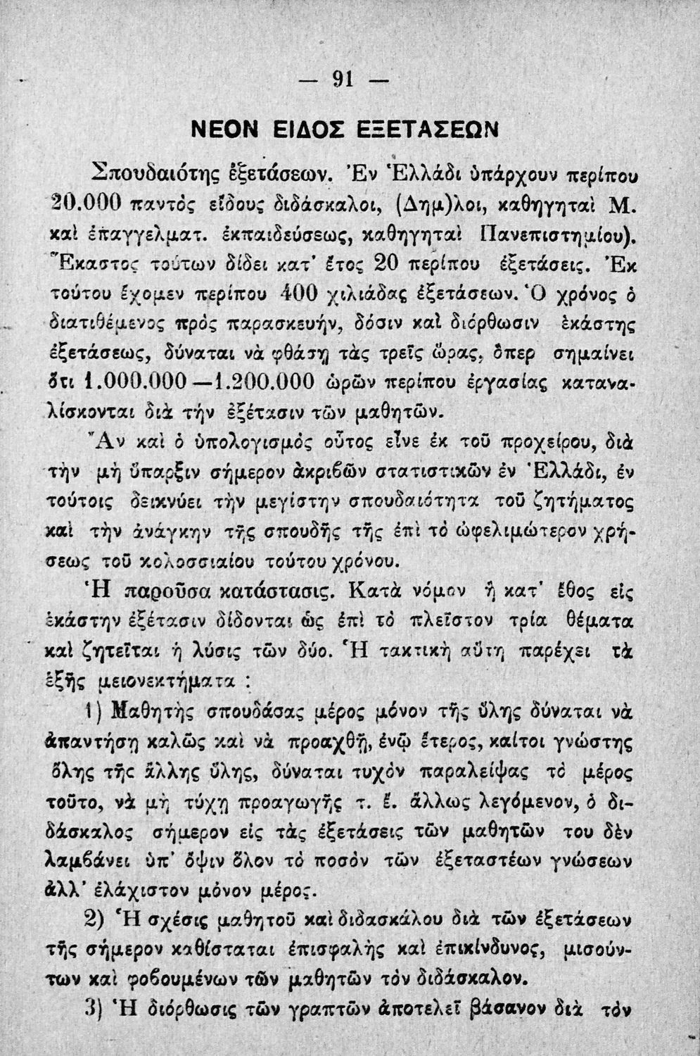 Παιδαγωγικό βοήθημα που αναφέρεται στη δημοκρατική μέθοδο εργασίας στο σχολείο, στο νέο είδος εξετάσεων, στις μετρήσεις και στατιστικές μεθόδους καθώς και στις πνευματικές και παιδευτικές μετρήσεις των Ελληνόπουλων. Ο συγγραφέας ήταν Επιμελητής της Πειραματικής Παιδαγωγικής του Πανεπιστημίου Αθηνών.